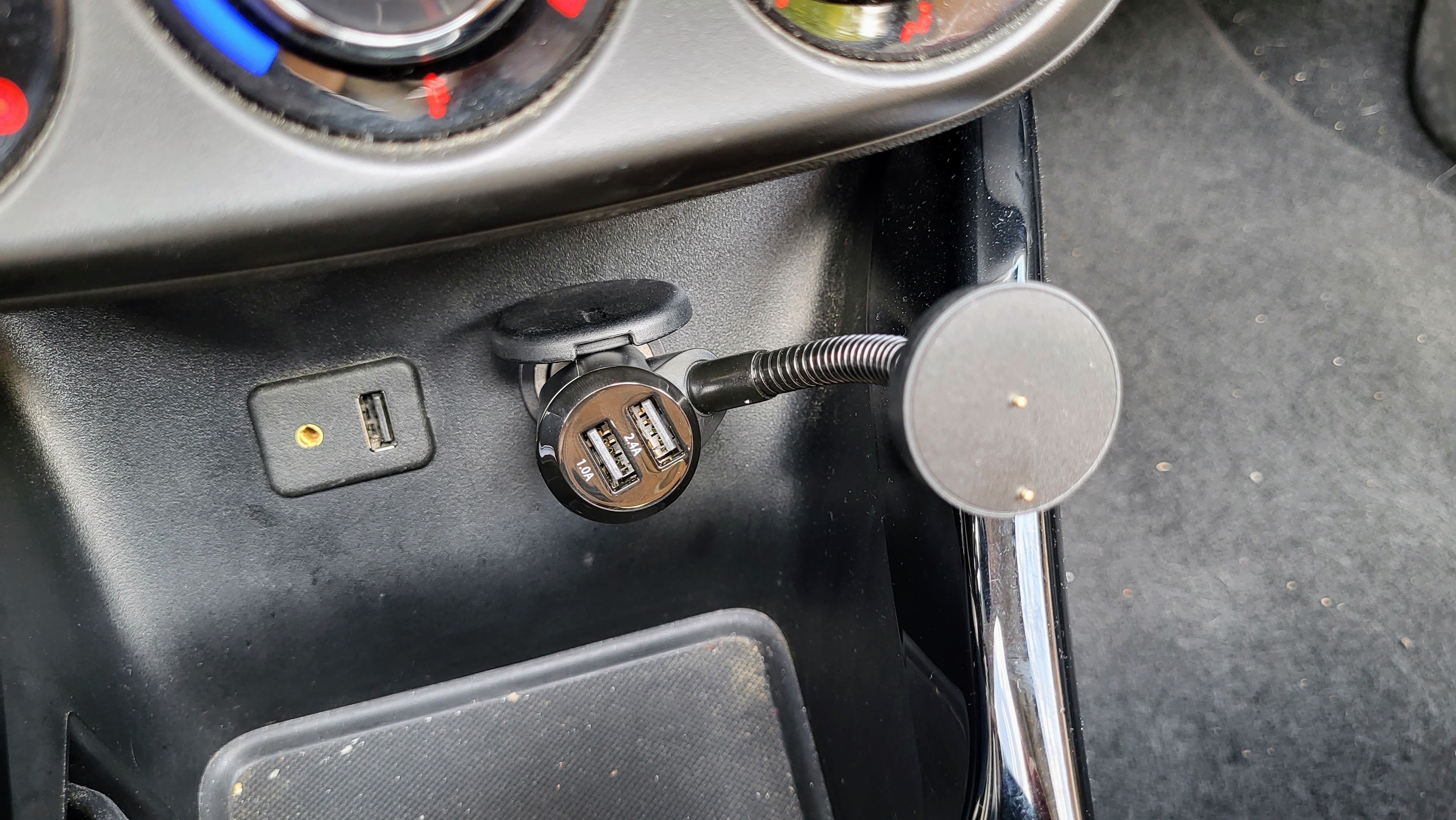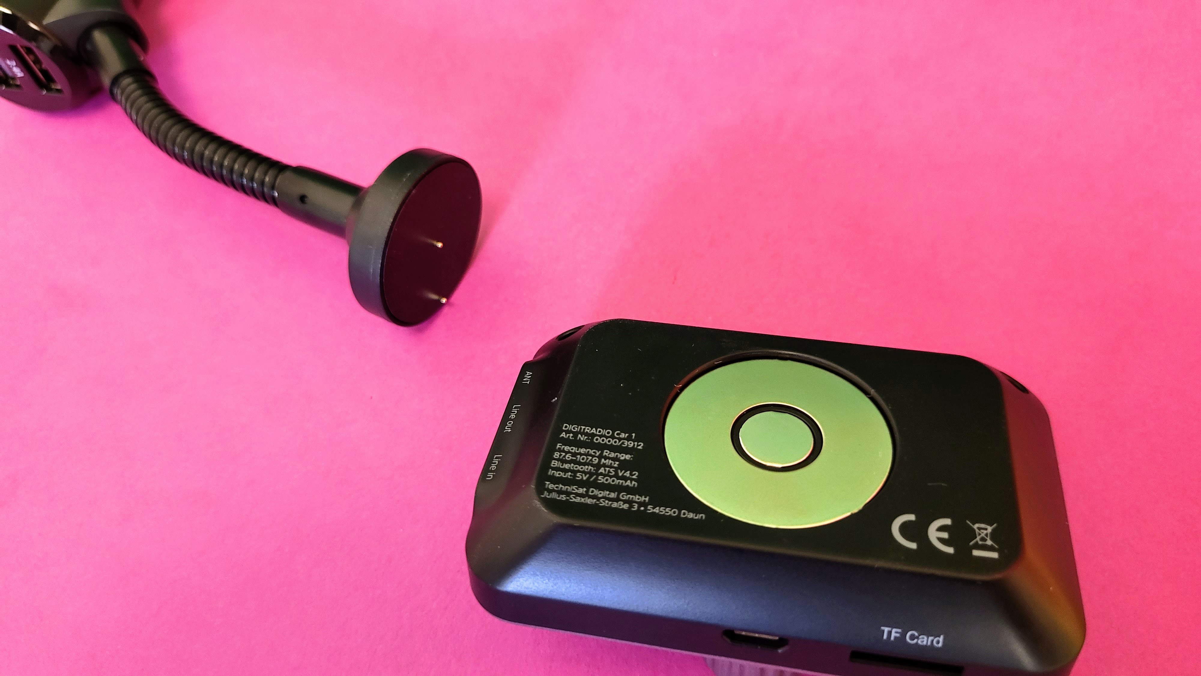 Alternativ nutzt man eine Halterung mit flexiblem Arm, die man direkt in die 12-Volt-Buchse vom Auto steckt. An beiden Halterungen haftet der DAB-Empfänger magnetisch. Die Lösung direkt für den Zigarettenanzünder im Auto hat den Vorteil, dass das Gerät nicht störend auf den Armaturen Platz finden muss. Allerdings ist diese Halterung nicht für jedes Auto zu empfehlen. Bei unserem Opel Adam war der Empfänger sehr weit unten und nur schwer zu erreichen.