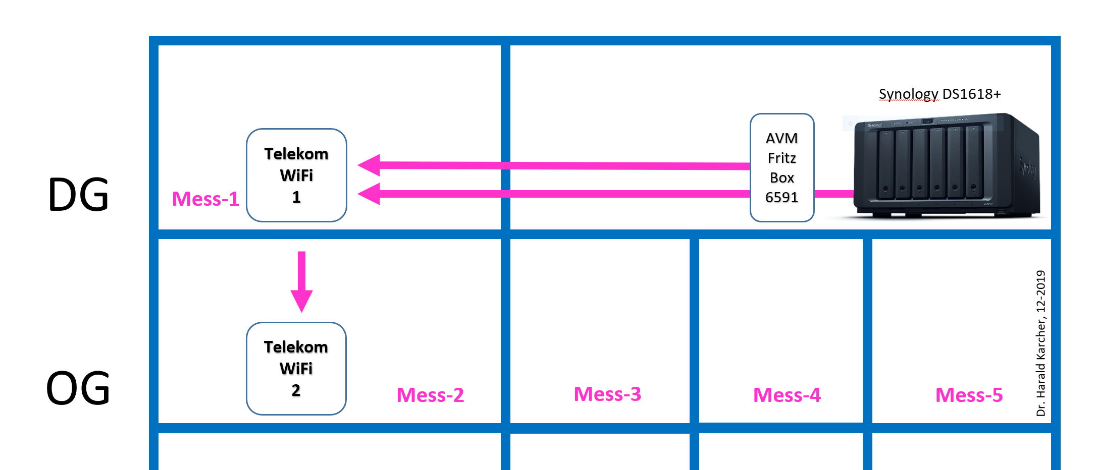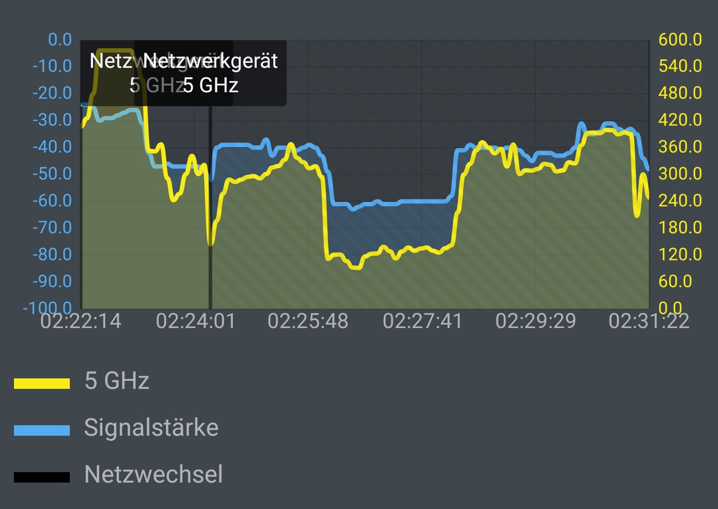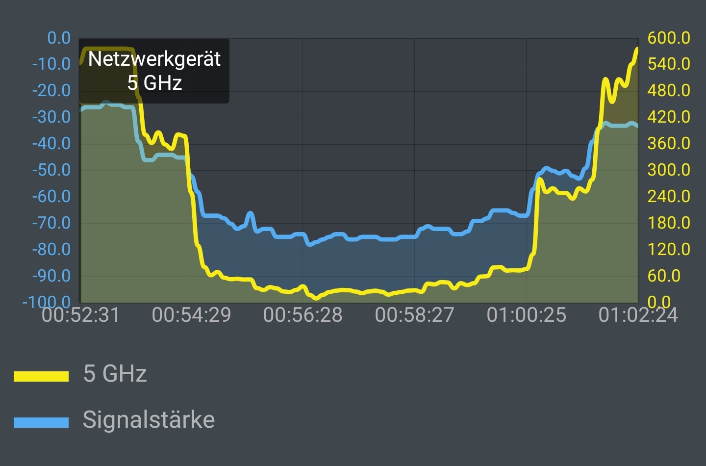 Zweite Messung: Die Fritz App WLAN von AVM kann den lokalen Durchsatz zwischen einer WLAN-Station und einem Smartphone samt Netzwechsel zwischen WLAN-Handy, WLAN-Bändern und WLAN-Stationen sehr schön in eine Grafik zeichnen. Bei den folgenden Messkurven wandern wir mit dem Samsung Note10+ zuerst über die Messpunkte 1-2-3-4-5 vom DG ins OG hinunter. Danach über die Punkte 5-4-3-2-1 wieder bis zum Telekom-Router ins Dach zurück.