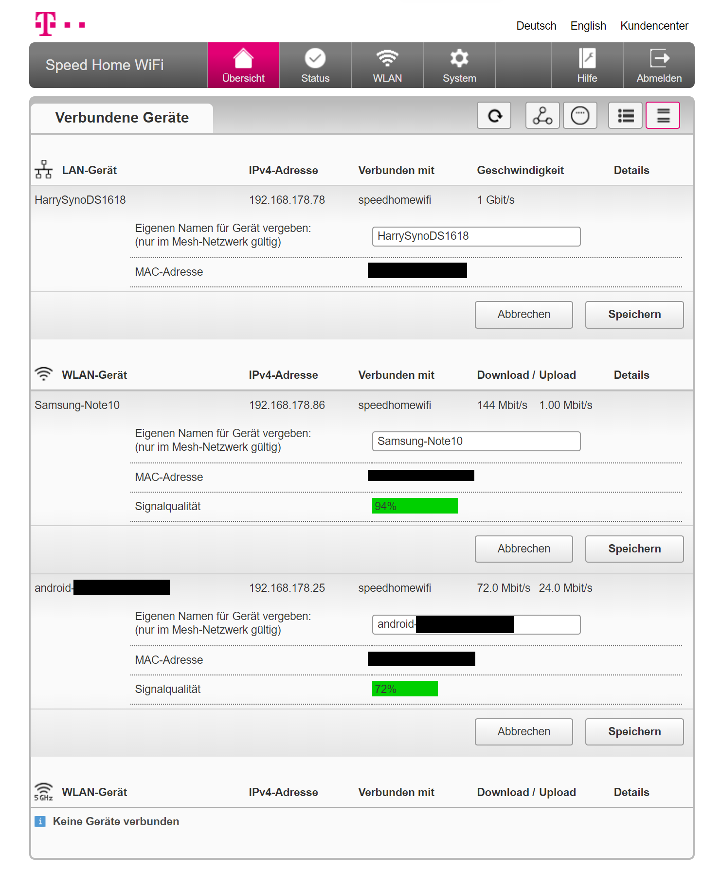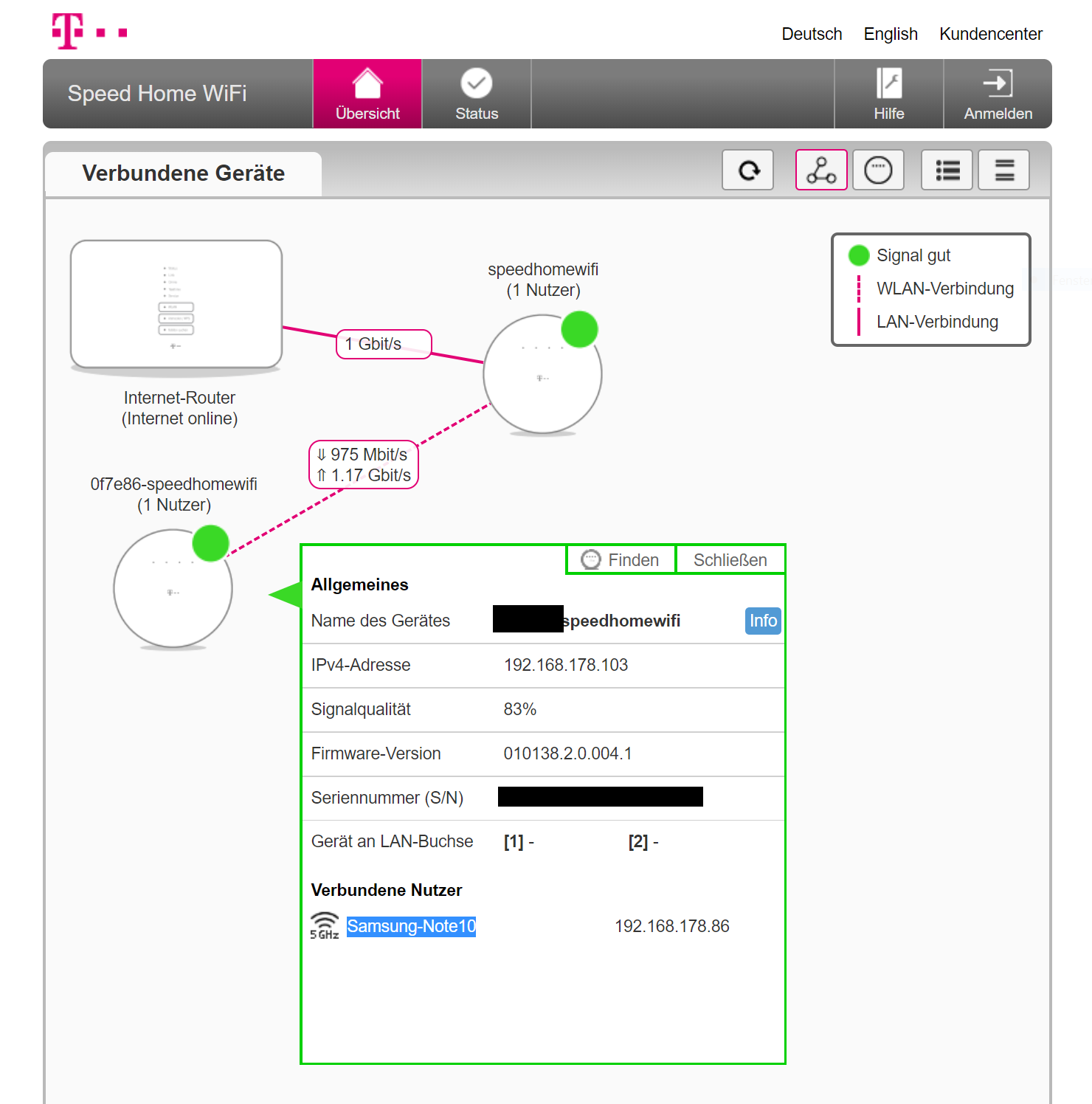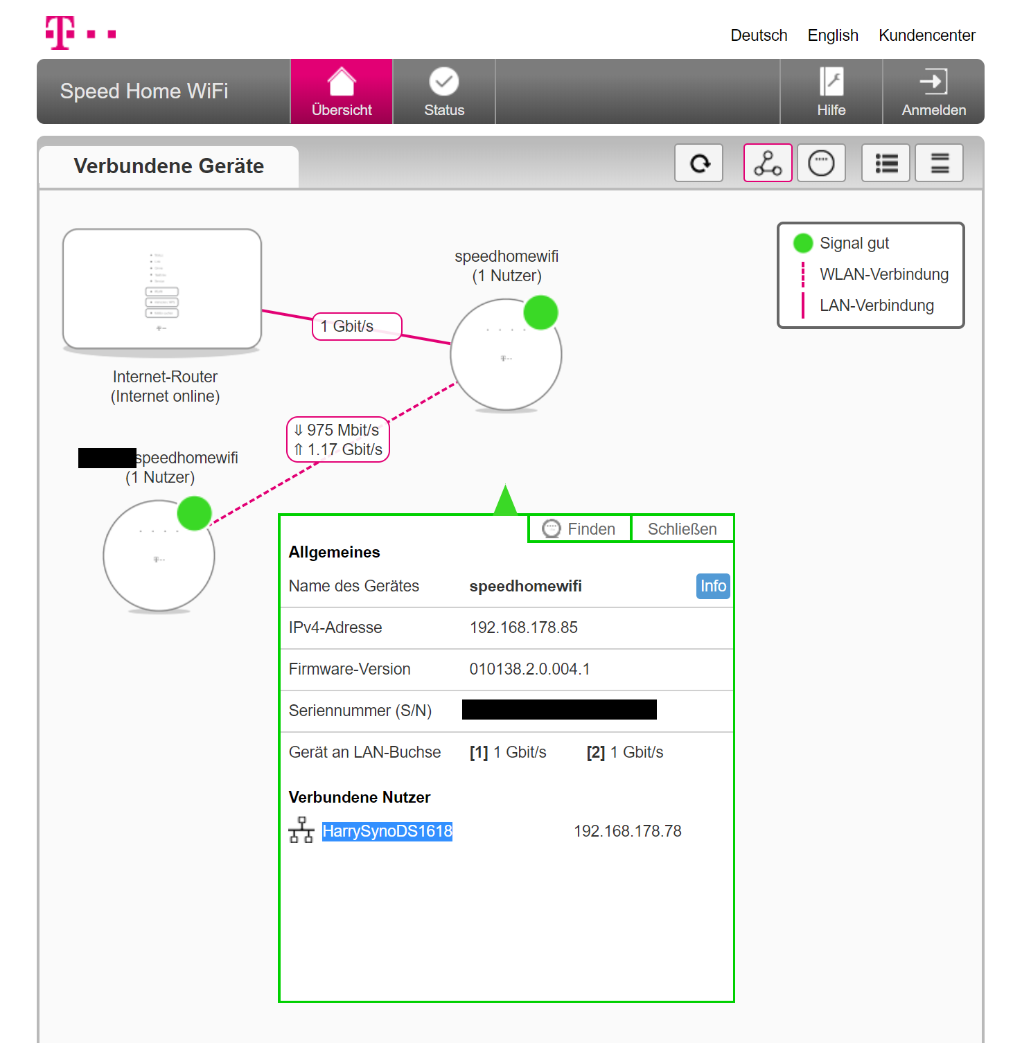 Im Test hing der erste Speed Home WiFi hinter einer AVM Fritzbox 6591 Cable, die dem Mesh-System das Internet aus einem Kabel-500-Anschluss in den 1-Gigabit-WAN-Port zuspielt. Eine Etage tiefer stand der Telekom Mesh Satellit. Am zweiten LAN-Port des ersten Telekom-Rundlings hing eine Synology DS1618+.