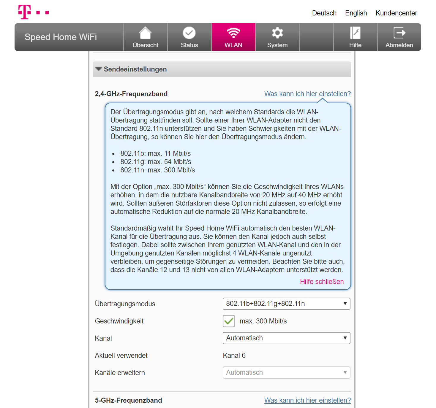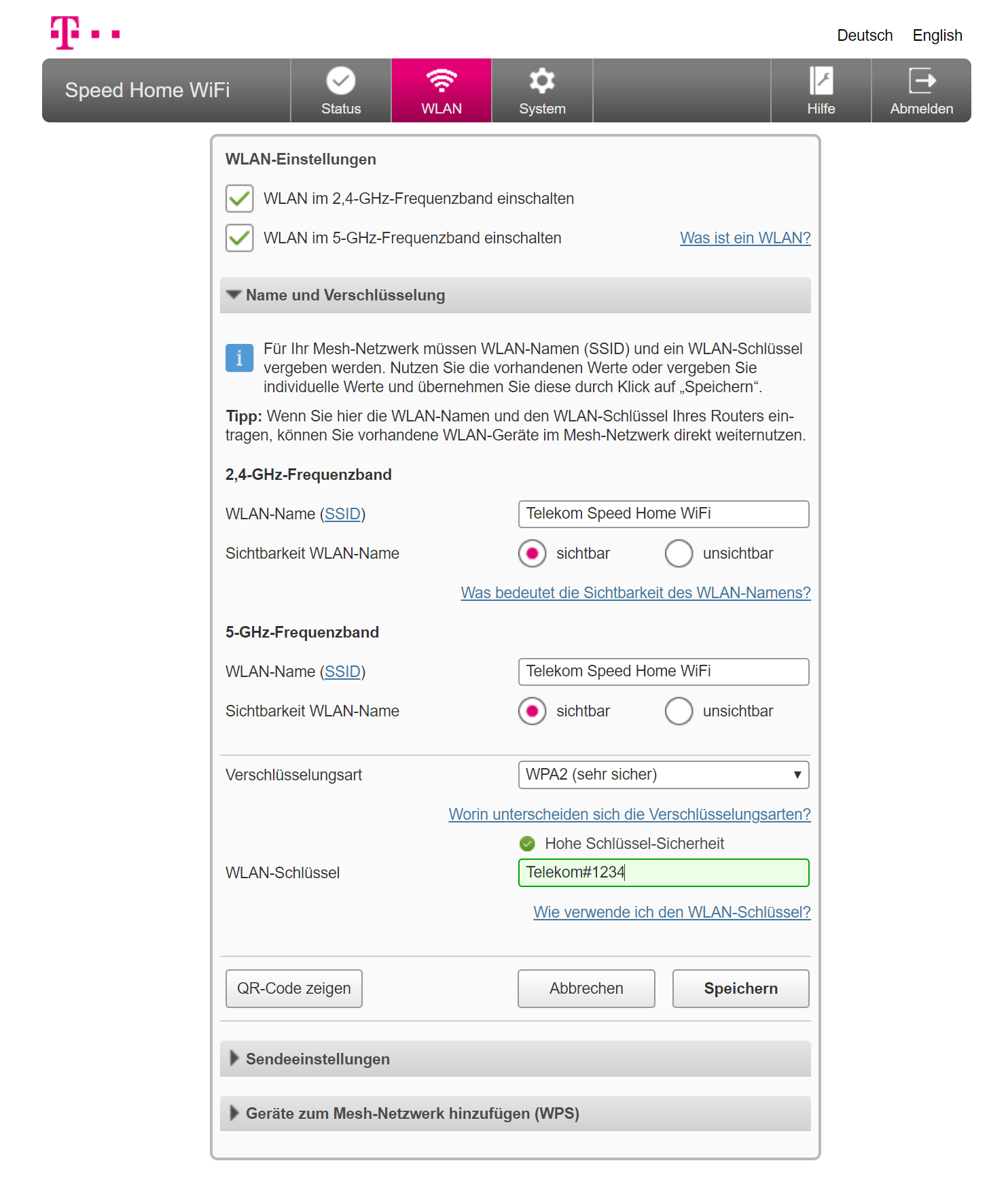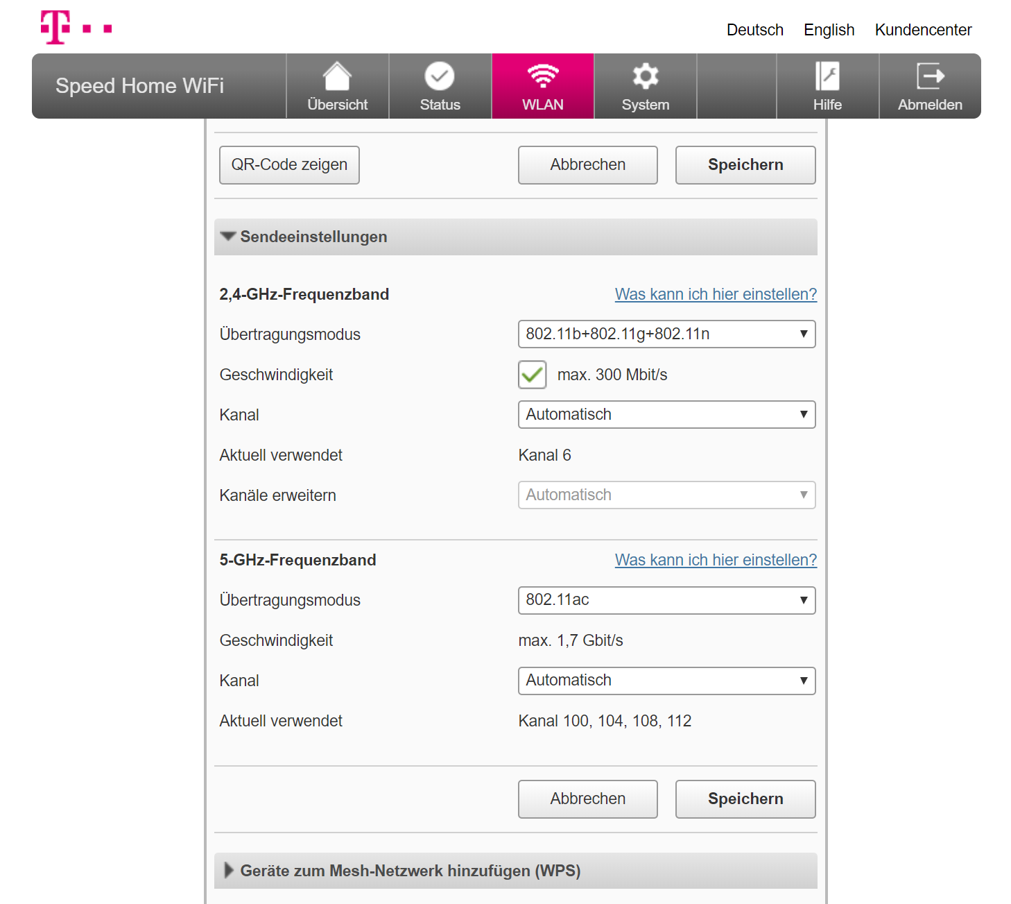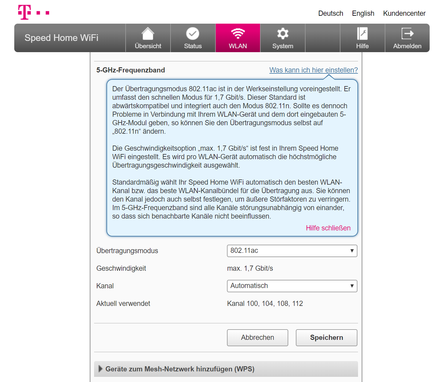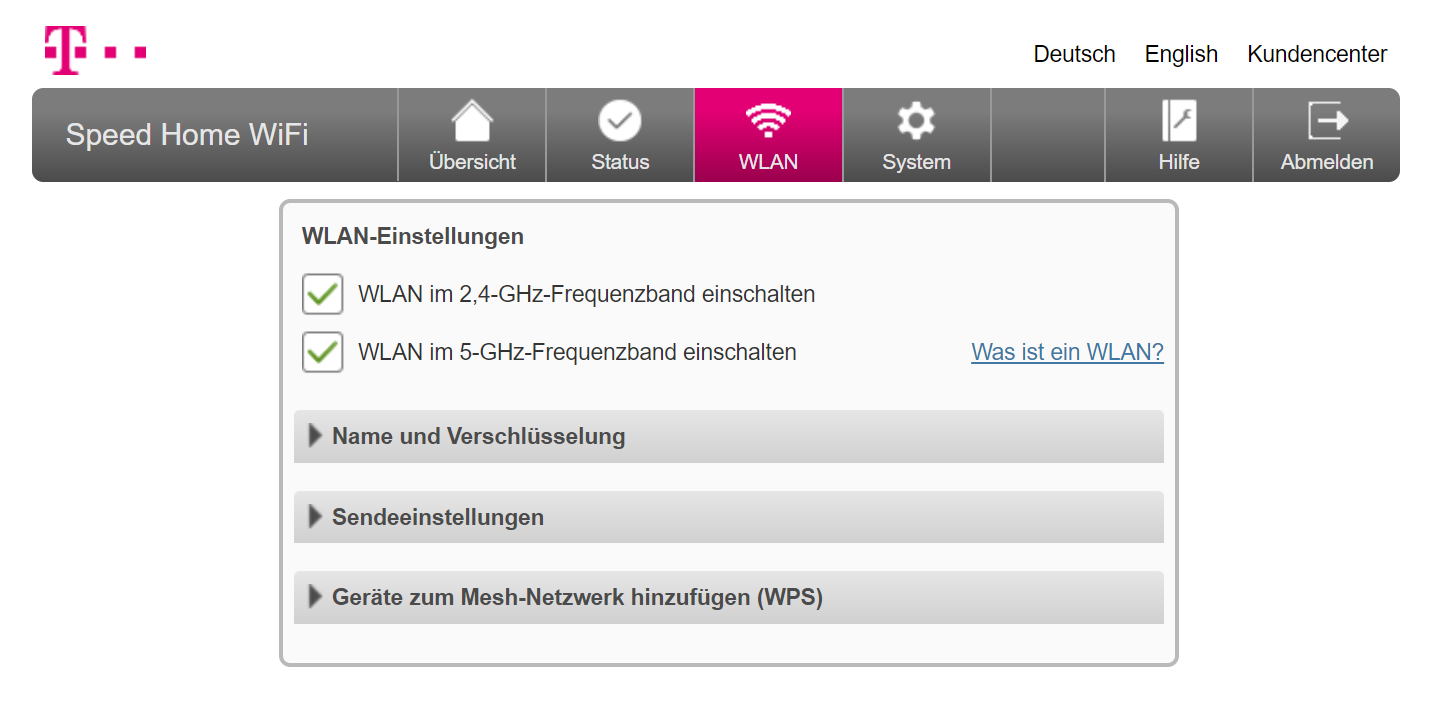 Neben der Konfiguration per Telekom-App lassen sich die Mesh-Funker altmodisch per PC und Browser konfigurieren. Das hat im Test gut funktioniert. In den WLAN-Einstellungen erfuhren wir, dass die Telekom-Rundlinge ab Werk bei 2,4 GHz bis zu 300 Mbps und bei 5 GHz bis zu 1,7 Gbps Brutto funken. Zudem wurden schöne Erklärungen zu Kürzeln wie SSID und WPA2 eingeblendet.