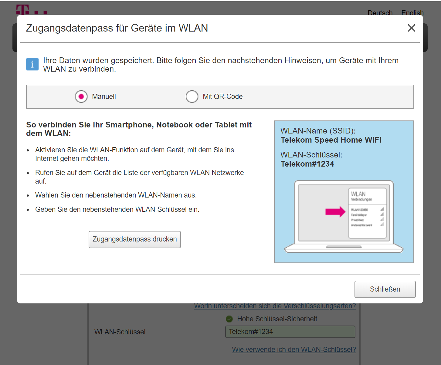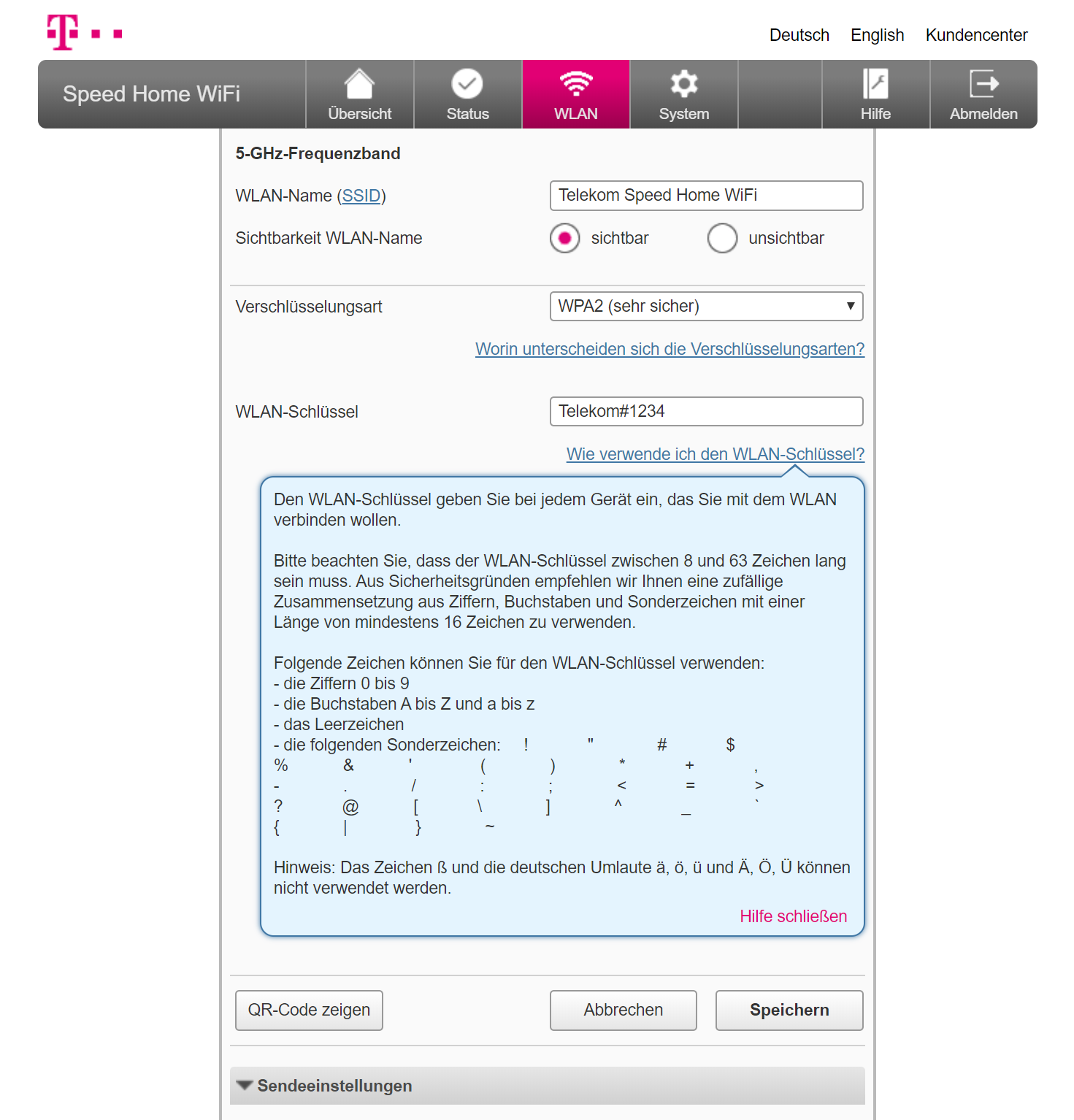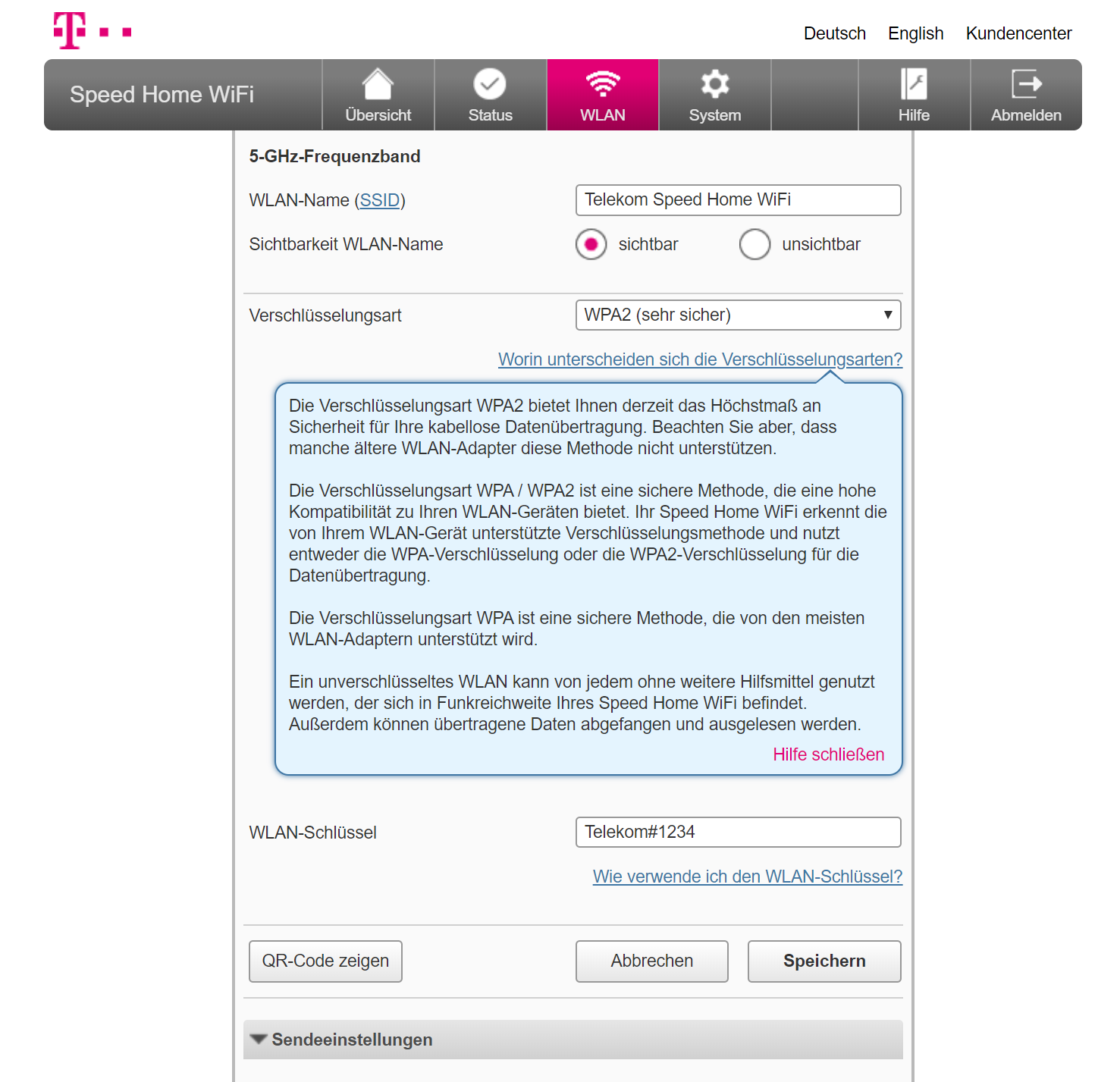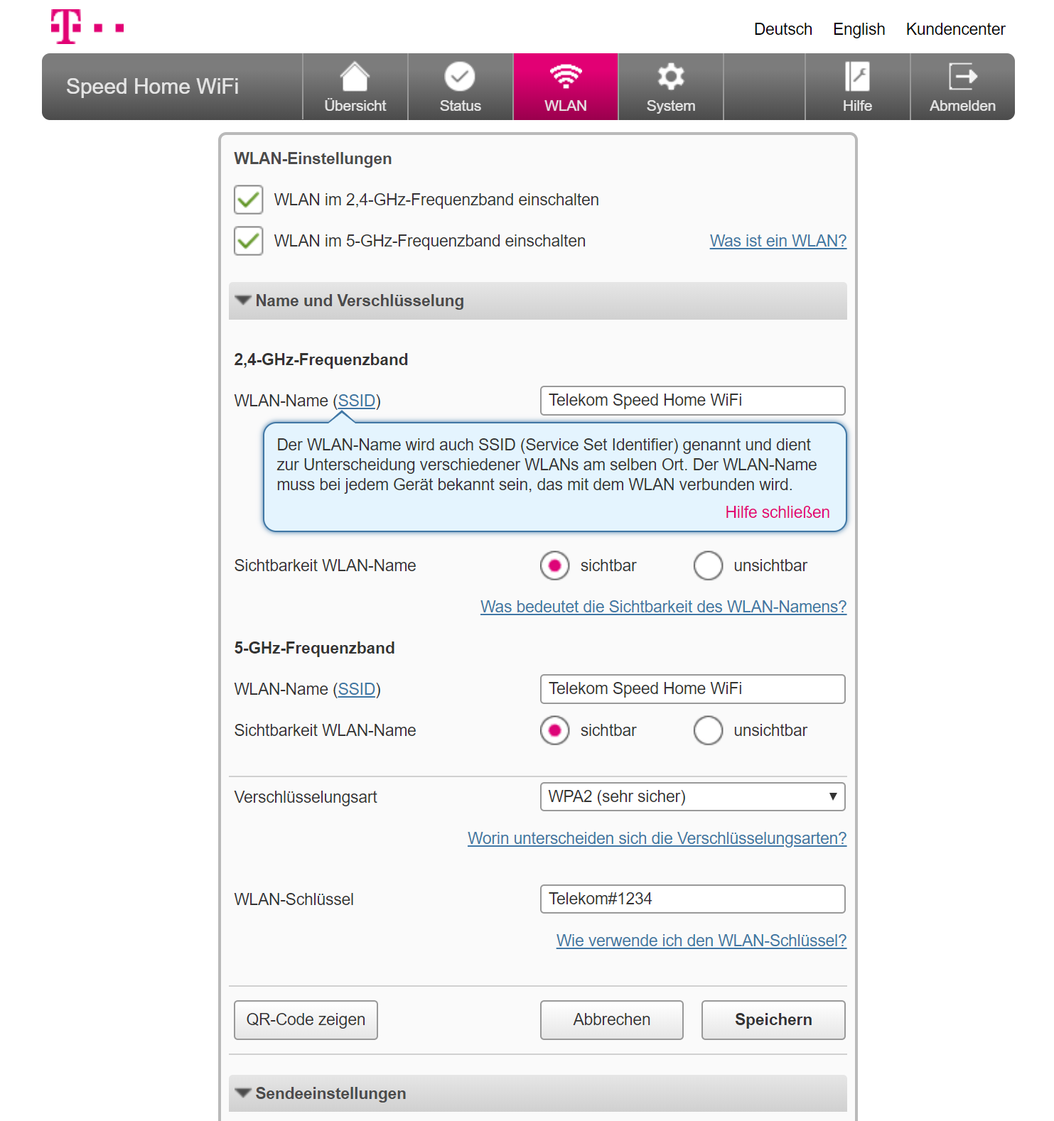 Neben der Konfiguration per Telekom-App lassen sich die Mesh-Funker altmodisch per PC und Browser konfigurieren. Das hat im Test gut funktioniert. In den WLAN-Einstellungen erfuhren wir, dass die Telekom-Rundlinge ab Werk bei 2,4 GHz bis zu 300 Mbps und bei 5 GHz bis zu 1,7 Gbps Brutto funken. Zudem wurden schöne Erklärungen zu Kürzeln wie SSID und WPA2 eingeblendet.
