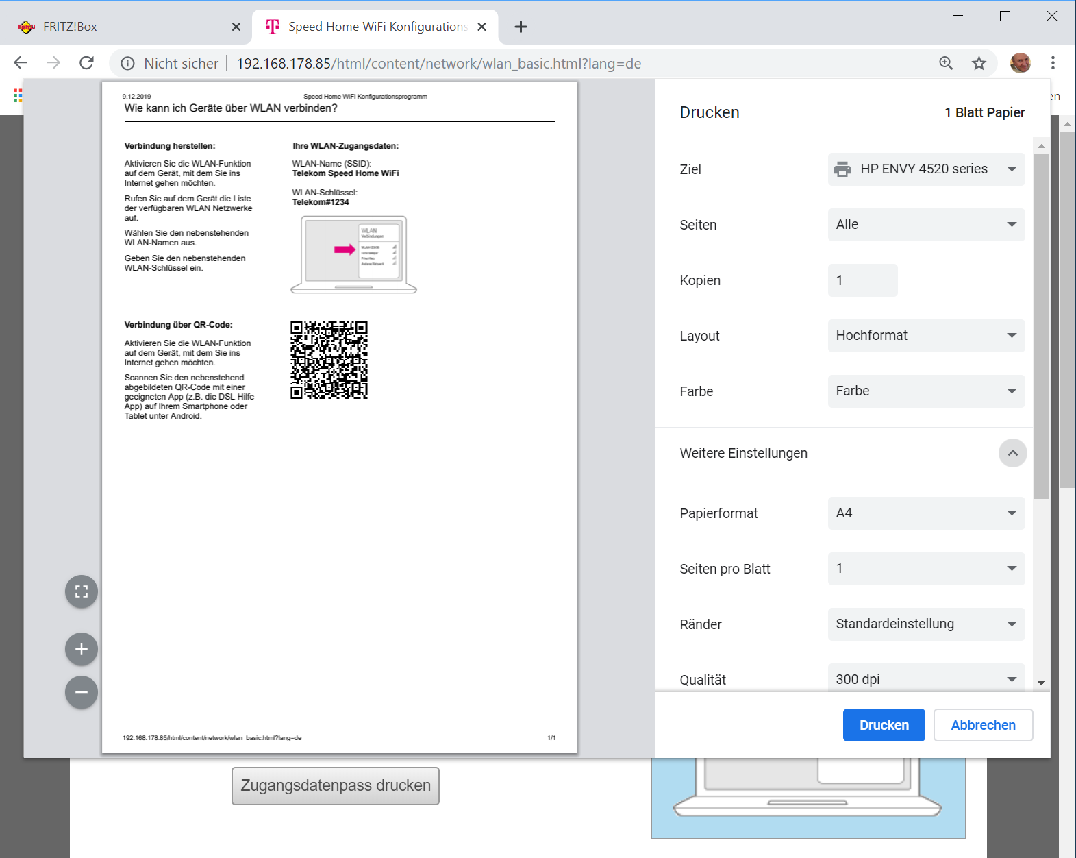 Auch an der Rückseite sind die Telekom Speed Home Funker gut ausgestattet: Power-Eingang, Ein/Aus-Taster, zwei LAN/WAN-Ports und eine kleine Reset-Öffnung. Darüber ein Schildchen mit allen Zugangsdaten, die man beim Setup der Basisstation in den PC-Browser eintippt.