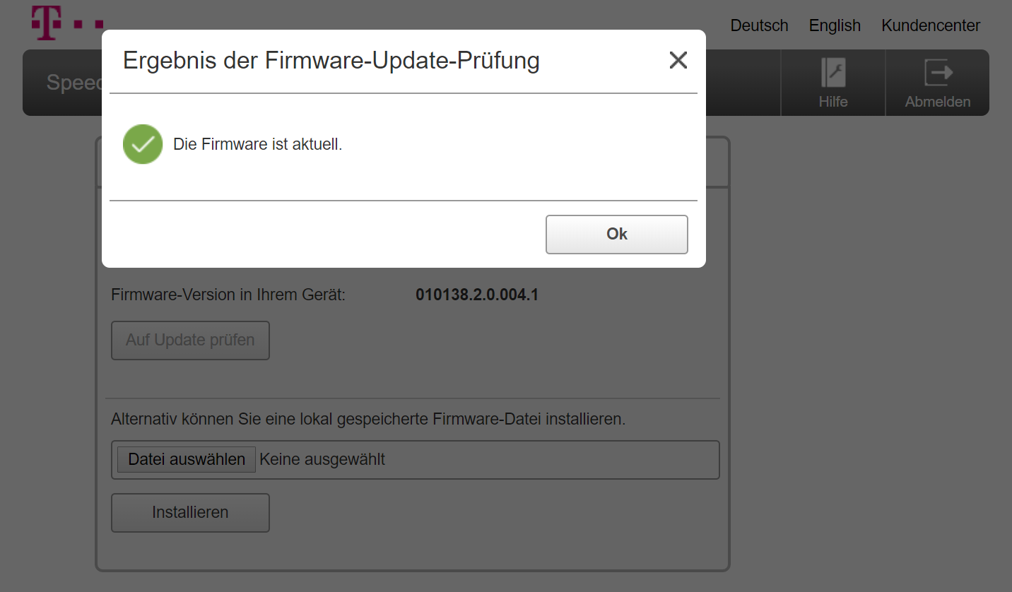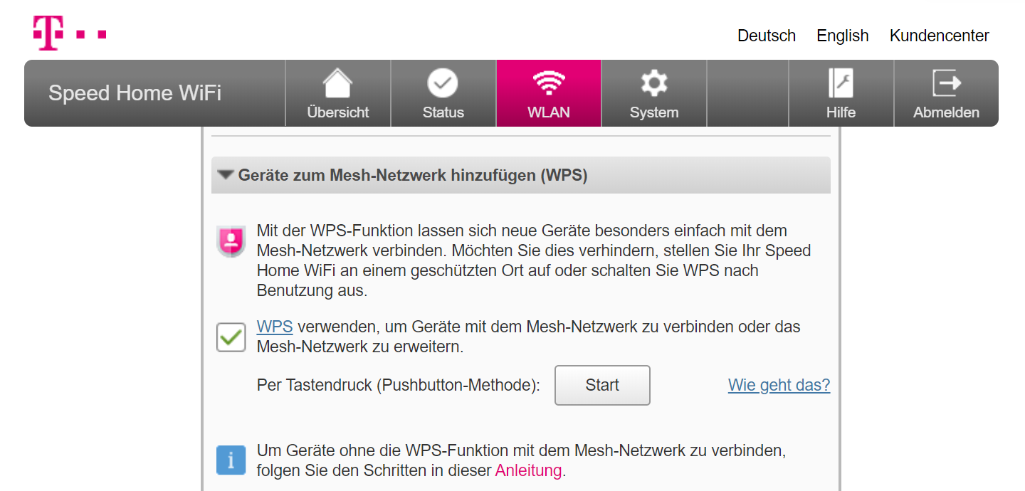 Den ersten Telekom-Funker haben wir per LAN-Kabel mit einer AVM Fritzbox 6591 Cable verbunden. So bekommt er schnelles Kabel-500-Internet und konnte gleich mal das jüngste Firmware-Update einspielen. Den zweiten Mesh-Point koppelten wir elegant durch einen kurzen Druck auf die WPS-Taster der beiden Telekom-Funker. Kurz darauf haben am ersten Telekom Mesh Funker drei grüne LED-Lämpchen namens Status, Signal und Mesh geleuchtet. Beim zweiten Telekom-Funker hat nach geglückter Koppelung zusätzlich das vierte Lämpchen namens Repeater grün gestrahlt.