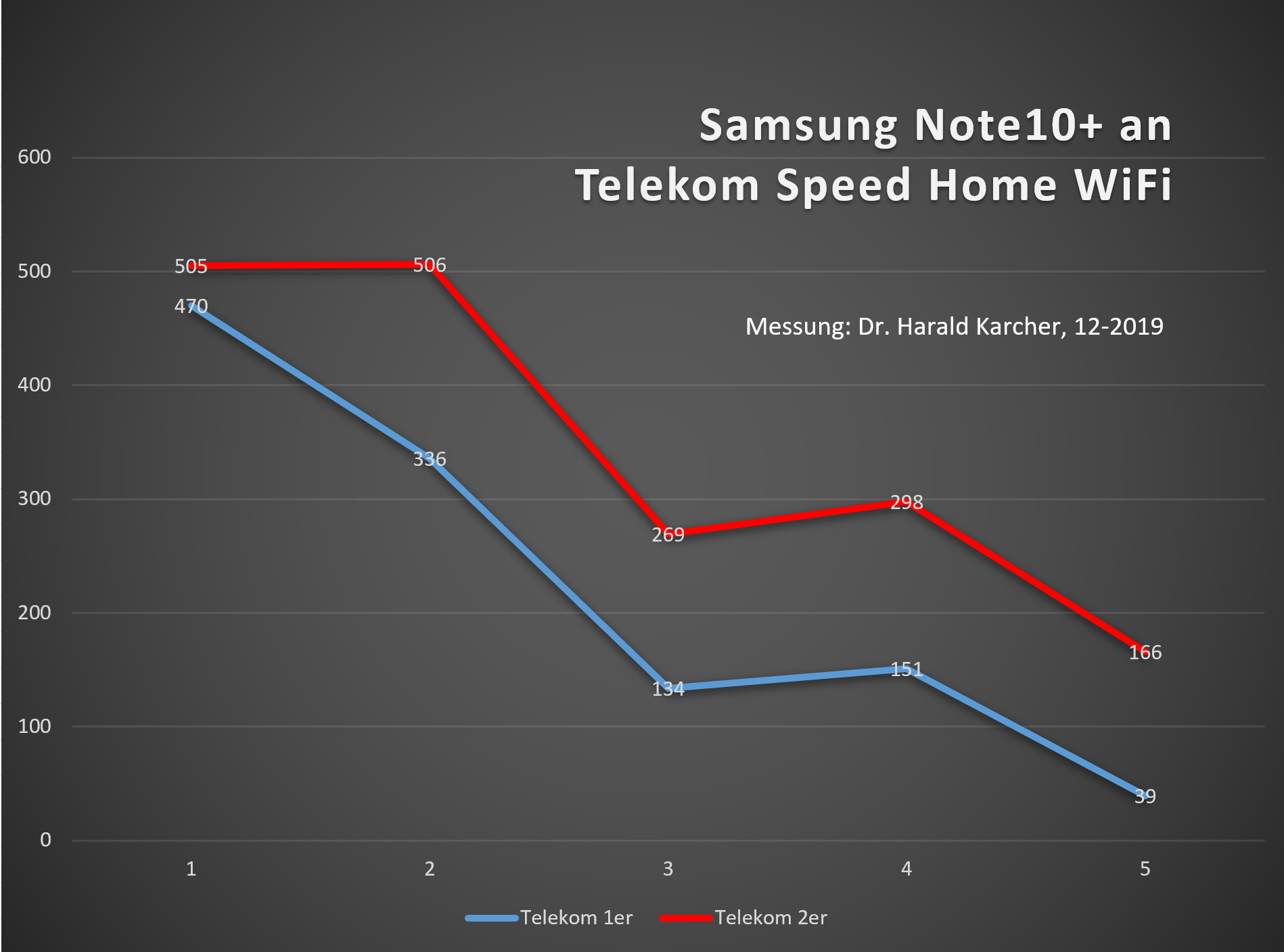 Erste Messung: Das Samsung Galaxy Note10+ (Testbericht) gehört aktuell zu den schnellsten Wifi-6-Handys. Es bringt aber auch bei Wifi-5 und Wifi-4 sehr gute Leistungen. Damit sind wir Internet-surfend durch alle fünf Messpunkte der Testwohnung gewandert. Der erste Telekom Mesh Point allein konnte die Testwohnung schon recht gut versorgen. Nur im hintersten Zimmer, bei Messpunkt 5, fiel der Durchsatz aus dem Internet auf 39 Mbps Netto herunter. Der zweite Telekom-Funker brachte eine deutliche Verbesserung. Im hintersten Zimmer kamen dank Telekom-Pärchen immerhin 166 Mbps an. Weiter vorne entsprechend mehr.