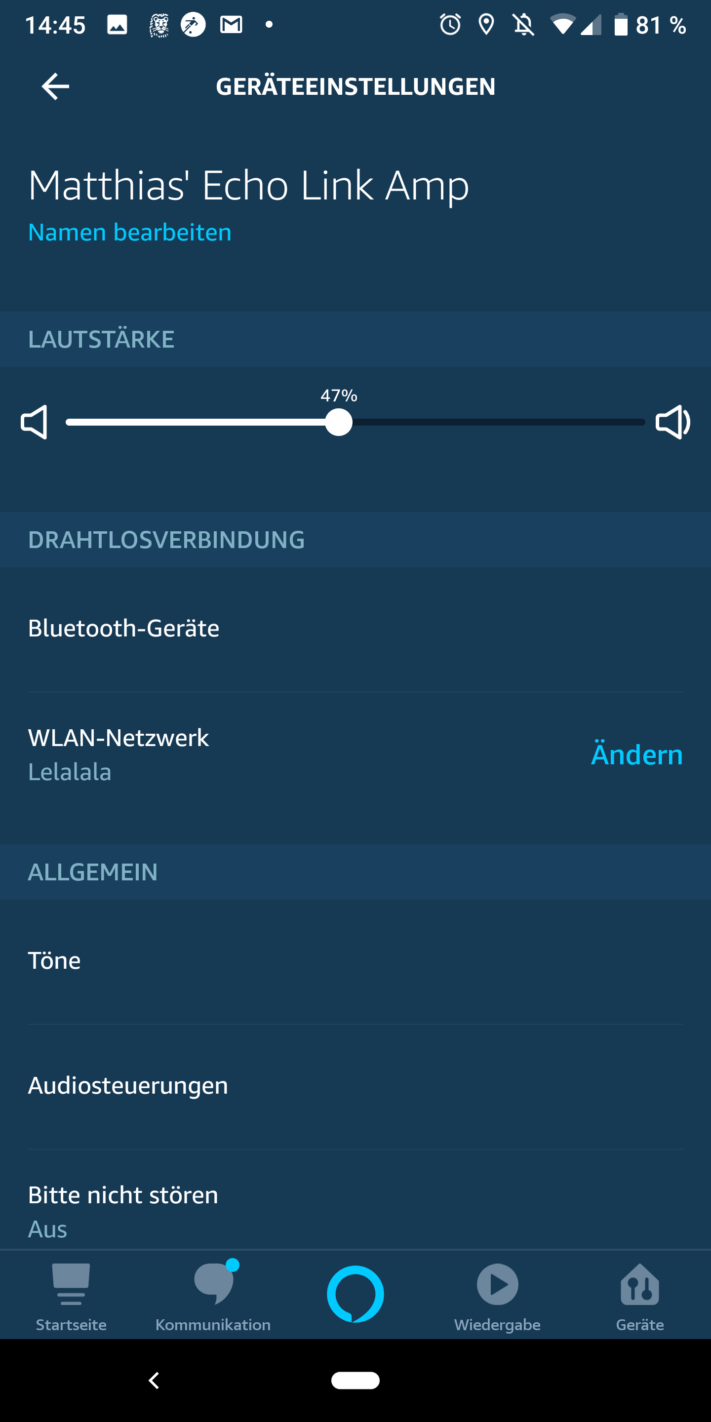 Die Sprachsteuerung des Echo Link Amp ist umständlich. Ein Echo Dot, der per Klinkenkabel an der Anlage hängt, macht alles viel einfacher. Denn klassisch per Klinkenkabel spielt die damit verbundene Anlage stoisch alles ab, was der Dot wiedergibt – auch Sprachausgabe der Assistentin selbst. Sind die Passiv- oder Aktivlautsprecher beziehungsweise die HiFi-Anlage über Echo Link Amp eingebunden, muss der Nutzer zusätzlich den (zumindest frei wählbaren) Gerätenamen nennen, also „Alexa, spiele Eminem auf Echo Link Amp“. Das gleiche gilt für das Stoppen der Wiedergabe und die Lautstärkeregelung. Vergisst man diesen Zusatz, fängt der Echo Dot, oder welchen Echo man auch immer anspricht, an zu dudeln. Das verwirrt auch insofern, dass wir in der App innerhalb einer Gruppe einem Echo-Gerät einen bevorzugten Lautsprecher zuweisen können. Genützt hat das jedoch auch nichts.