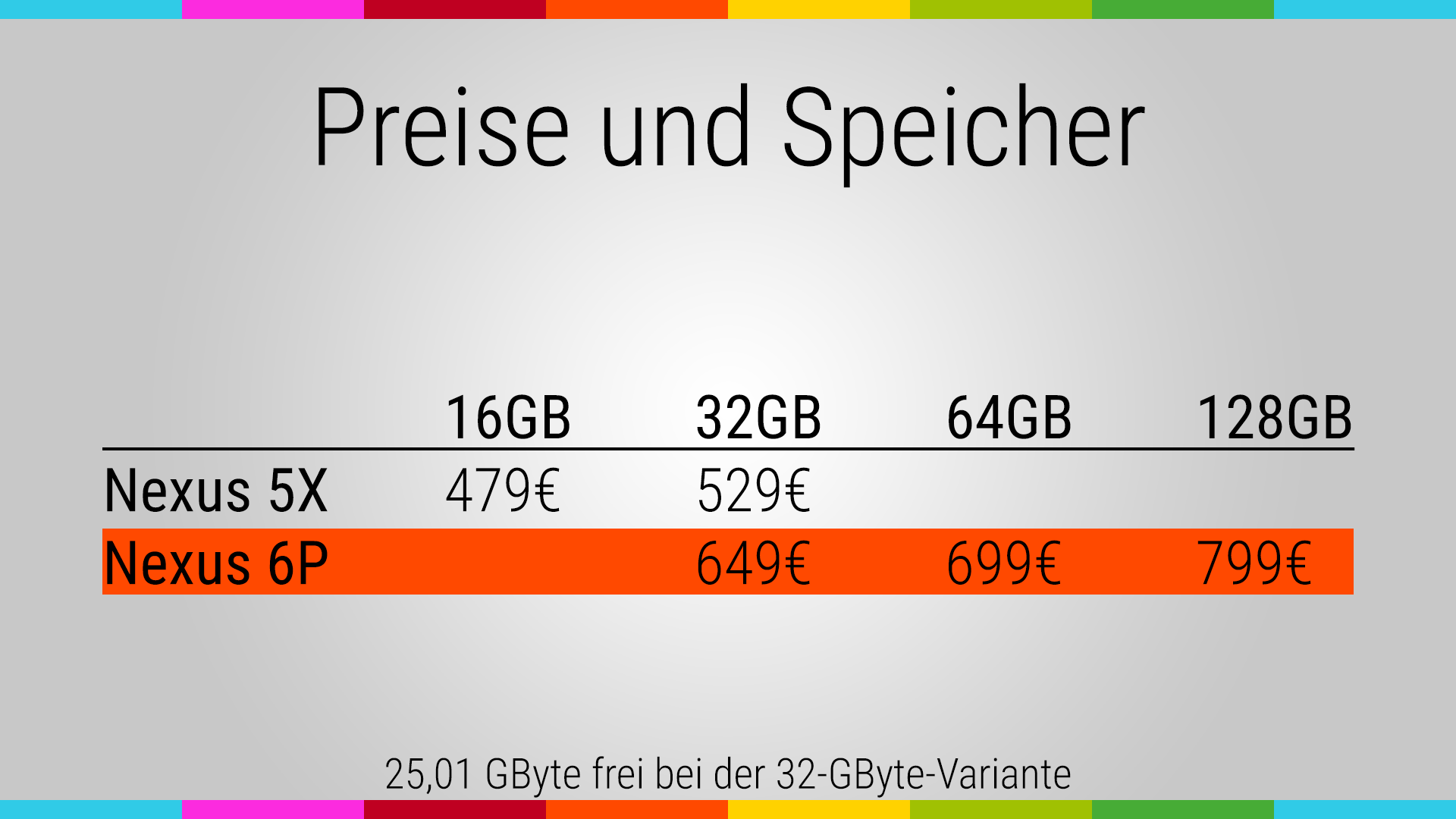 Das Nexus 6P wird von Google in drei unterschiedlichen Speichergrößen angeboten: 32, 64, und 128 GByte. Wir haben hier das kleinste von allen Modellen; nach Abzug des Betriebssystems sowie den grundlegenden Apps standen uns 25,01 GByte frei zur Verfügung. Eine Speicherkarte lässt sich nicht einsetzen. Deshalb sollte man sich vor dem Kauf gut überlegen, wie viel Platz man braucht.
