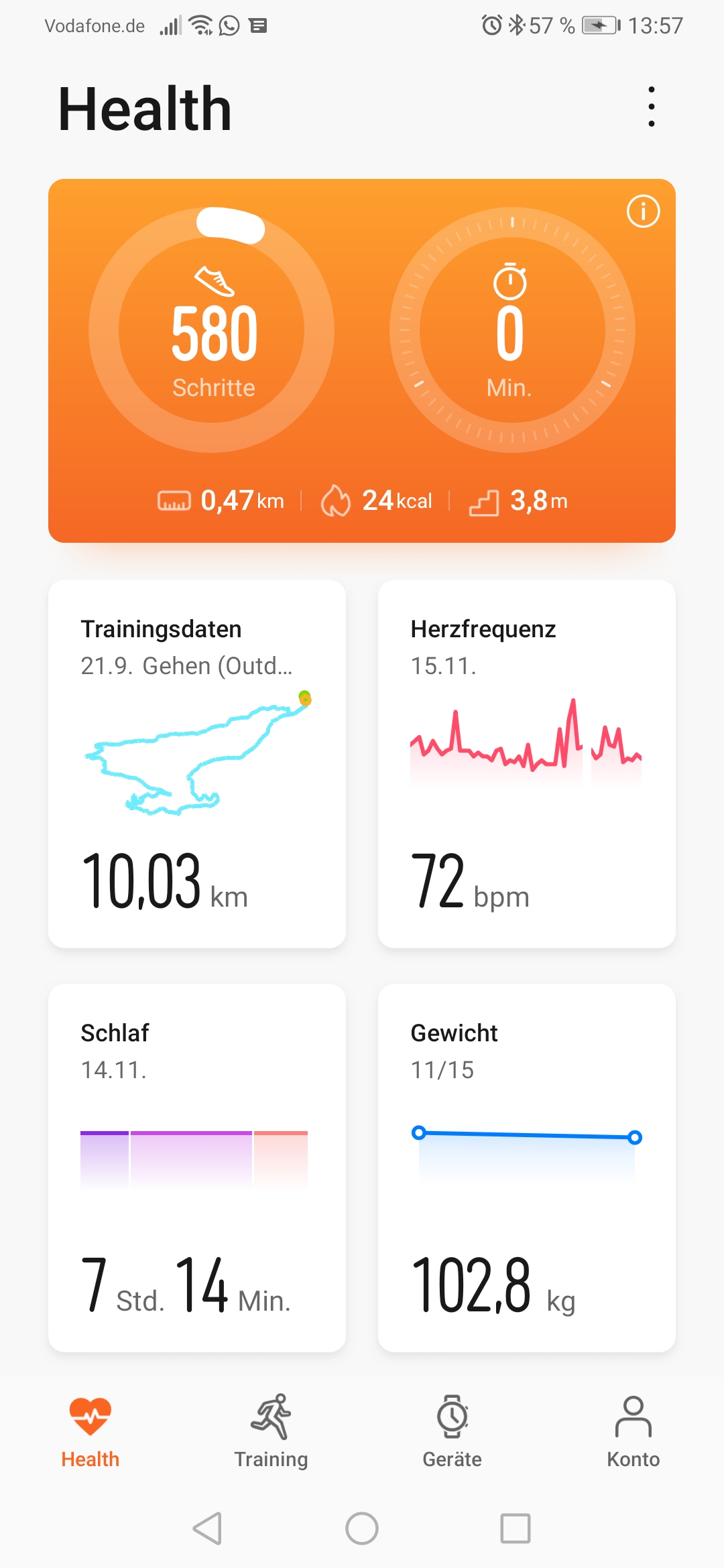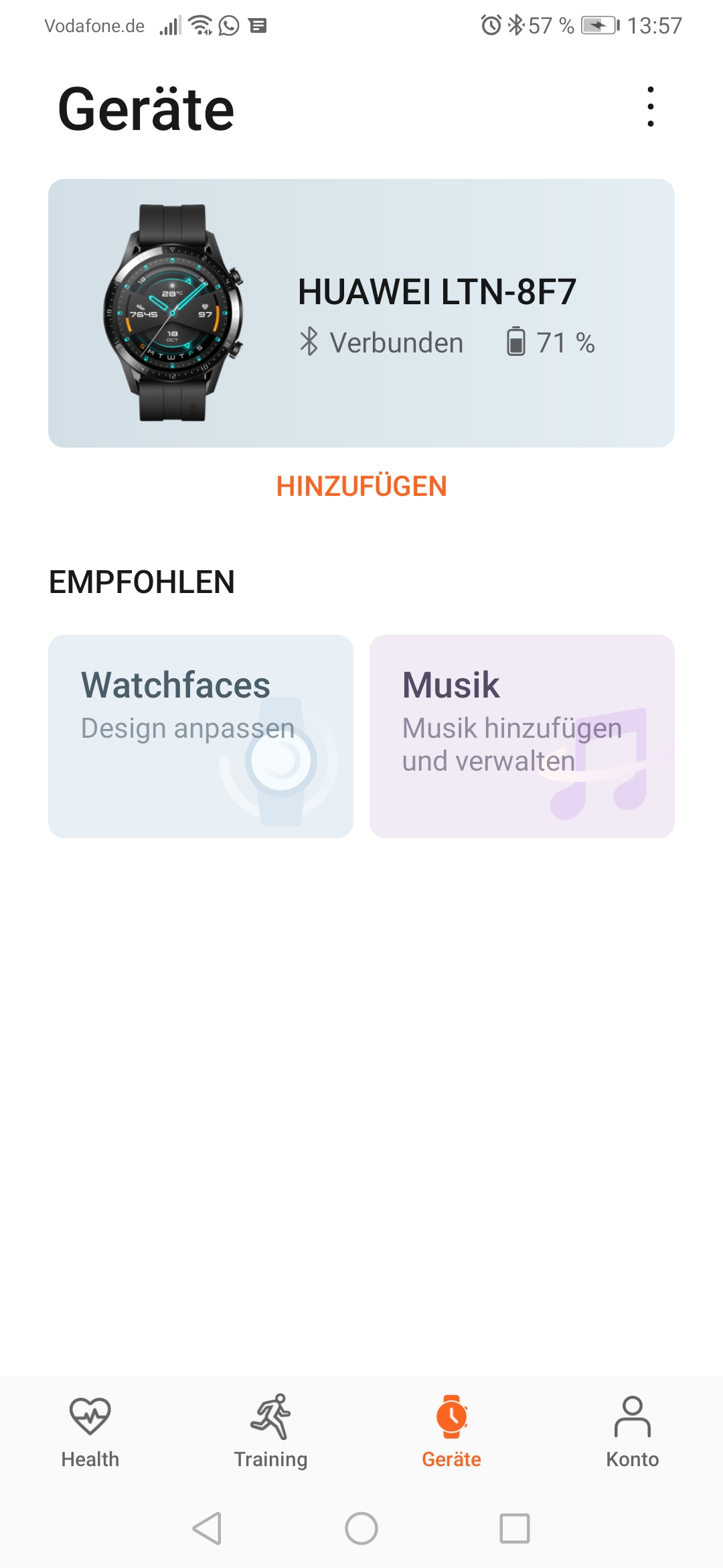 Die Health-App ist überwiegend übersichtlich aufgebaut und teilt sich in die Bereiche Health, Training, Geräte und Konto auf – entsprechende Reiter befinden sich am unteren Display-Rand. Im Health-Bereich werden grobe Übersichtsdaten zu Schritten, verbrauchten Kalorien, das letzte Training, Herzfrequenz, Schlaf und Gewicht präsentiert. Für letzteres ist die Kopplung mit einer kompatiblen Waage, etwa von Huawei, Honor oder Picooc, möglich, ansonsten dürfen die Kilos auch manuell eingetragen werden. Hinter dem Reiter Training verbergen sich detaillierte Angaben zu den letzten Trainings. Über den Reiter Geräte dürfen nicht nur verbundenen Geräte hinzugefügt oder entfernt werden, sondern hier können Nutzer auch Watchfaces anpassen und Musik auf die Huawei Watch GT 2 übertragen. Dafür stehen 2 GByte interner Speicher auf der Uhr zur Verfügung, für die Übertragung in den Uhrenspeicher sollten Nutzer sich Zeit nehmen – trotz Bluetooth 5.0 geht das sehr langsam vonstatten.