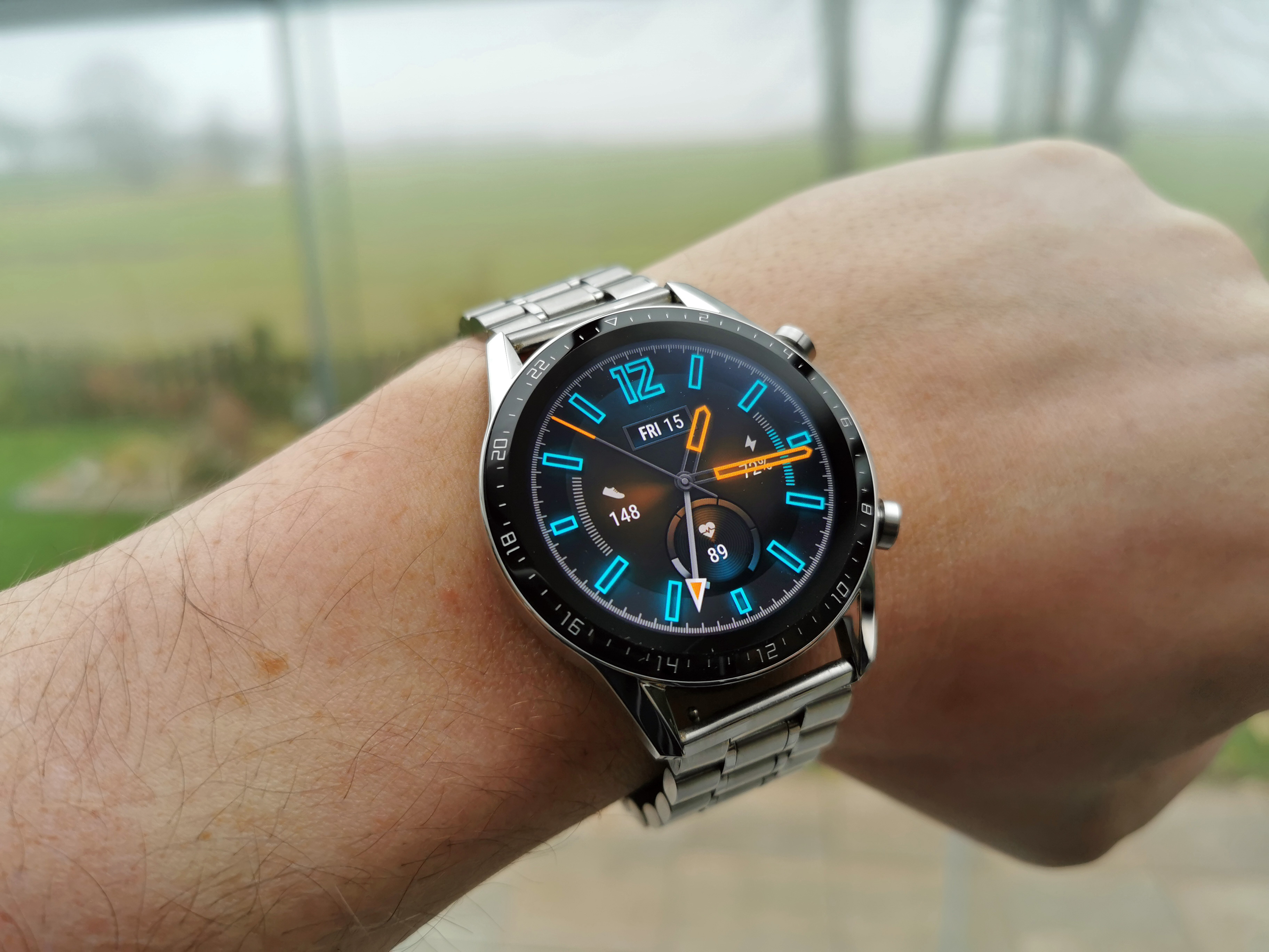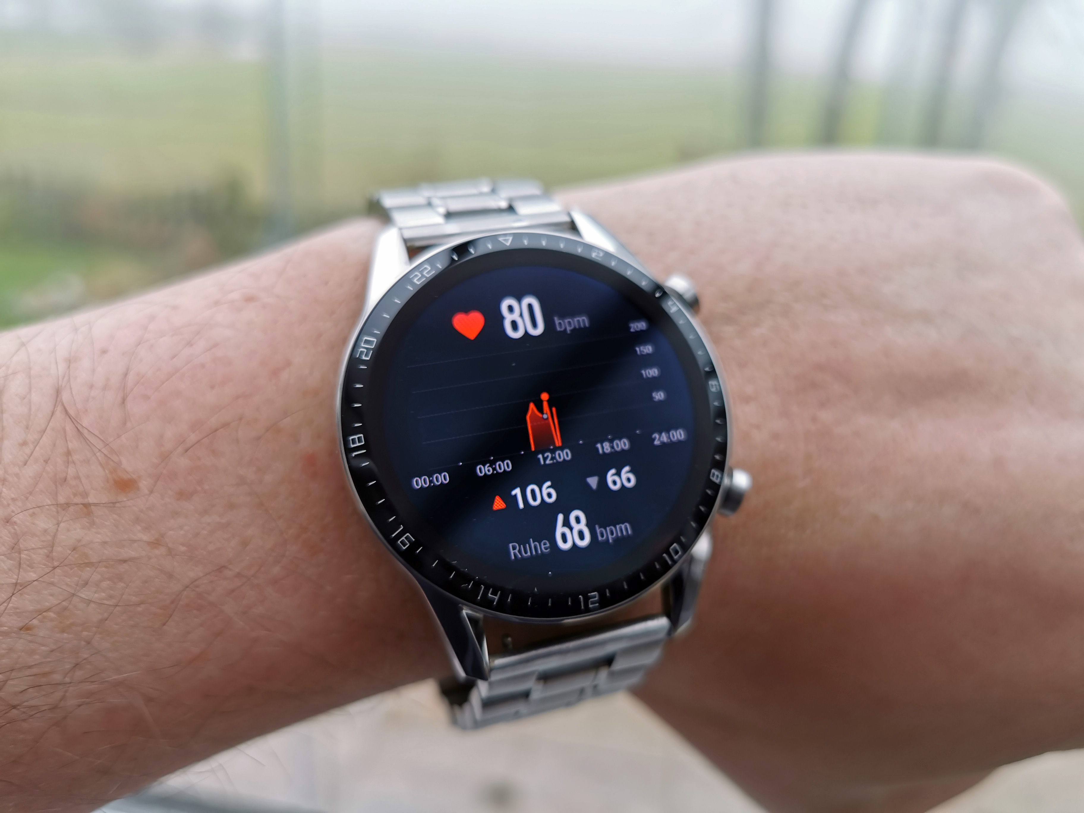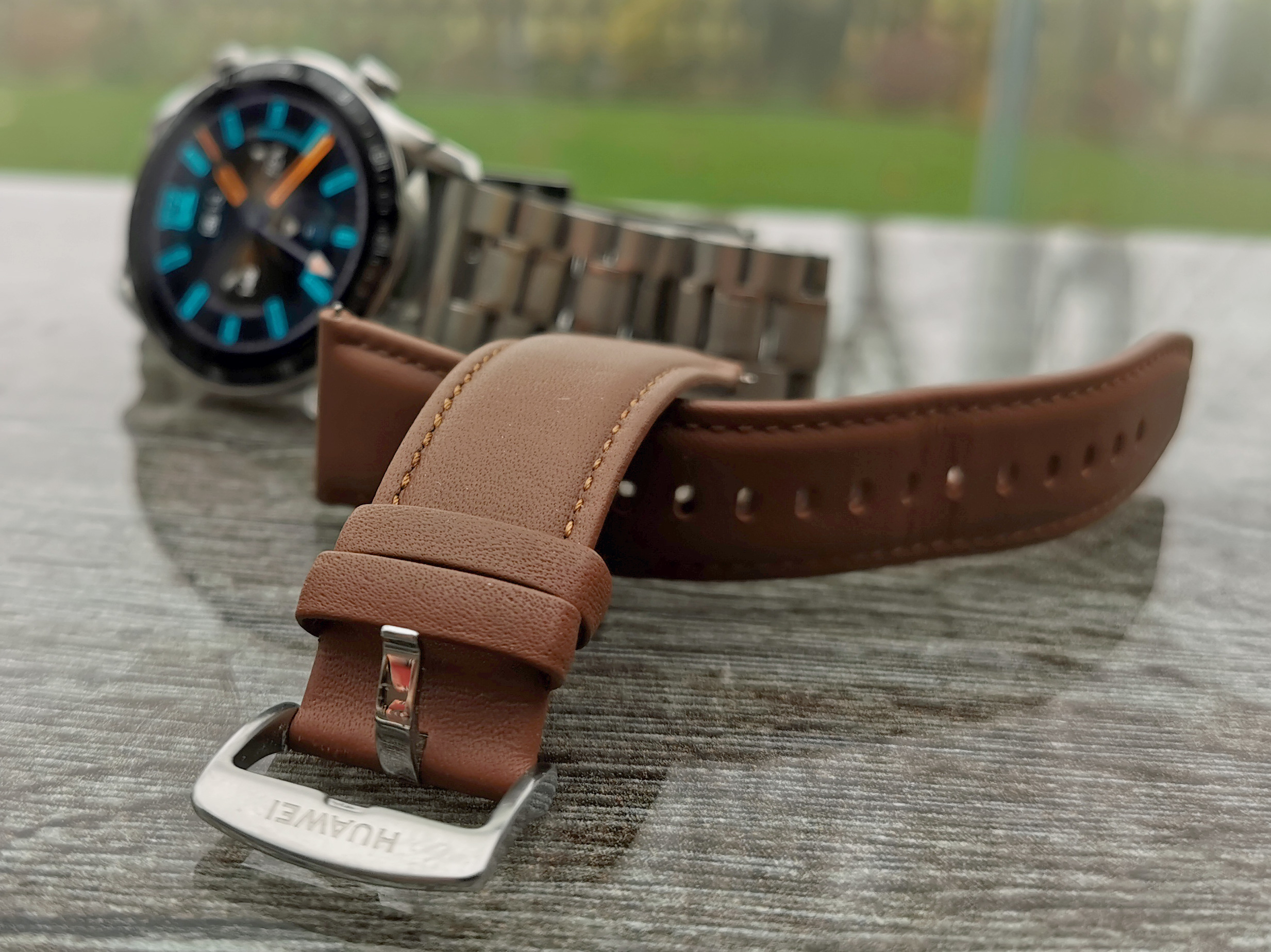 Auch wenn die 46-Millimeter-Version auf den ersten Blick recht voluminös erscheint, sollte sie nicht nur an durchschnittlichen Männer-Handgelenken ordentlich aussehen, sondern ist trotz des relativ hohen Gewichts von rund 70 Gramm angenehm zu tragen. Bei sportlichen Aktivitäten ist dabei das Silikon-Armband vorzuziehen, da ein Lederarmband gewöhnlich nach ein paar Wochen mehr oder weniger schweißtreibender Aktivität erste Abnutzungserscheinungen zeigt. Zudem wir das Material auf Dauer zunehmend unhygienischer. Das Silikon-Armband lässt sich hingegen einfach abwaschen. Gegen einen Wechsel des Armbands gegen eines von Drittanbietern spricht zum Glück auch nichts, Huawei verwendet für die Watch GT 2 den 22-Millimeter-Standard für Armbänder, sodass Ersatz leicht zu finden ist.