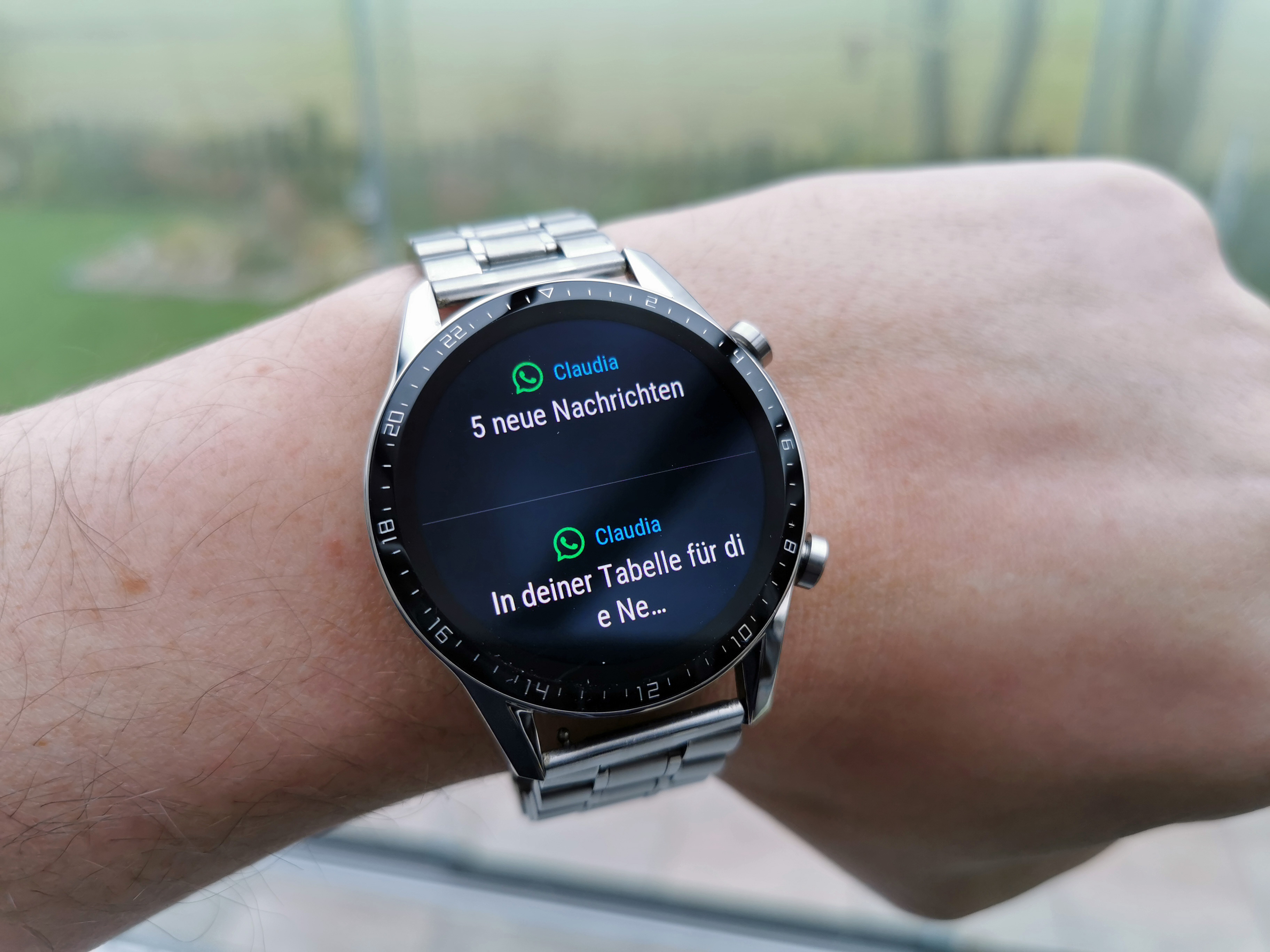 Leider funktioniert nicht alles so gut wie das Telefonieren bei der Huawei Watch GT 2. So lassen sich Benachrichtigungen zwar empfangen und auch die Quelle – etwa Whatsapp oder Skype – wird richtig angezeigt, allerdings ist antworten nicht möglich. Auch wenn mehrere Nachrichten eingehen sind die nicht mehr einzeln lesbar. Stattdessen gibt es dann nur noch den Hinweis, dass X Nachrichten über Dienst Y eingegangen und ungelesen sind. Immerhin werden Umlaute richtig dargestellt, Emojis zeigt die Uhr hingegen nicht. Außerdem haben wir während des Testzeitraums Google Maps untersagen müssen, Nachrichten auf die Watch GT 2 weiterzuleiten, da alle paar Minuten aktualisierte Streckeninformationen für den Weg von oder zur Arbeit eintrudelten. Übrigens quittiert die Uhr eingehende Nachrichten entweder per Ton oder alternativ per in der Intensität regelbarem Vibrieren.