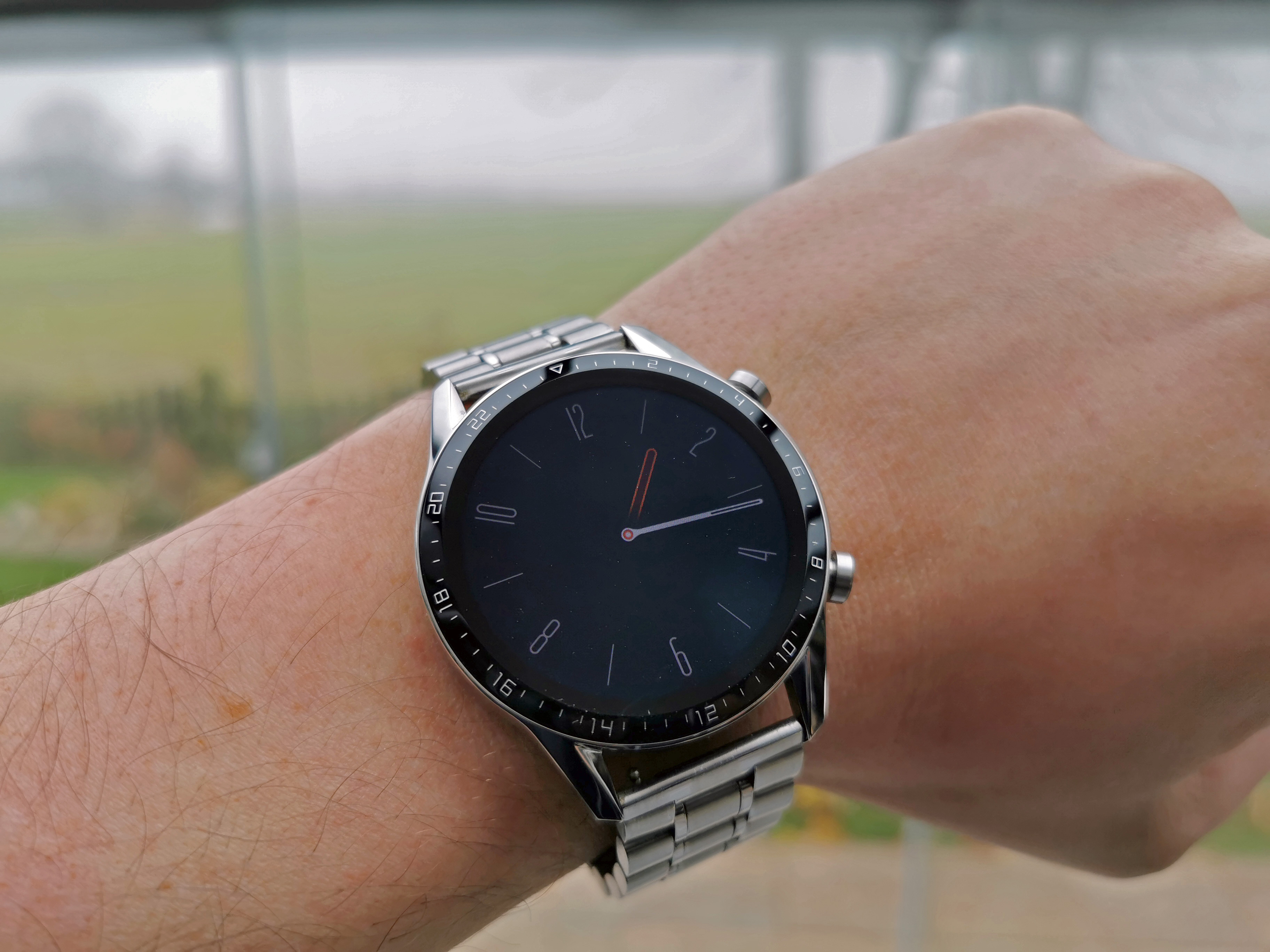 Als Uhr im Alltag getragen macht die GT 2 eine sehr gute Figur, allerdings müssen Nutzer auch mit einigen Limitierungen leben. Positiv hervorzuheben ist abgesehen von der schicken Optik vor allem das Display. Es ist rund und misst 1,39 Zoll im Durchmesser bei einer Auflösung von 454 × 454 Pixel. Das ergibt eine Darstellungsschärfe von 326 Pixel pro Zoll und darf getrost als scharf bezeichnet werden. Wegen der Verwendung eines OLED-Screens punktet das Panel mit tiefstem Schwarz und lebendigen Farben, außerdem ist die Blickwinkelunabhängigkeit hervorragend, was den Eindruck eines echten Ziffernblattes verstärkt. Unterstützt wird dieser Eindruck von sogenanntem 3D-Glas, das sieht insgesamt schon ziemlich beeindruckend aus. Außerdem verfügt die Huawei Watch GT 2 über einen Umgebungslichtsensor, der die Display-Helligkeit auf Wunsch automatisch regelt. Das minimiert den Blendeffekt in sehr dunkler Umgebung und ermöglicht grundlegende Ablesbarkeit selbst im Sonnenschein – auch wenn letzteres besser mit einer schattenspendenden Hand funktioniert.