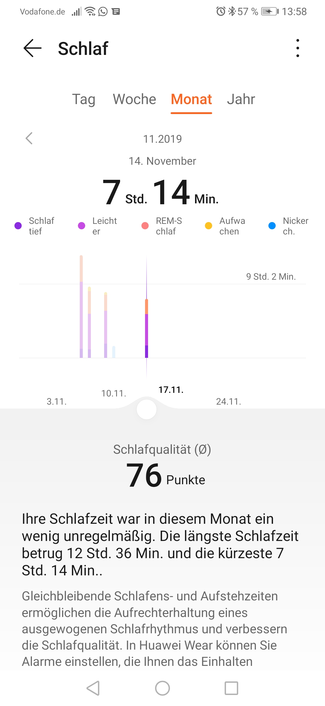 Big Brother is watching you – auch im Schlaf. Das könnten zumindest Miesepeter zum Schlaf-Tracking der Huawei Watch GT 2 sagen. Der Rest freut sich vermutlich eher darüber, dass die Health-App in Verbindung mit der auch nachts getragenen Uhr Tipps für besseren und gesünderen Schlaf gibt. Dabei untersucht sie nicht nur die Schlafdauer, sondern unterscheidet auch nach Tiefschlaf, leichtem Schlaf, REM-Schlaf und Atmungsqualität. In der Auswertung sehen Nutzer dann, ob der Schlaf erholsam war und ein Klick auf eventuell erkannte Probleme öffnet Tipps zur Behebung oder Besserung des Problems. Puls und Stresslevel werden in der smarten Voreinstellung in Abhängigkeit der Tätigkeit gemessen und bei besonders hohem oder – außerhalb von sportlichen Aktivitäten wohl eher – besonders niedrigem Level warnt die Uhr. Die Erkennung der Schlafenszeiten funktionierte sehr gut und passte grob zu den Zeiten, zu denen wir im Test zu Bett gingen und aufstanden.