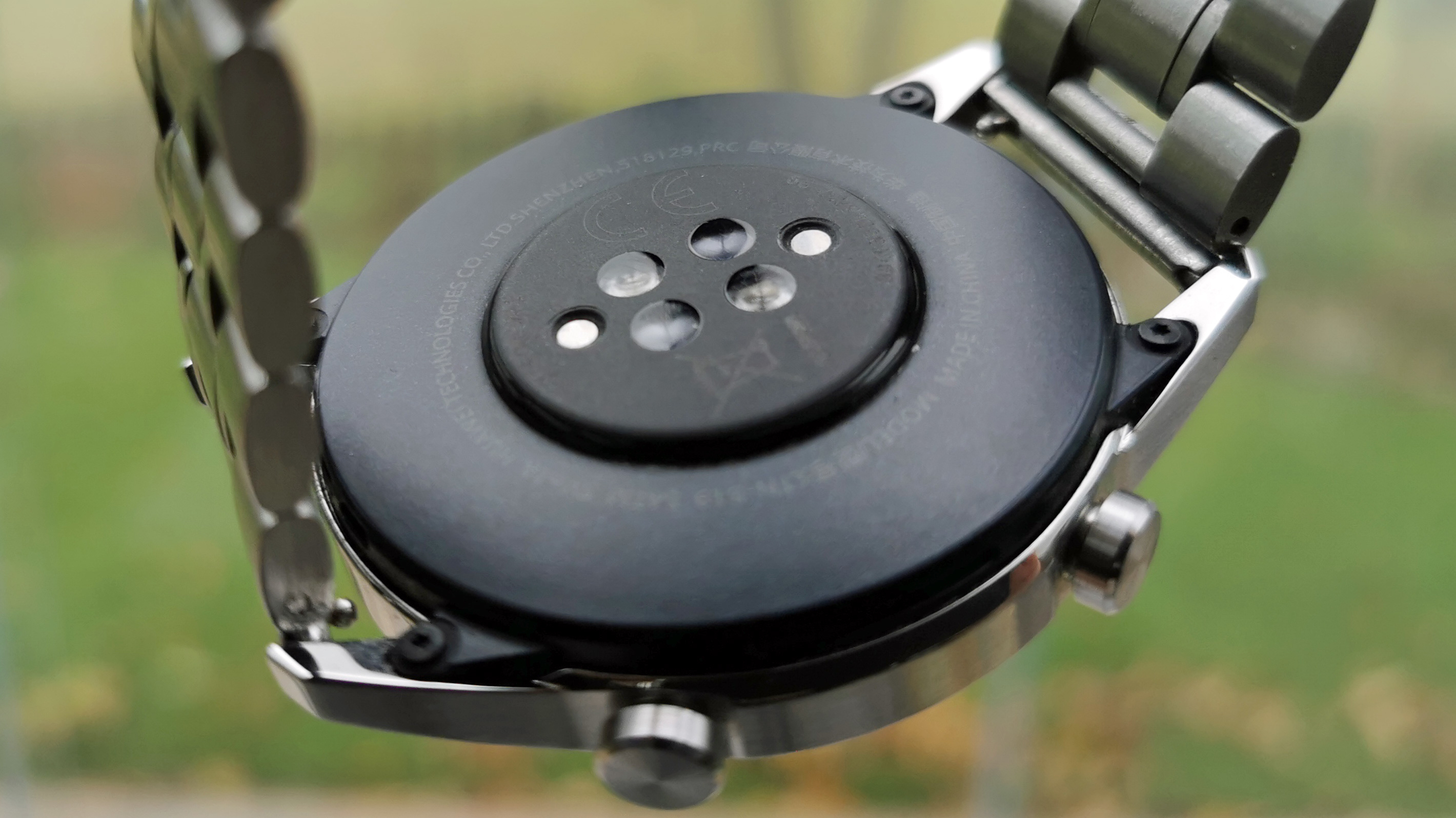 Erst in dunkler Umgebung oder bei näherer Betrachtung sind das Ziffernblatt als leuchtendes Display und der hochwertige Metallkorpus als Mischung aus Metall-Oberseite und Kunststoff-Unterseite zu erkennen. Spätestens, wenn die Watch GT 2 nicht mehr am Handgelenk, sondern in der Hand liegt, wird der Unterschied zu einer normalen Uhr offensichtlich. Denn dann ist die Kunststoff-Unterseite mit den darin eingelassenen Sensoren zur Pulsmessung zu sehen. Die falsche Lünette gibt es übrigens nur bei der großen Version mit 46 Millimeter, die hier getestet wird. Die ebenfalls erhältliche 42-Millimeter-Version kommt ohne aus. Zudem ist die kleine Version auch flacher (9,4 Millimeter zu 10,6 Millimeter), die große Variante bietet daher unter anderem längere Akkulaufzeiten.