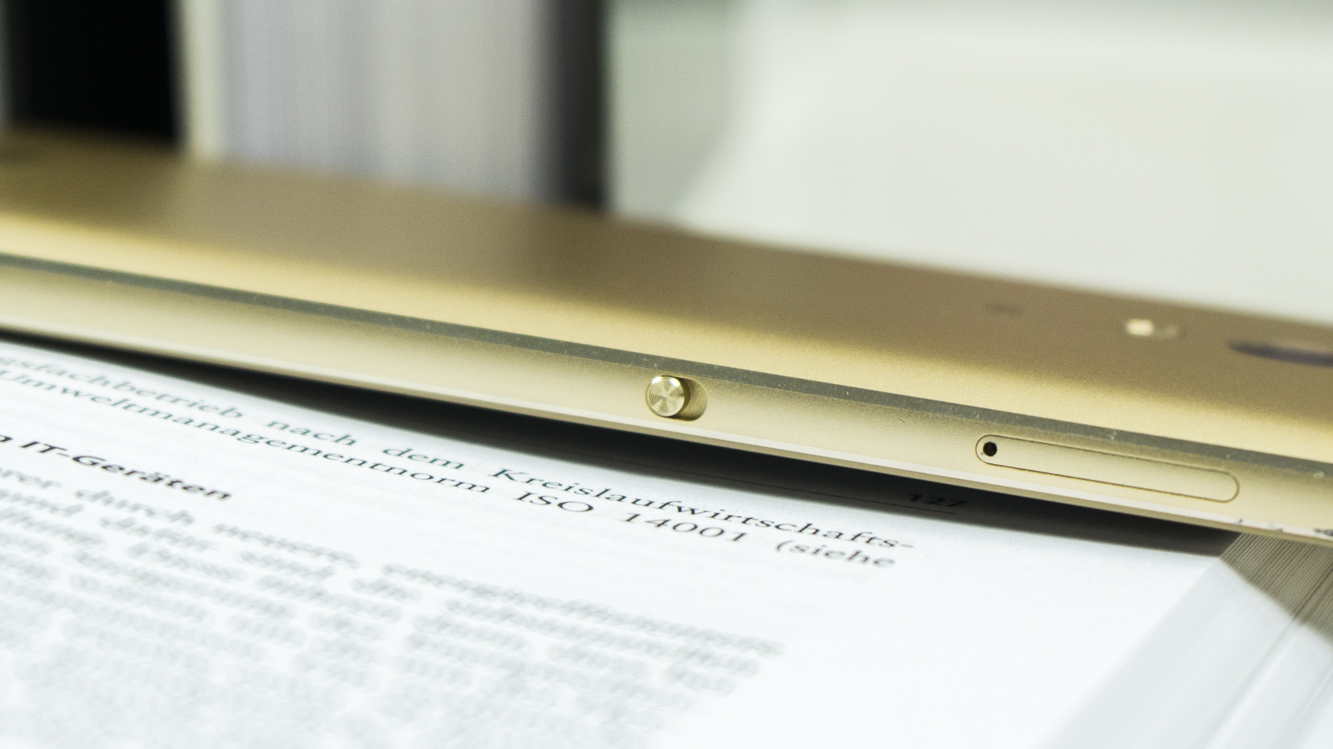 Das Großbild-Smartphone P2 gibt es in zwei Farben: Gold oder Grau. Die Verarbeitung ist stets dieselbe. Der Korpus ist festverschlossen. Bis auf zwei kleine Flächen für das Subsystem Funk, sind Rücken und Chassis aus eloxiertem Aluminium. Der Rahmen um das Telefon ist oben sowie unten abgeschliffen und glänzend. Der Rest ist matt. Die Bedienung des 8,3 mm dicken und 177 Gramm schweren P2 läuft über drei virtuelle Tasten auf dem Bildschirm und einen physischen Knopf am Kinn. Hierunter wurde auch der aktive Fingerabdrucksensor platziert, der den fremden Zugriff durch eine biometrische Eingabe verhindert. Rechts befindet sich die An-/Aus-Taste sowie eine Wippe zur Regelung der Lautstärke. Links oben wird der Schlitten herausgefahren, der zwei nanoSIM-Karten (4FF) beherbergen kann. Alternativ kann auch eine Speicherkarte vom Typ microSDXC eingesetzt werden. Bei einem internen Speicher von 32 GByte und der tatsächlich verfügbaren Kapazität von nur 9,03 GByte für den Nutzer, ist die Möglichkeit zur Erweiterung sinnvoll.