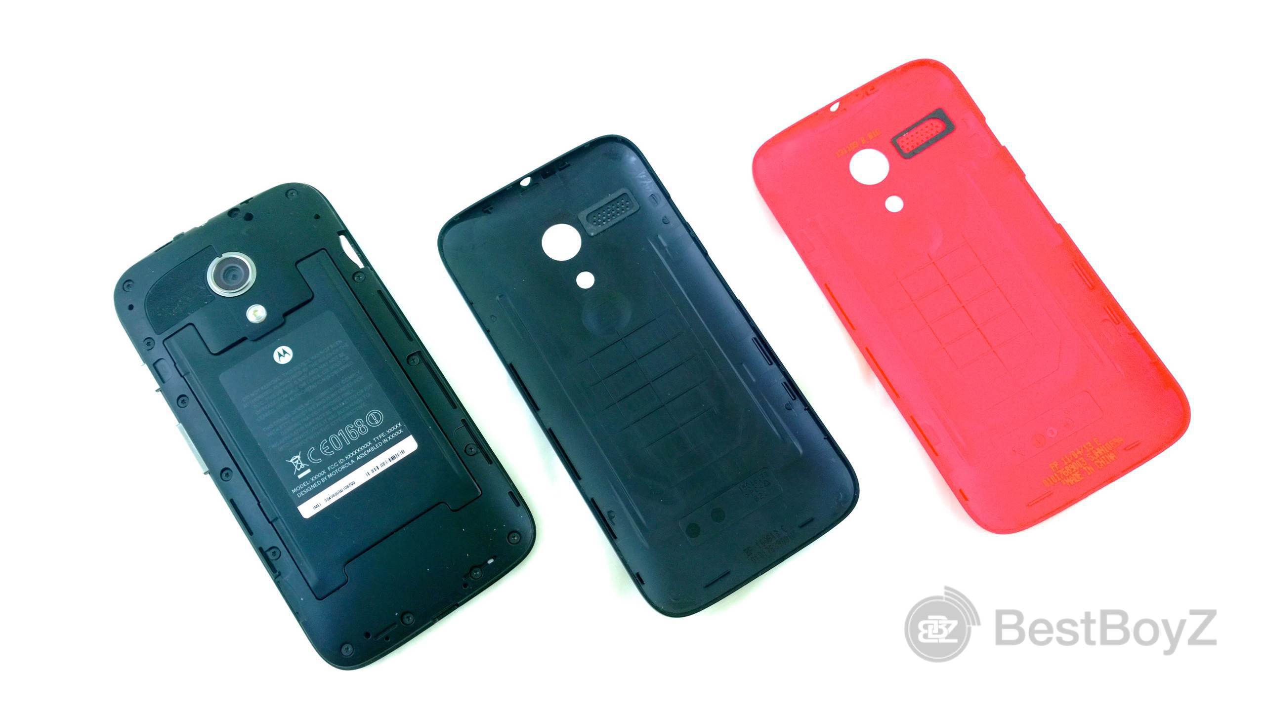 Jedes Motorola Moto G kommt in der Farbe Schwarz. Die vordere Seite ist fest, während die Rückseite dafür gemacht wurde, sie auszutauschen. Die sogenannten „Motorola Shells“ gibt es in sieben verschiedenen Farben und kosten durchschnittlich 15€. Wer noch mehr Schutz und etwas Funktionales haben möchte, kann sich ein „Motorola Flip Shell“ kaufen. Das ist ein Case mit einem eigebauten Magneten, ähnlich wie man’s von dem iPad kennt. Es sperrt und öffnet das Telefon automatisch.