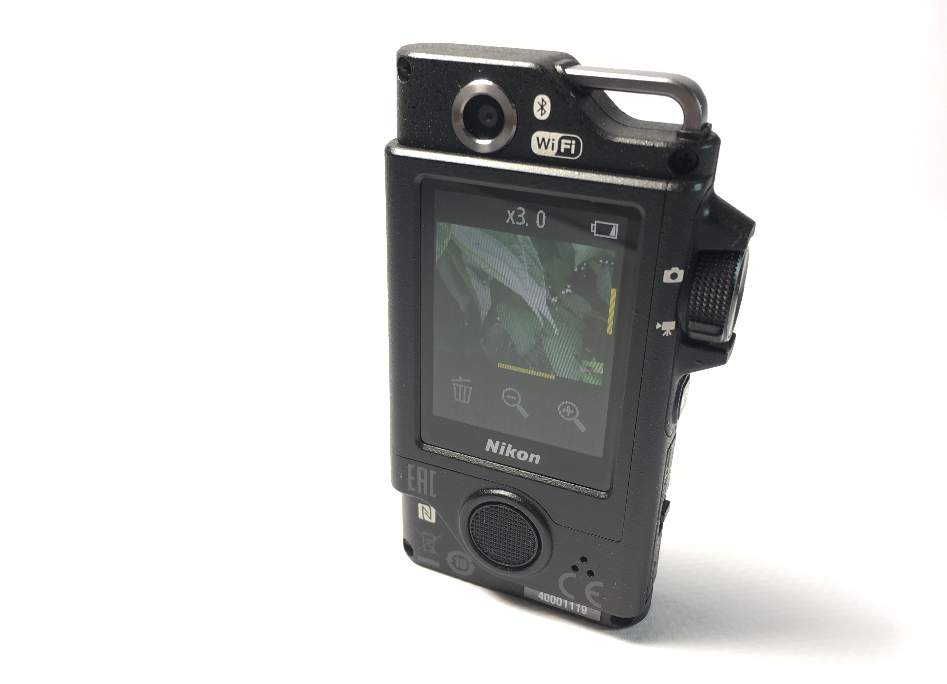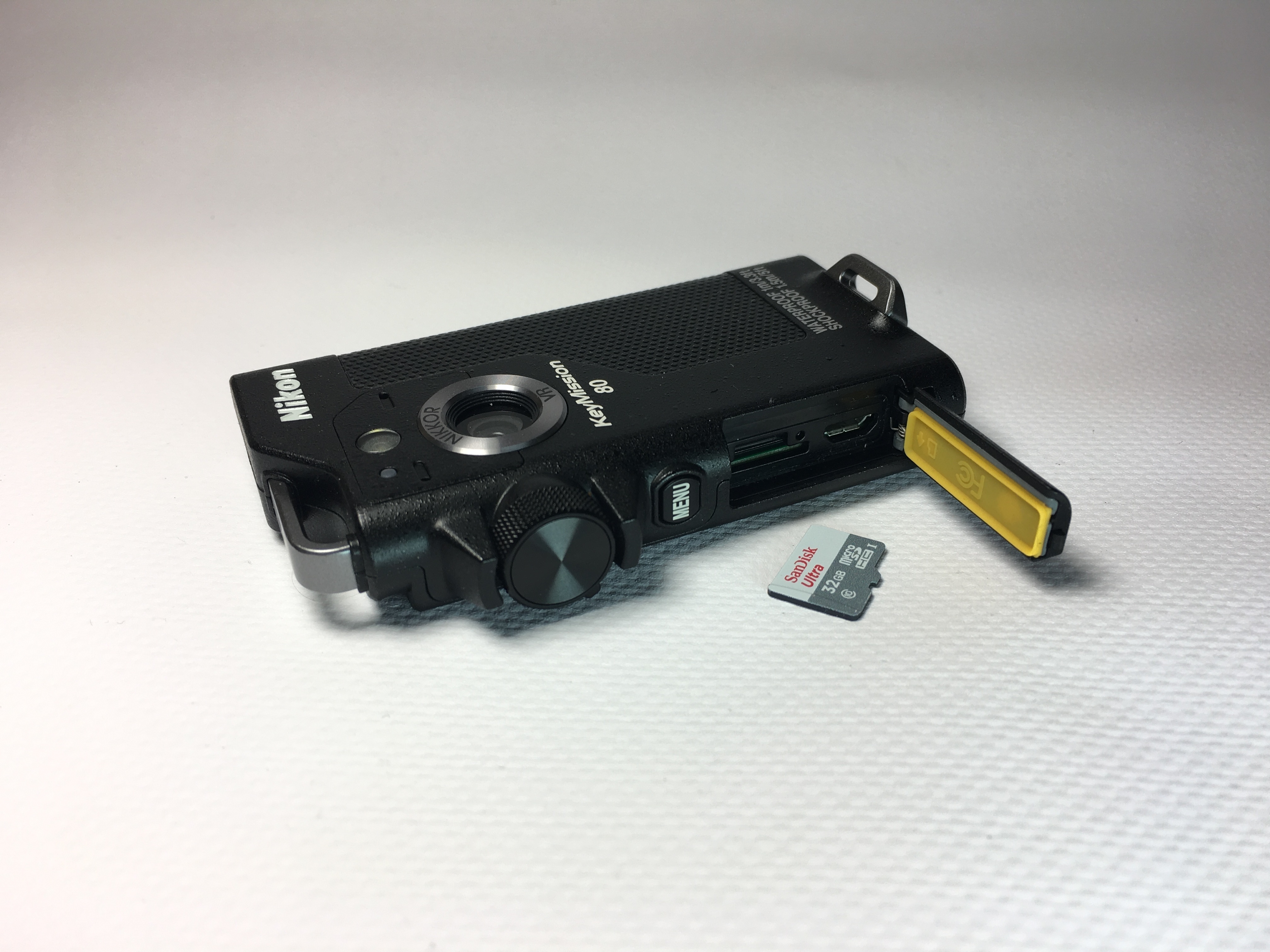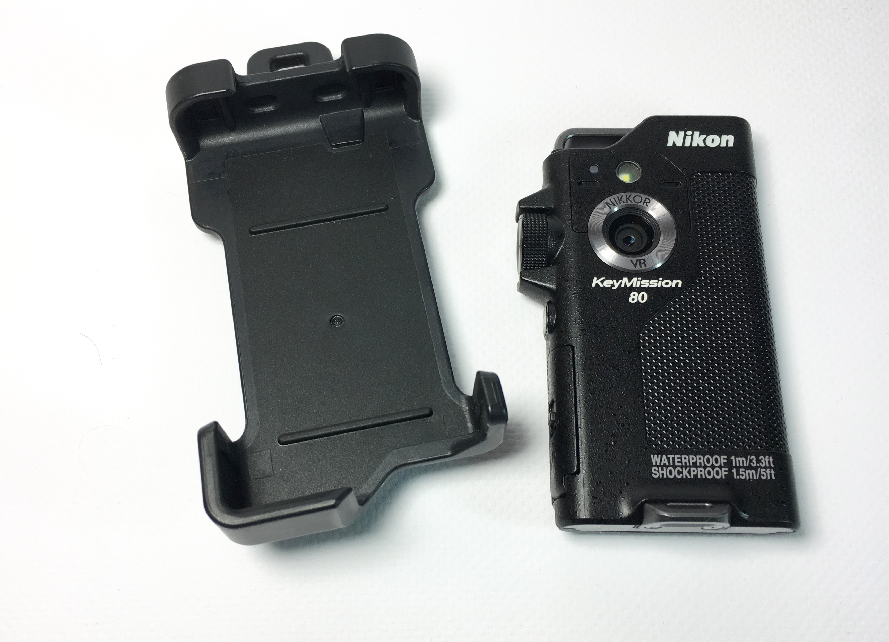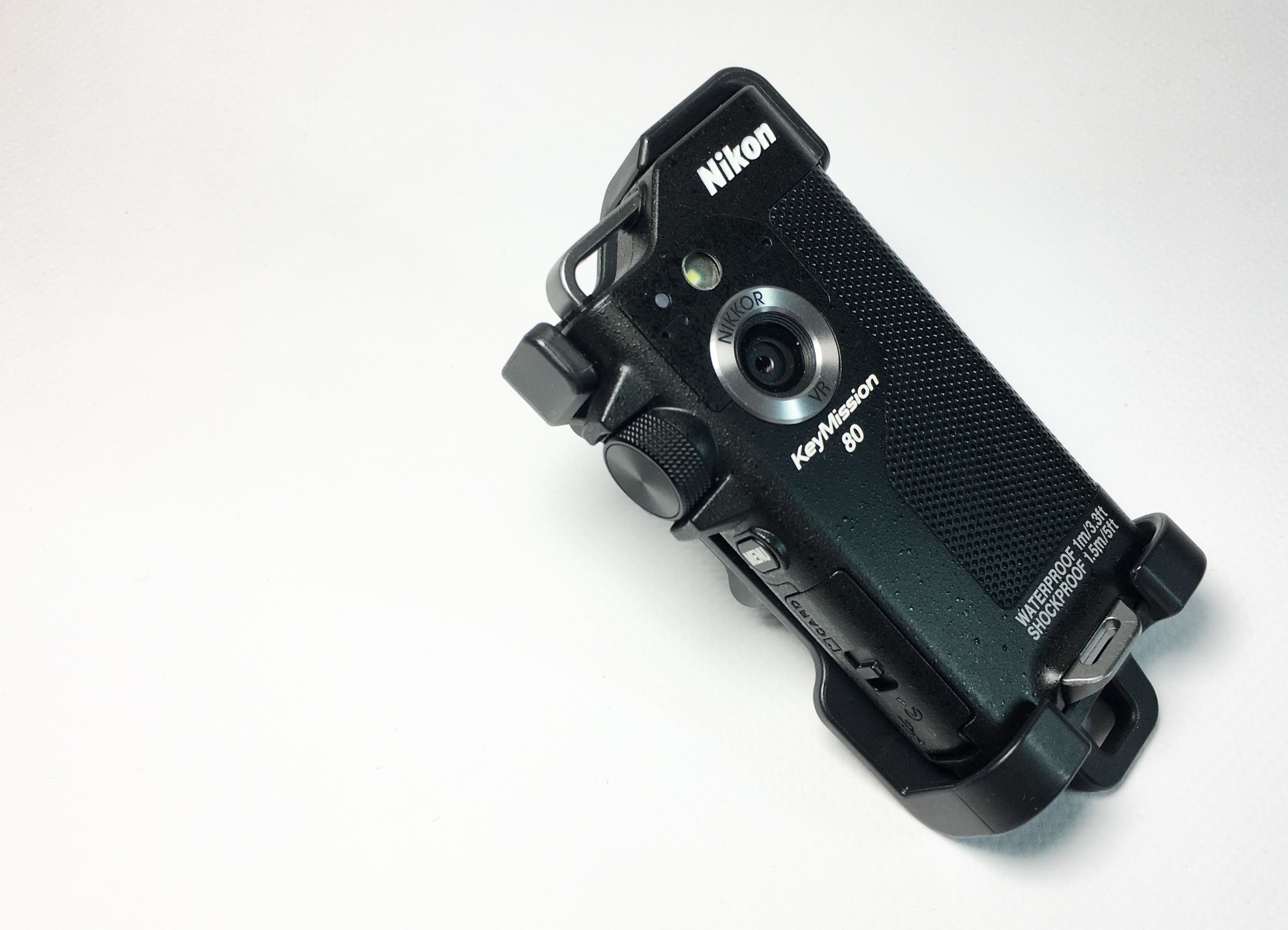 Die Keymission 80 hat zwei gegenüberliegende Objektive, zwei Taster, einen Wählhebel für Foto- oder Video-Betrieb und einen kleinen Touchscreen. Ähnlich wie beim Smartphone ist die Linse auf der Bildschirmseite für Selfies gedacht, während die rückseitige Linse die Hauptkamera darstellt. Die Hauptkamera hat zusätzlich eine LED für Nachtaufnahmen; wie beim Handy funktioniert sie auch hier als Taschenlampen-Ersatz. Das Gehäuse ist staubdicht und bis zu einer Tiefe von einem Meter wasserdicht. Auch gegen Stürze aus bis zu 150 cm Höhe ist die Nikon geschützt, sagt der Hersteller. Die Abmessungen erinnern an Diktiergeräte aus längst vergangenen Zeiten. Auf Ober- und Unterseite gibt es Befestigungsösen, um die Kamera mit einer Kordel gegen Abstürze zu sichern. Micro-SD-Kartenslot und Micro-USB-Buchse verstecken sich hinter einer abgedichteten Klappe an der Gehäuseseite. Der Akku ist fest verbaut. Defekte Energieträger sind mit etwas Schrauberei aber vom Nutzer austauschbar. Das schwarze Gehäuse hat die selbe Oberflächenstruktur wie die Spiegelreflex-Kameras von Nikon.