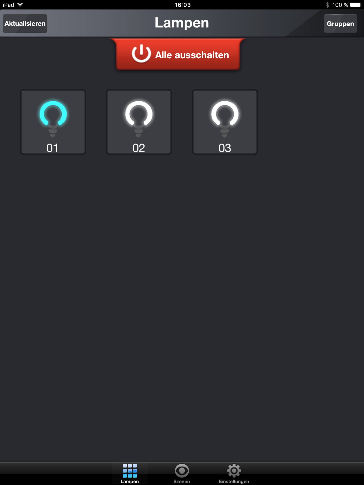 Beim Einschrauben der Lampen gibt es den ersten Aha-Effekt. Die Lampen gehen an und sehen, nun ja, merkwürdig aus. Das Licht, das sie abgeben, ist nämlich nicht richtig weiß, sondern arg grün-blaustichig. Außerdem scheint der Diffusor etwas transparenter als bei anderen LED-Lampen zu sein, so dass die Spitze der Lampen deutlich dunkler ist und – je nach Blickwinkel – das Licht einzelner LEDs durchscheint, was nicht unbedingt gesund aussieht. Läuft die App erst mal, stört das weniger, da der Effekt „nur“ bei Lichtfarbe Weiß auftritt.