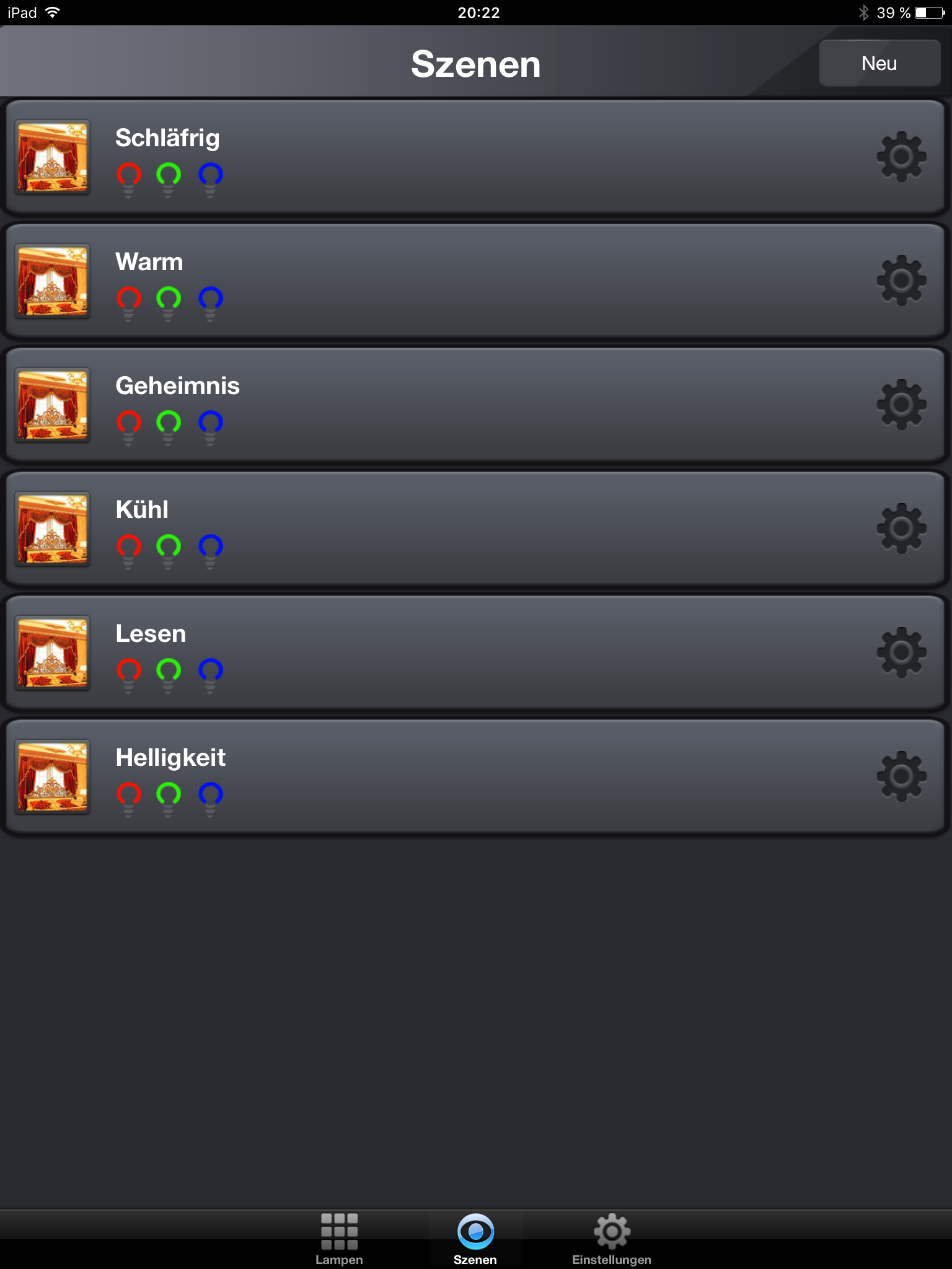 Möchte man Szenen anpassen oder neue anlegen, geht das recht fix; nur die Farbeinstellung hakelt gerne ein wenig. Im Hauptmenü bei den Lampen lässt sich pro Lampe auch ein Timer programmieren, man kann hiermit also einen Wecker ergänzen oder ähnliches. Einen Ausschalter für einzelne Lampen besitzt die App auch, er ist aber im Helligkeitsmenü der jeweiligen Lampe versteckt.