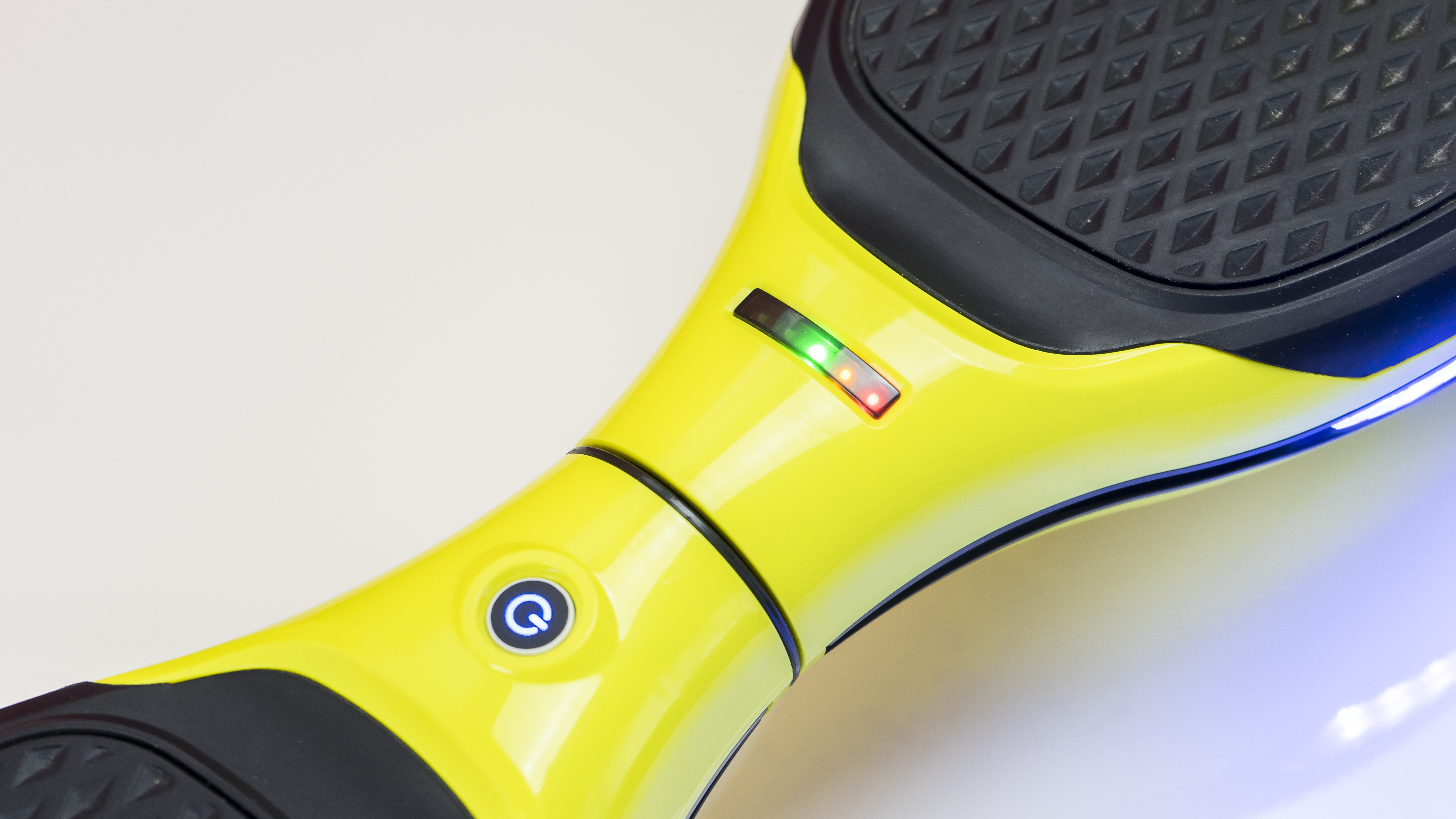 An der Front wurden je Seite 9 hell in der Farbe Blau leuchtende LEDs in einem geschwungenen Design platziert. Mit diesem Look hebt sich das Hovertrax 2.0 etwas von der Masse ab. Der Knopf zum Ein- und Ausschalten befindet sich neben den Fußmatten auf der Kopfseite. Im eingeschalteten Zustand leuchtet dieser ebenfalls blau. Um ein ungewolltes Ausschalten zu vermeiden, wurde die Taste etwas tiefer eingelassen.