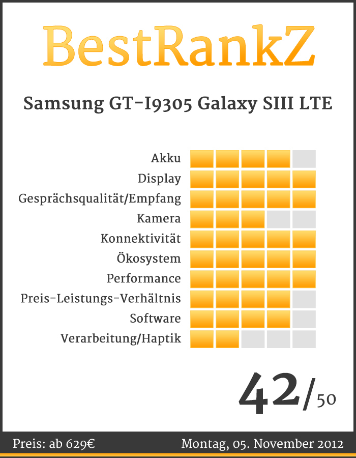 Das GT-I9305 Galaxy SIII LTE ist akuell eines der besten Smartphones – sogar das beste, wenn man explizit ein LTE-Smartphone haben möchte. Nahezu jede Eigenschaft ist perfekt. In Sachen Verarbeitung hätte Samsung sich allerdings mehr Mühe geben können. Das Telefon gibt's bei Telekom Deutschland mit Vertrag und ohne Vertrag bei amazon.com .