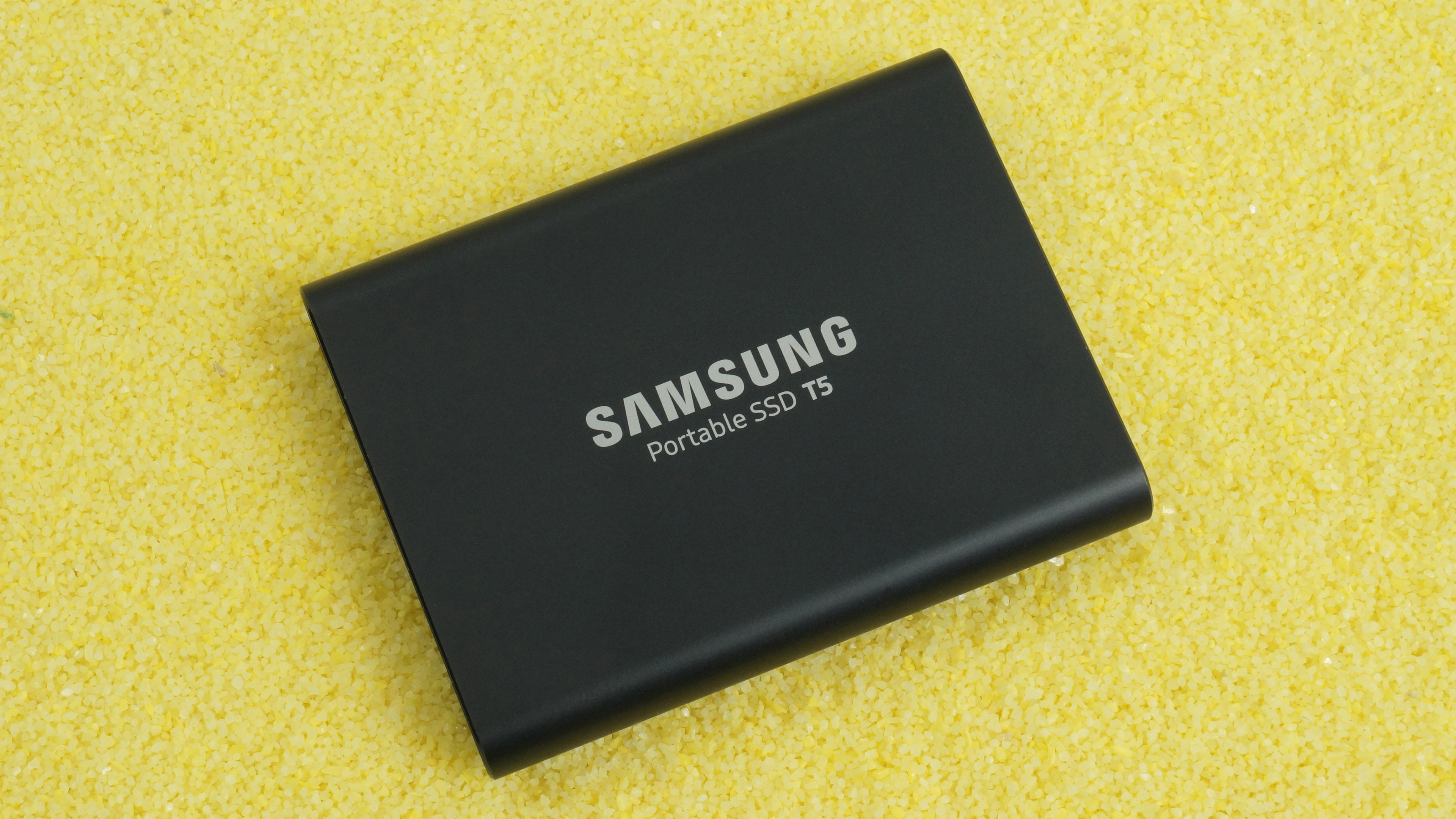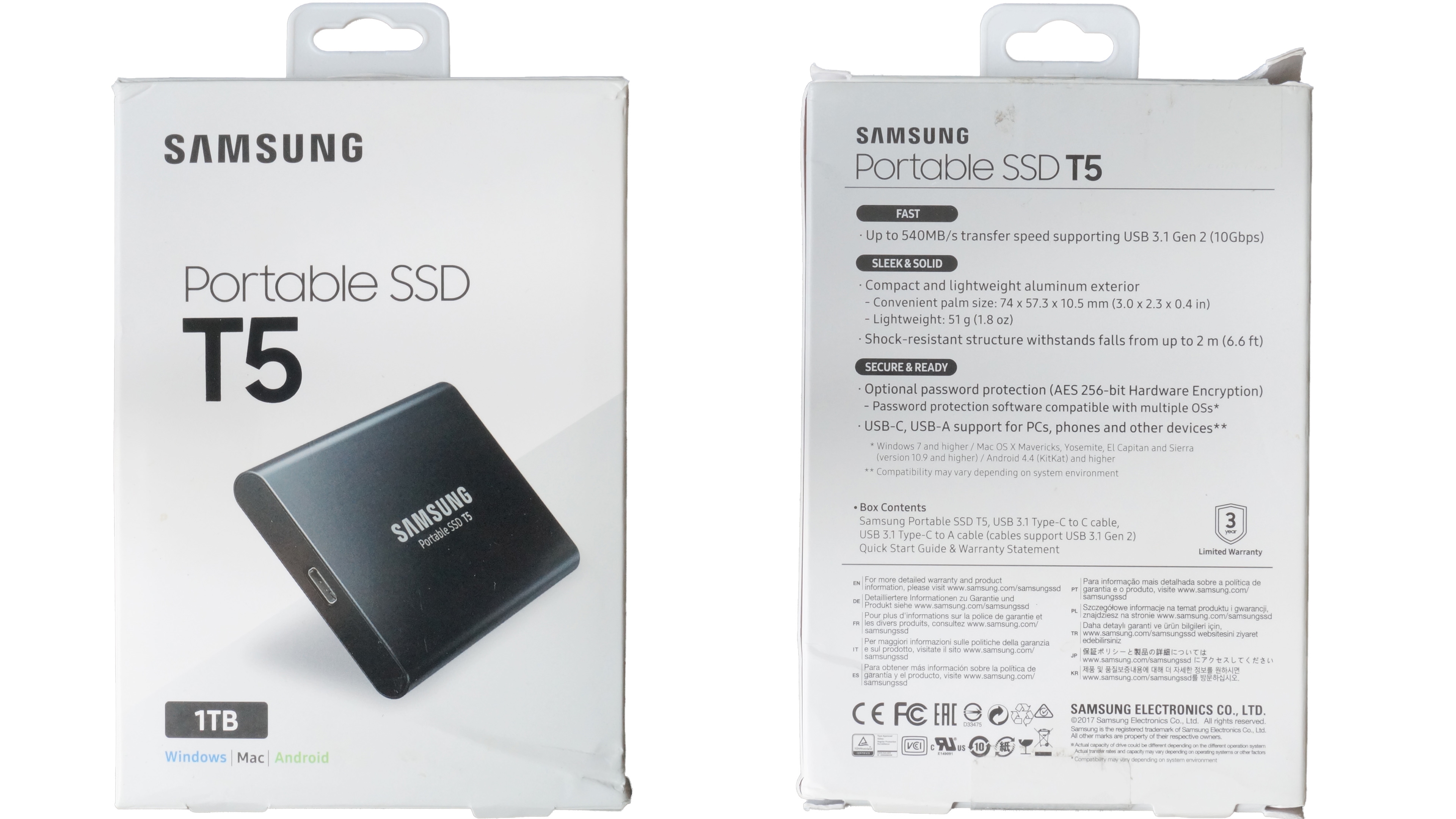 Mit schlanken Maßen von nur 74 × 57,3 × 10,5 mm und einem Leichtgewicht von 51 g ist Samsungs T5 die richtige Wahl zum Transport und der Hosen- oder Jackentasche. Einen versehentlichen Sturz steckt die T5 problemlos weg. Dafür sorgt ein stoßfestes, nahezu vollständig aus Aluminium gefertigtes Gehäuse, welches gleichzeitig die Abwärme aus dem Inneren der T5 besser nach außen ableitet: Intern stellen Wärmeleitpads eine direkte Verbindung zwischen Controller, Flash-Speicher, DRAM-Cache und der Alu-Hülle her.