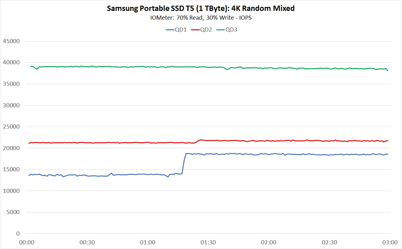 Typischerweise fallen beim täglichen Gebrauch der SSD jedoch gemischte Workloads bei niedrigen Anfragetiefen an. Die Leistung in diesem Bereich zeigen die Verlaufskurven bei einer 70/30-Lastverteilung zwischen Lesen und Schreiben über einen Zeitraum von drei Minuten. Hier liefert die T5 im IOMeter erneut gute IOPS-Werte, auffällig ist allein das reproduzierbare Verhalten bei einfacher Anfragetiefe: Die SSD liefert im Mittel knapp 80 Sekunden lang 13.742 IOPS, danach springt der Wert auf durchschnittlich 18.536 IOPS. Im QD2- (21.523 IOPS) sowie QD4-Durchlauf (38.845 IOPS) bleibt das Messergebnis konstant.