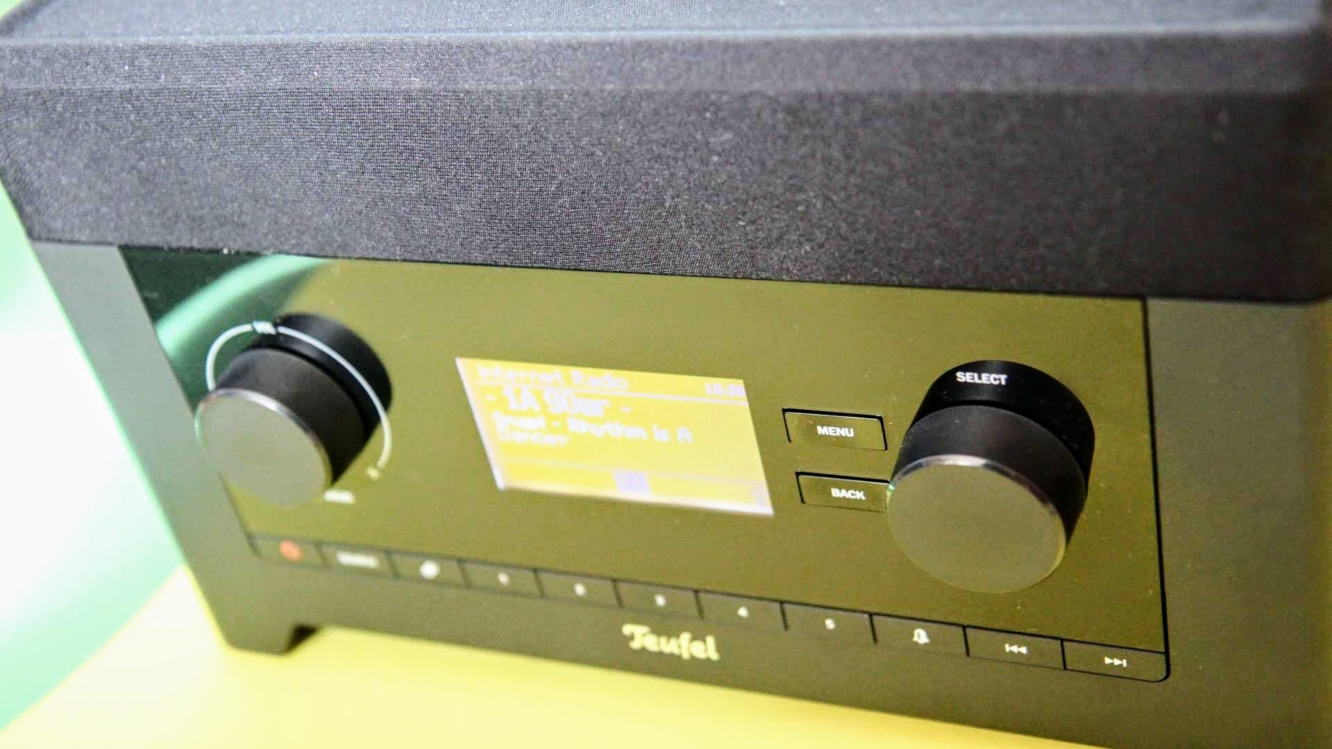 Über zwei Drehregler lässt sich die Lautstärke regeln und im Menü steuern. Außerdem besitzt das Digitalradio 13 Taster auf der Vorderseite. Davon sind fünf als Schnellwahltasten vorgesehen. Uns ist aufgefallen, dass nicht alle Taster mittig eingepasst sind. Dafür gefällt uns der geringe Druckpunkt, da sich das Digitalradio so beim Bedienen nicht verschiebt.