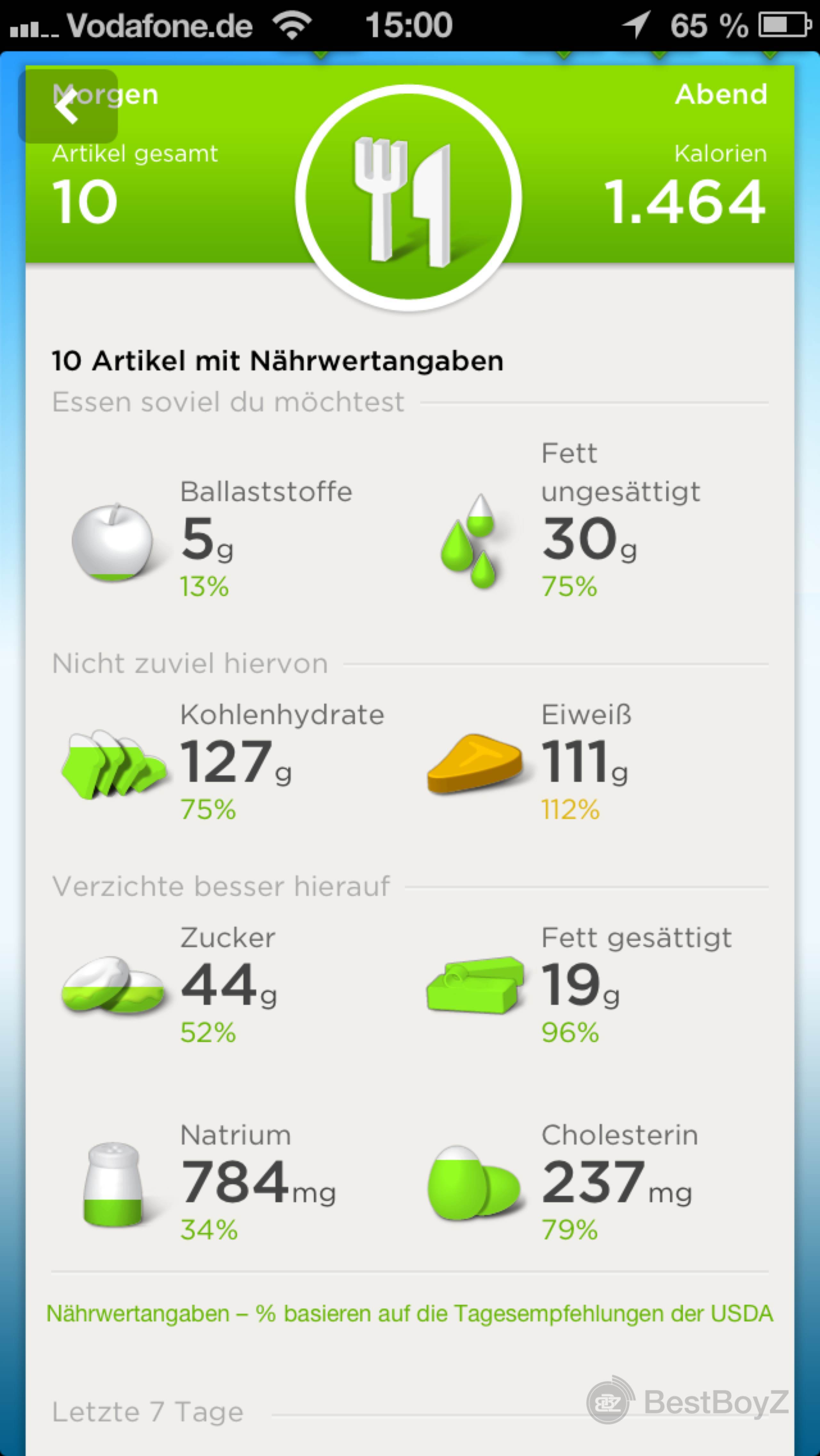 Der dritte und letzte Fokuspunkt ist Ernährung. Alles was man täglich zu sich nimmt, kann freiwillig in der Applikation eingetragen werden. Sei es ein Kaffee, ein Kaffee mit/ohne Zucker, ein Kaffee mit/ohne Milch oder die Kombination von allem. Hört sich ziemlich aufwendig und zeitraubend an, stimmt‘s? Ist es aber nicht. Die Produkte kann man entweder über eine Suche eingeben oder per EAN-Barcode einscannen. Wenn das Gegessene nicht verfügbar ist, lassen sich Nährwerte und Quantität auch selbst eintragen – also das ist aufwendig und macht überhaupt keinen Spaß, null Bock und das suckt. Die meisten Sachen findet man zum Glück fix – die Food-Datenbank ist enorm groß. Darin aufgelistet werden die kleinsten Mahlzeiten und sogar Markenprodukte von Schweizer Gewürzunternehmen. Was ich ganz nützlich finde: Die Applikation kalkuliert nicht nur Kalorien, Ballaststoffe, Kohlenhydrate, gesättigte und ungesättigte Fette und Zucker, sondern zeigt mir auch an, was ich zu mir nehmen darf und wovon ich lieber die Finger weglassen sollte.