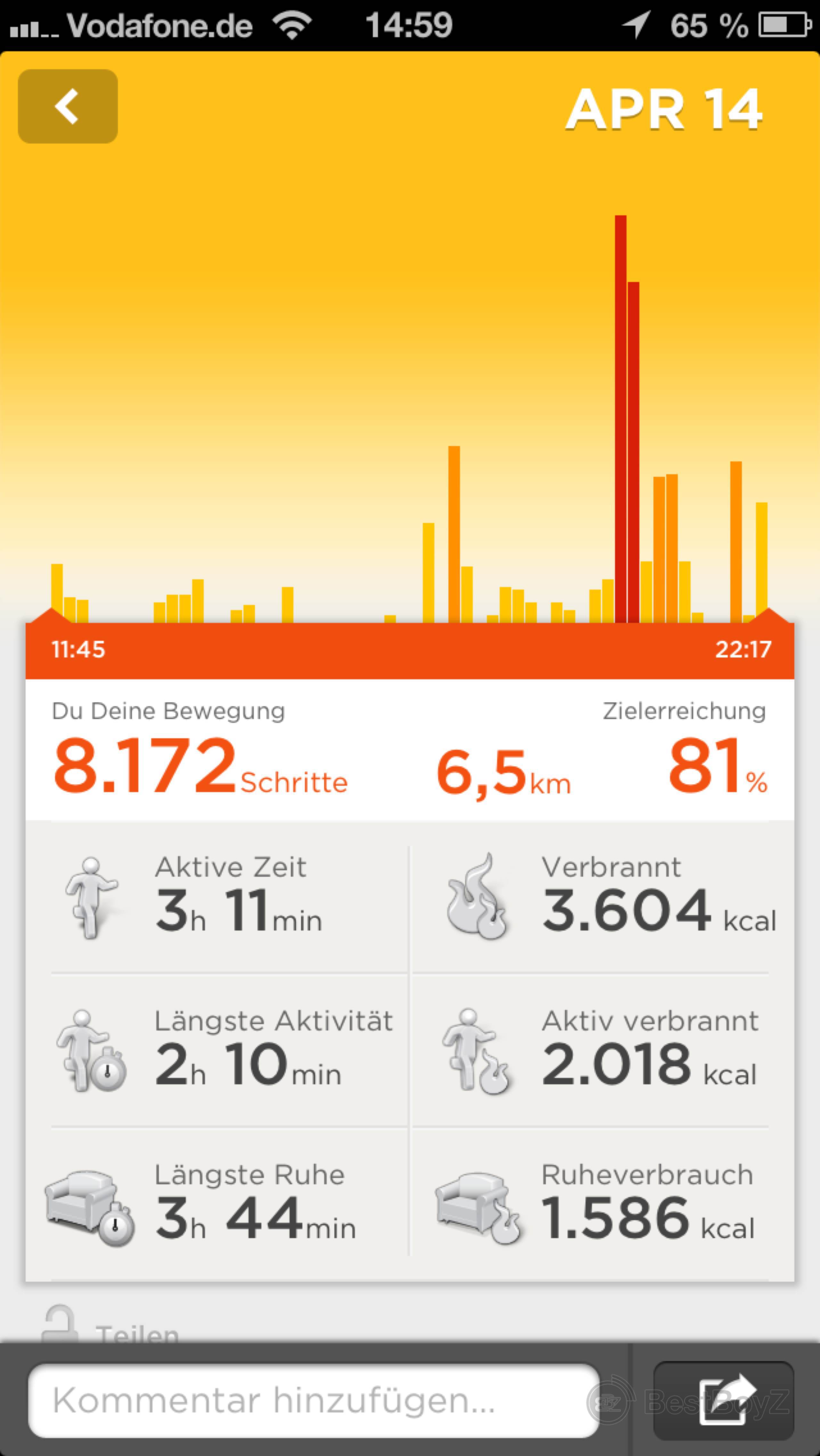 ... das sind die drei wichtigsten Punkte des Trackers. Damit alle gegangenen Schritte oder Aktivitäten erfasst werden können, ist es wichtig, dass das UP by Jawbone täglich getragen wird. Die Kalkulation ist erstaunlich präzise, kann ich Euch aus meiner Erfahrung erzählen. Dafür sorgt ein sehr moderner Sensor namens MotionX, der von der Firma Fullpower Technologies unter Lizenz bezogen wird. Zur Beginn schreibt die Applikation einem 10.000 Schritte pro Tag vor. Ein individuelles Ziel kann selbstverständlich eingetragen werden. Es gibt einige Aktivitäten, die man per Hand eintragen muss und auch sollte. Zum Beispiel Gewichte heben oder Herzkreislauf-Übungen wie Seilspringen. Doch keine Sorge: Die Bewegungen werden zwar erfasst, man muss der App nur mitteilen, wann und mit welcher Intensität sie ausgeführt wurden. Cool ist die Inaktivitätsfunktion: Auf Wunsch und per Vibrationsalarm erinnert das Armband einen, sich zu bewegen.