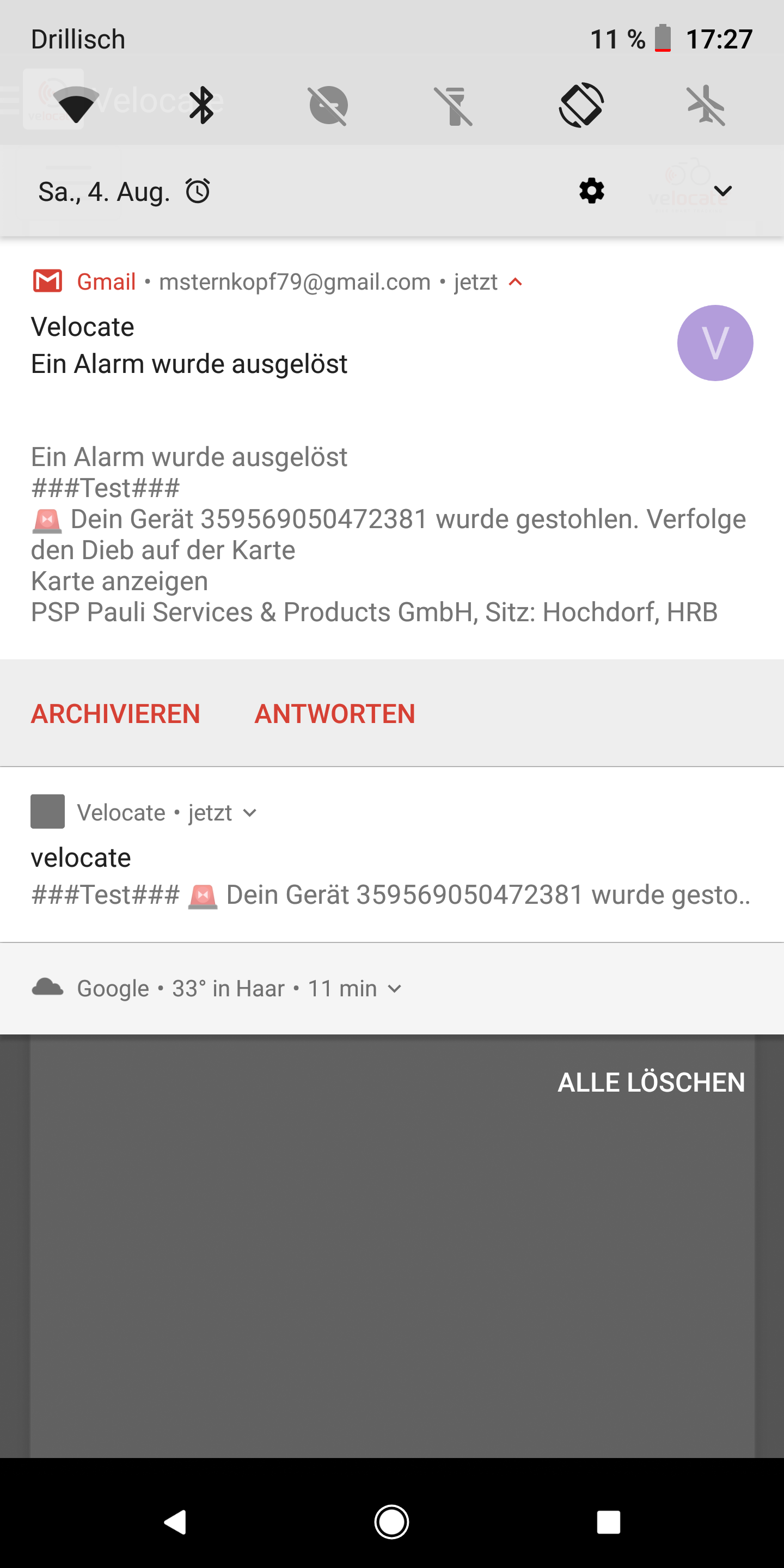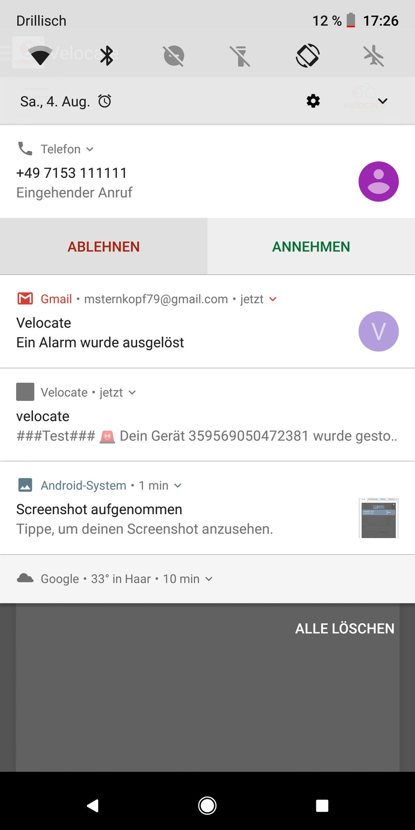 Der Alarmmodus kann nur bei bestehender Bluetooth-Verbindung aktiviert werden. Dann ist das Velocate VC One scharf gestellt und bemerkt jede Bewegung. Die App regelt die Empfindlichkeit des Bewegungssensors in sechs Stufen. Bewegt sich nun das Fahrrad, schickt der Tracker über das Mobilfunknetz eine Pop-Up-Nachricht an den Besitzer und ruft an. Das dauerte im Test zwischen wenigen Sekunden bis zu einer Minute. Nun verfolgt die App auf einer Karte die Bewegung des Fahrrads in Echtzeit.
