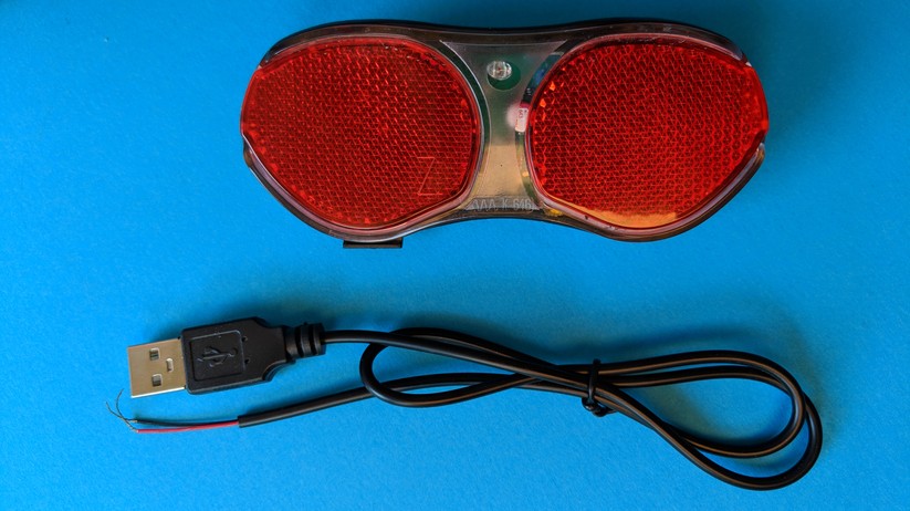 Trotz Vorladung soll der GPS-Tracker vor der ersten Inbetriebnahme geladen werden. Dafür legt Velocate der Packung ein USB-Kabel mit zwei Anschlüssen bei. Diese werden beliebig herum mit dem Push&Pull Stecker des Rücklichts verbunden. Über ein handelsübliches USB-Netzteil lädt nun der Akku.