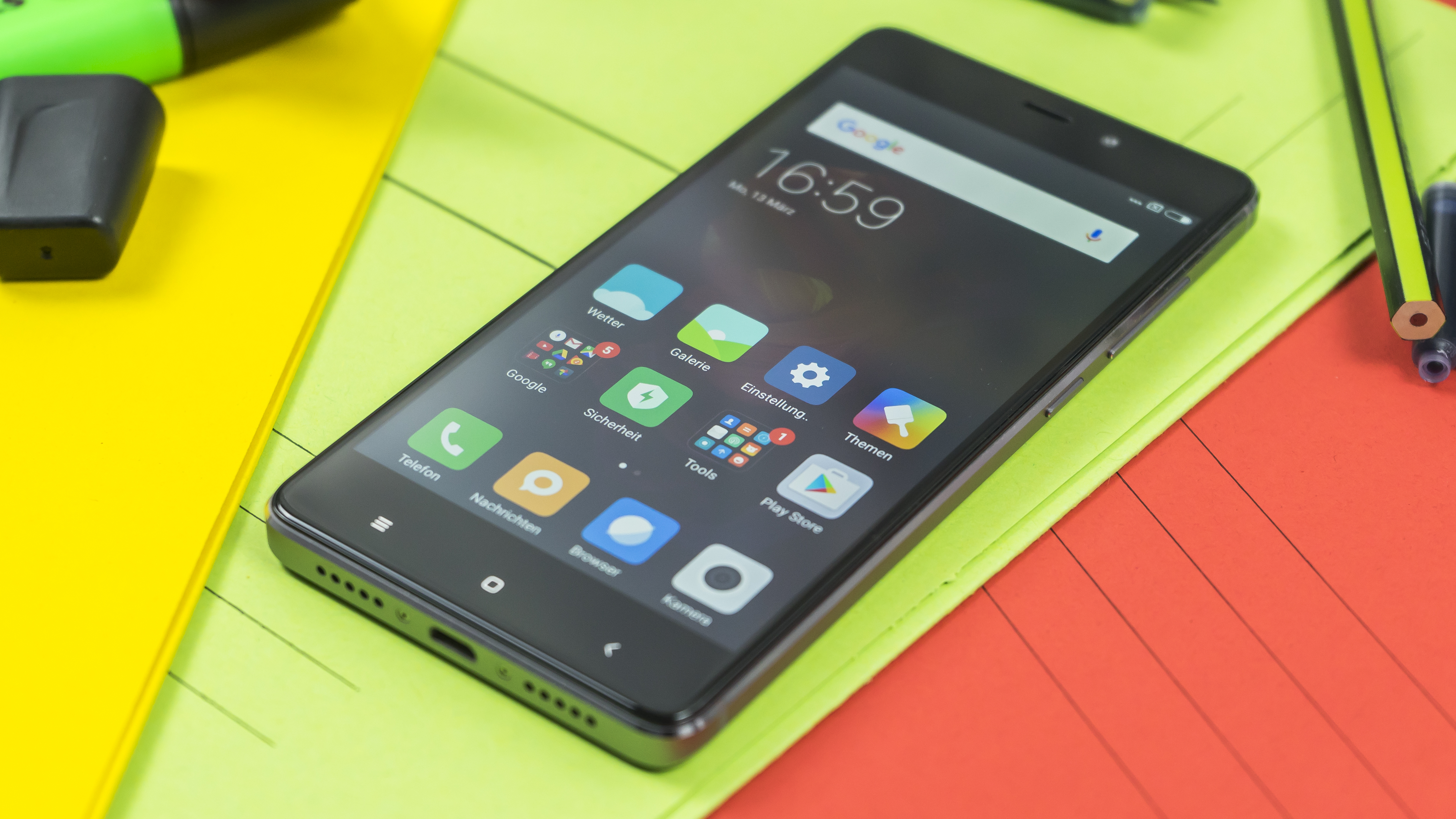 Auf dem Redmi 4 Prime läuft die internationale Version von MIUI in der Version 8.0, das zugrunde liegende Betriebssystem ist Android OS 6.0 Marshmallow. Im Gegensatz zu den chinesischen Ausführungen, sind hier ab Werk die Dienste von Google Play installiert. Auch dabei ist Sprache Deutsch. Das System ist nahezu komplett frei von Bloatware und außergewöhnlich sauber gehalten: schlanke Funktionalität, schöne Google-Tastatur, farbig aufeinander abgestimmt und insgesamt flott. Die Optik wirkt modern und westlich, statt quietschbunt und asiatisch.