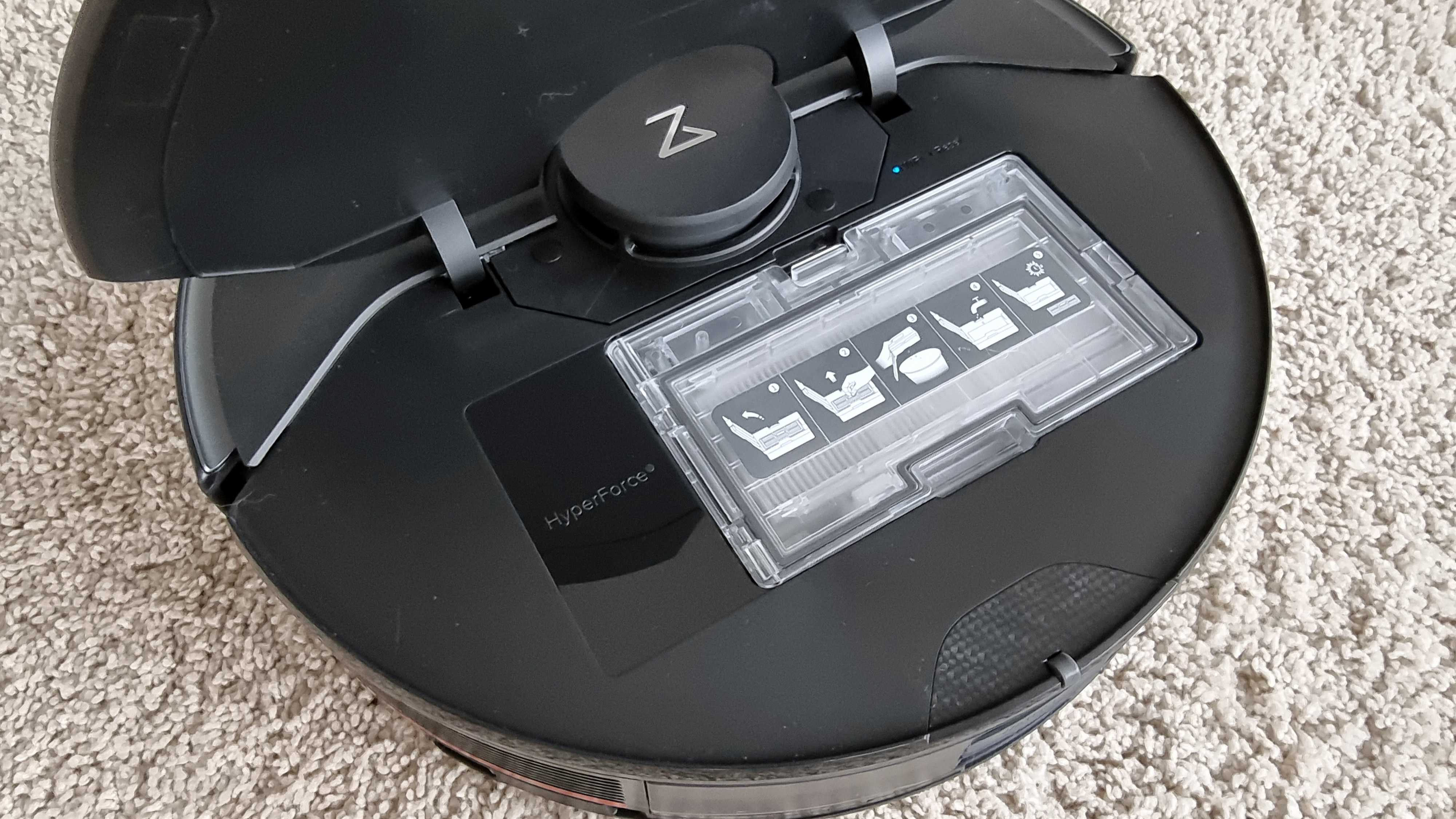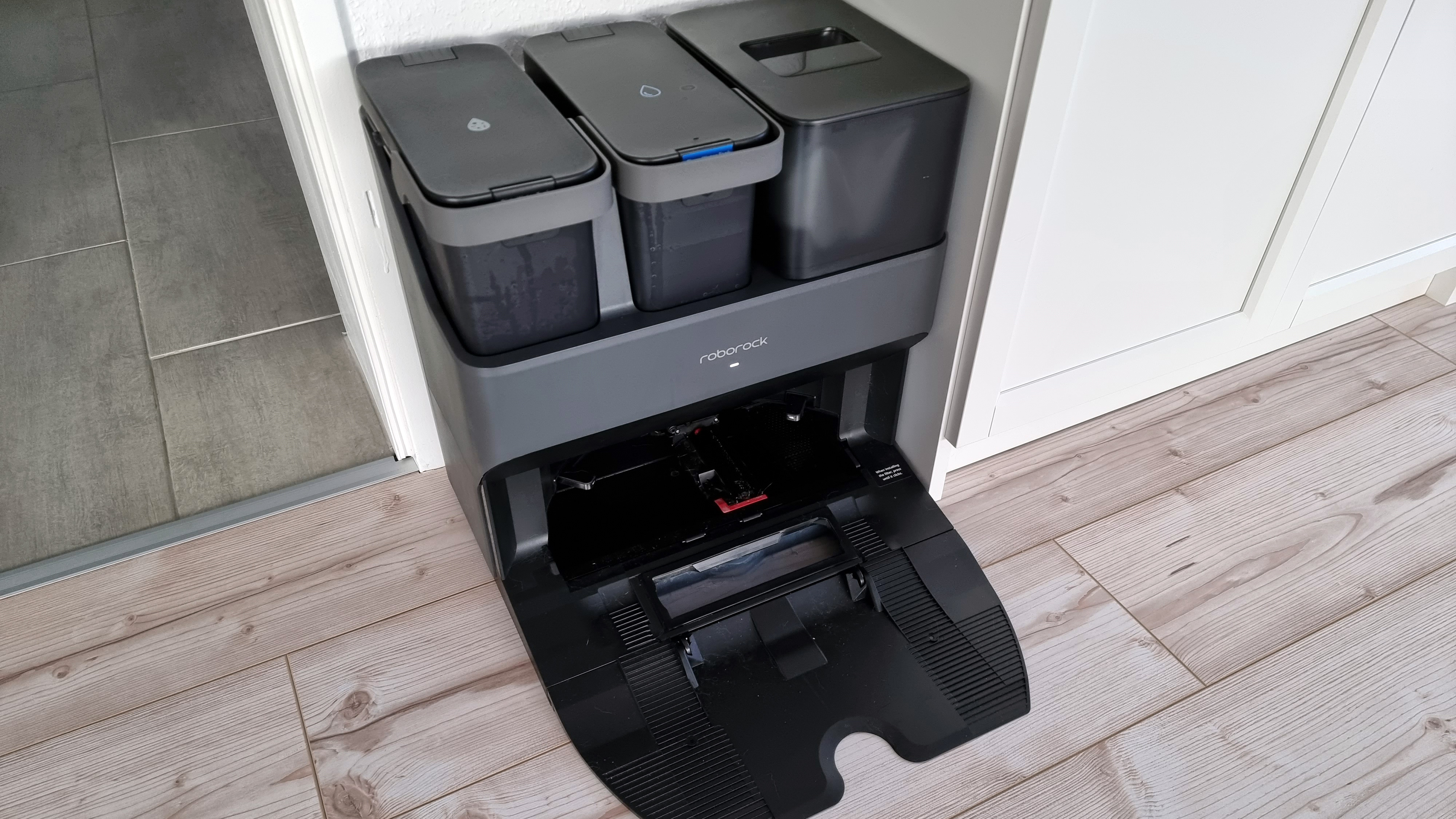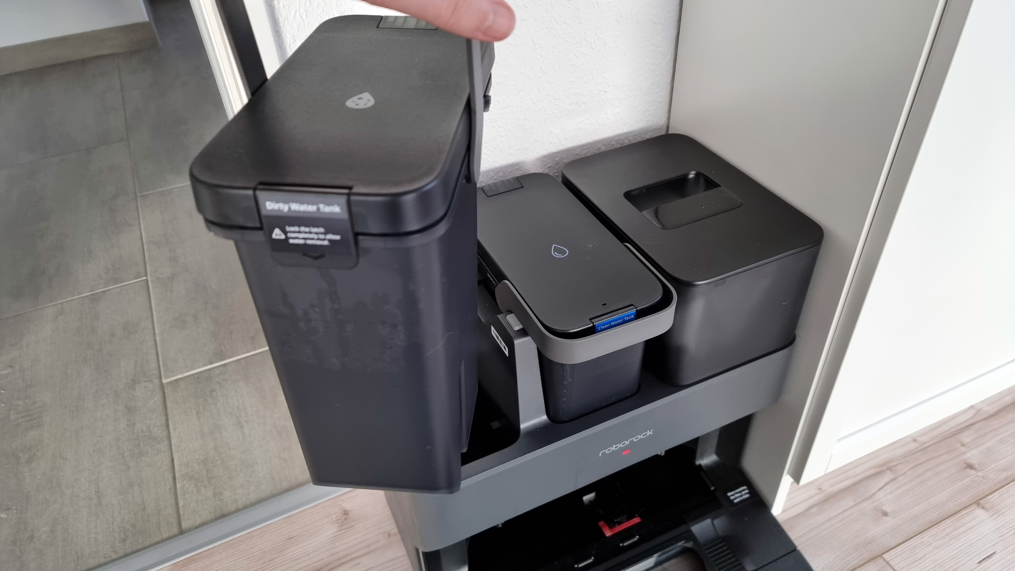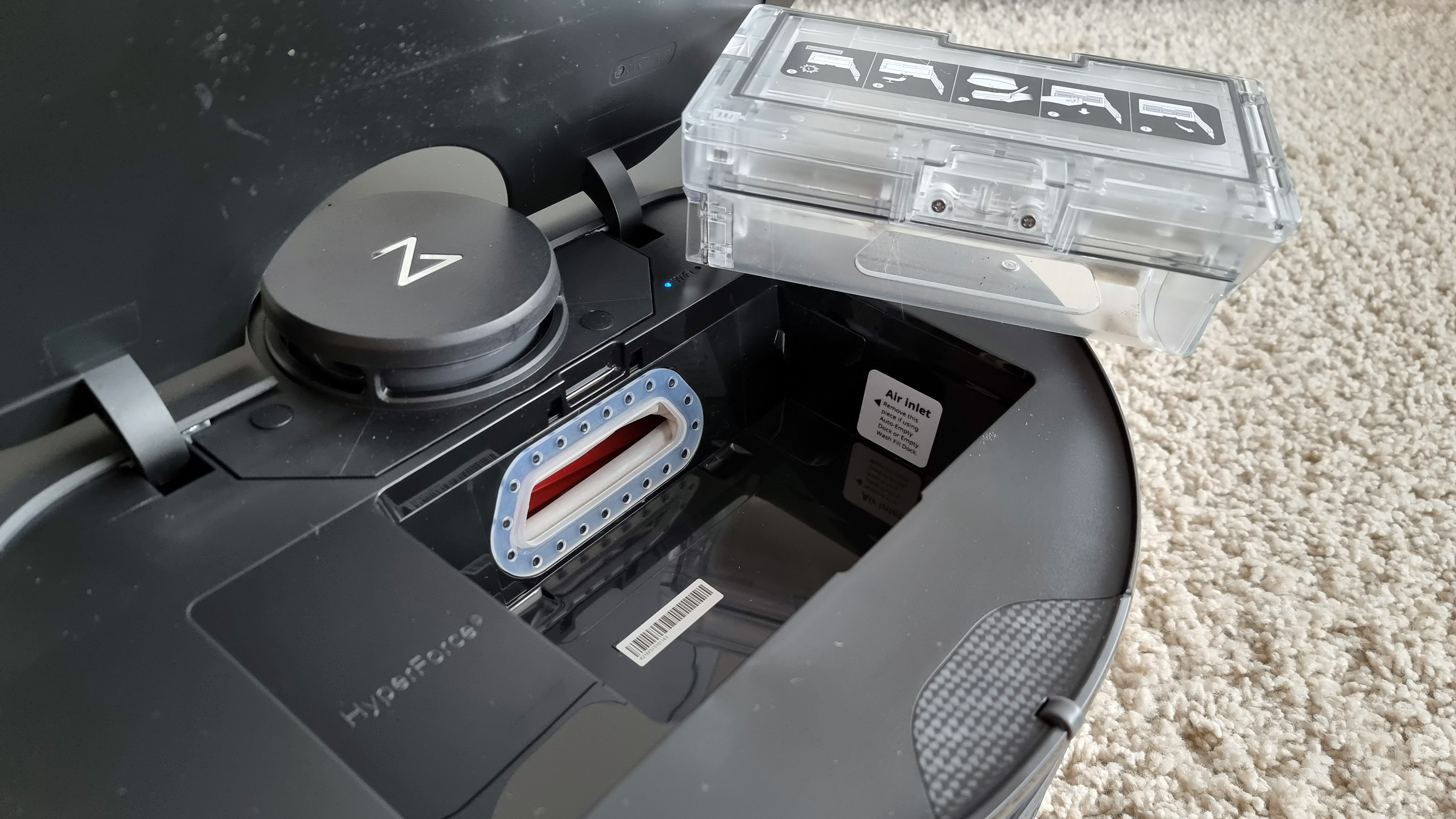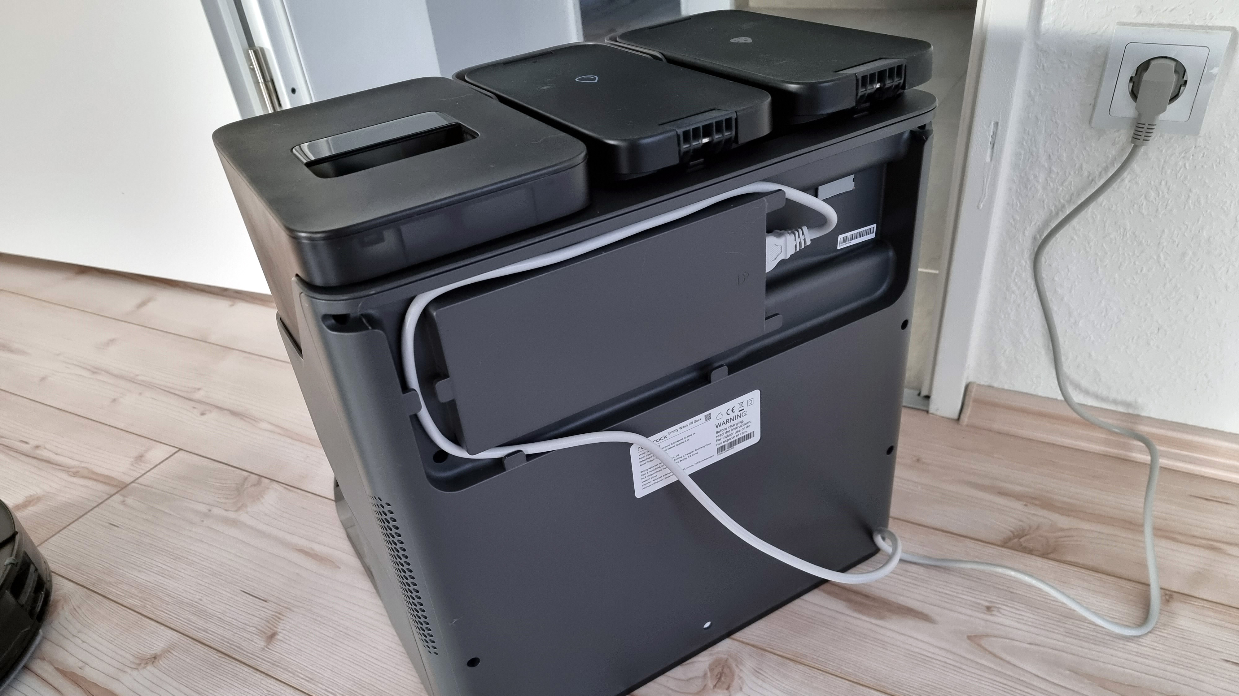 Eine weitere Änderung betrifft den hinten in den Saugroboter eingesteckten Wassertank. Der verfügt nun über ein Einlassventil. Die Ultra-Station reinigt über ihren Frischwassertank nicht nur das Wischtuch, sondern füllt über das Ventil auch den internen Wassertank des Bots auf. Daher macht es auch nichts, dass der nur 200 Milliliter fasst. Warum das Kabel unserer schwarzen Ultra-Station allerdings hellgrau ist, bleibt ein Geheimnis des Herstellers.