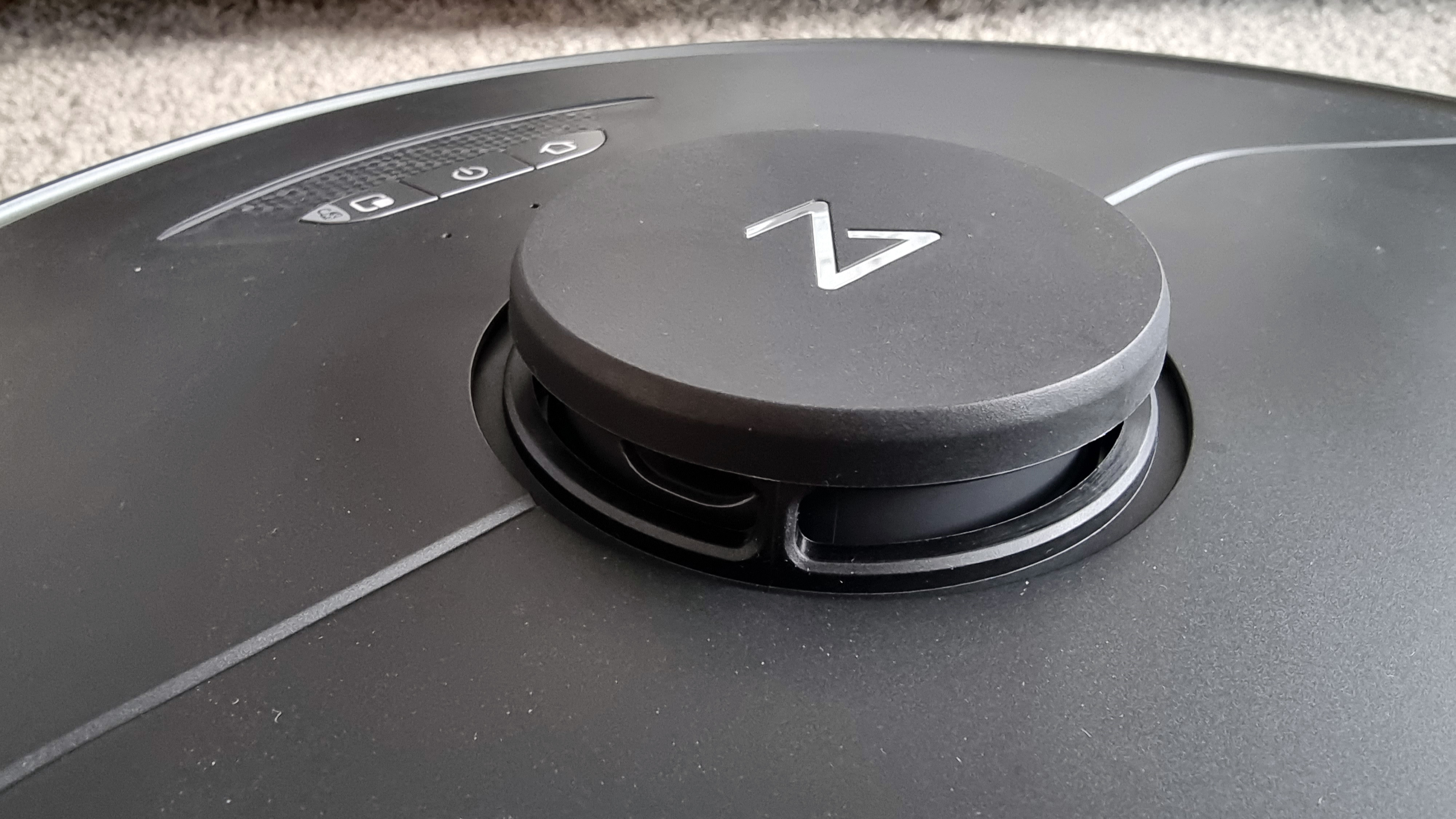 Der Laser-Turm verfügt wieder über einen Bumper, damit sich der Roboter nicht unter Möbeln einklemmt. Bei einer Höhe von fast 10 Zentimeter besteht diese Gefahr bei Laser-navigierten Robotern immer. Der Turm ist wieder leicht nach vorn versetzt und nicht genau mittig auf dem Bot positioniert. Auch die drei Tasten zur direkten Steuerung (Start/Stopp, Rückkehr zur Ladestation und Bereichsreinigung) hat Roborock beibehalten, ebenso den schmalen LED-Streifen, der abhängig von der ausgeführten Aktion des Roboters in unterschiedlichen Farben leuchtet. So glimmt der LED-Streifen vollflächig grün beim Laden, ein blaues Licht wandert – ähnlich dem roten “Scanner” bei KITT, dem schlauen Kult-Auto der 80er-Jahre – während der Navigation hin und her und bei einem Fehler erstrahlt der Streifen in sattem Rot. Neu ist die violette Färbung, wenn der Nutzer direkt auf die Kamera des Saugroboters zugreift, was zusätzlich von kontinuierlichen Sprachansagen begleitet wird.