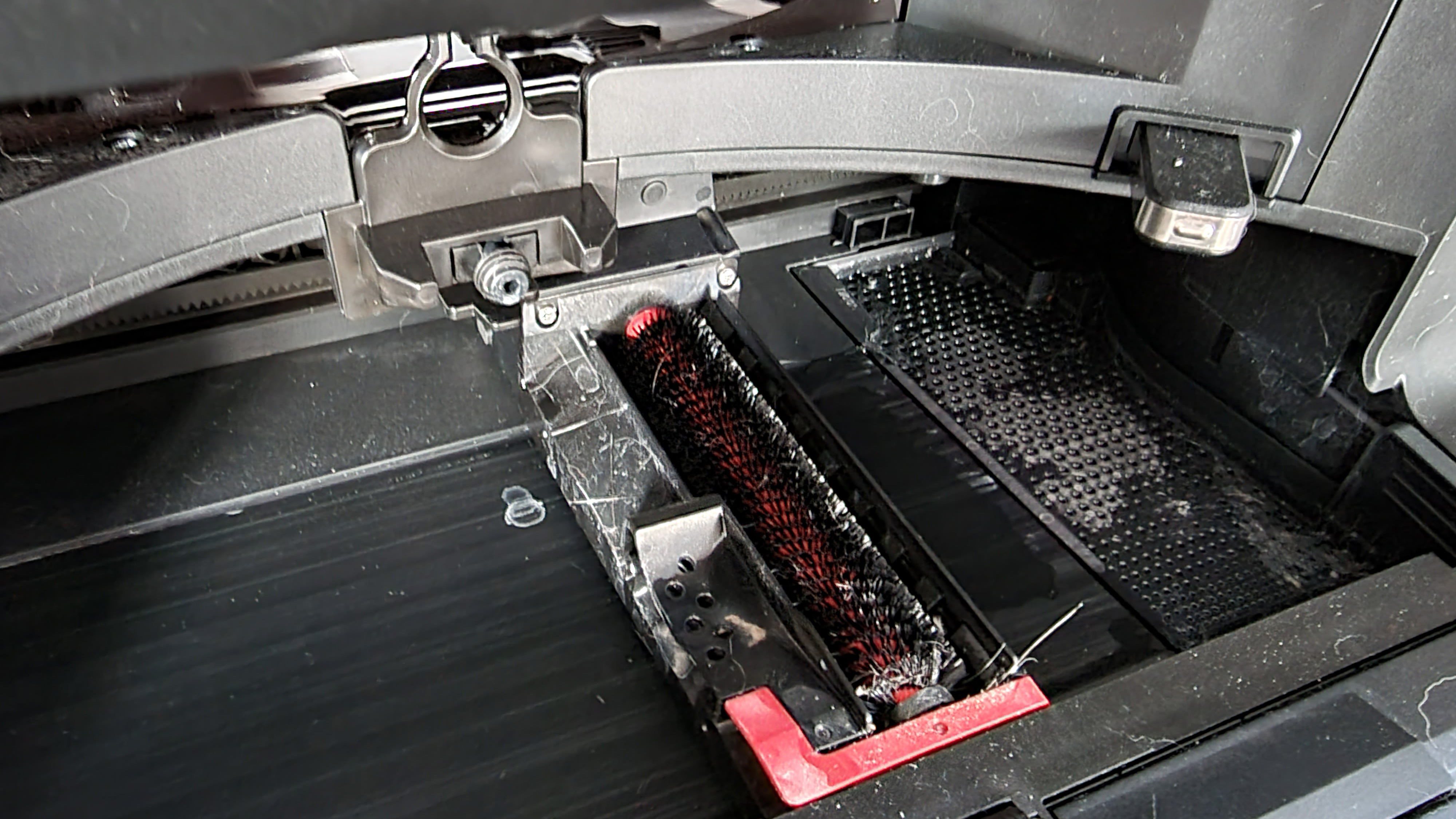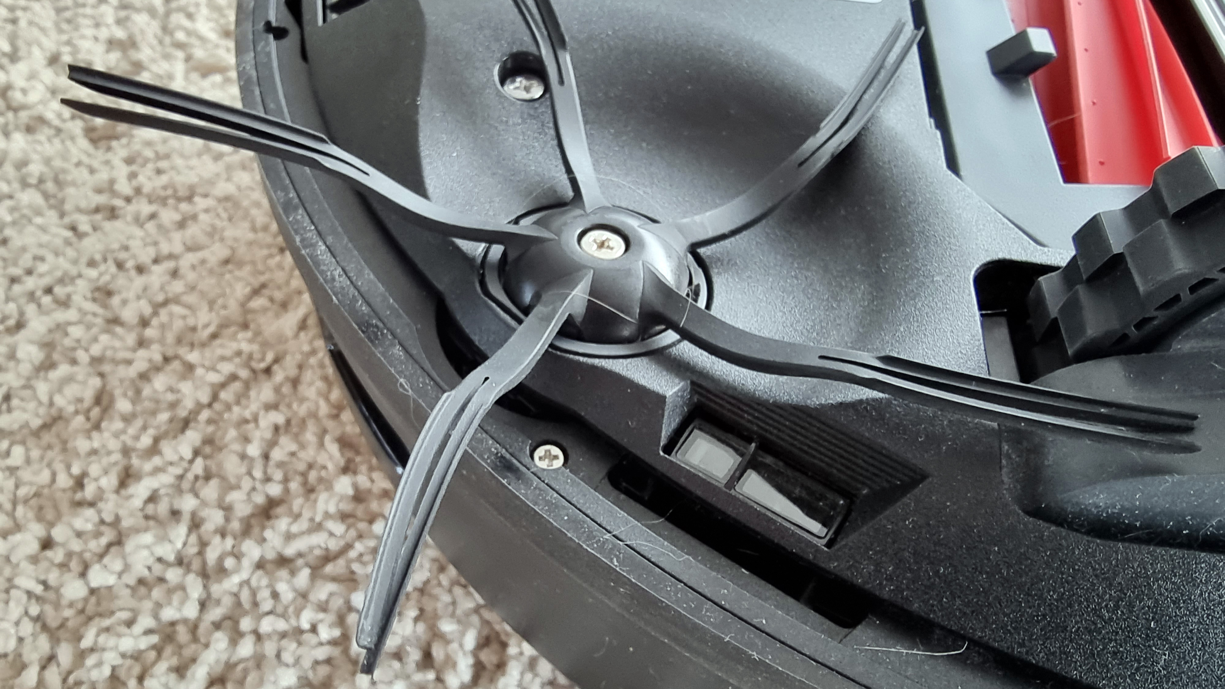 Gegen Abstürze von Treppen oder einer Galerie schützen wieder sechs Sensoren auf der Unterseite, im Test funktioniert das zuverlässig. Die Hauptbürste ist erneut schwimmend gelagert, um Unebenheiten ausgleichen zu können. Sie besteht wieder aus Gummi mit gewundenen Lamellen.