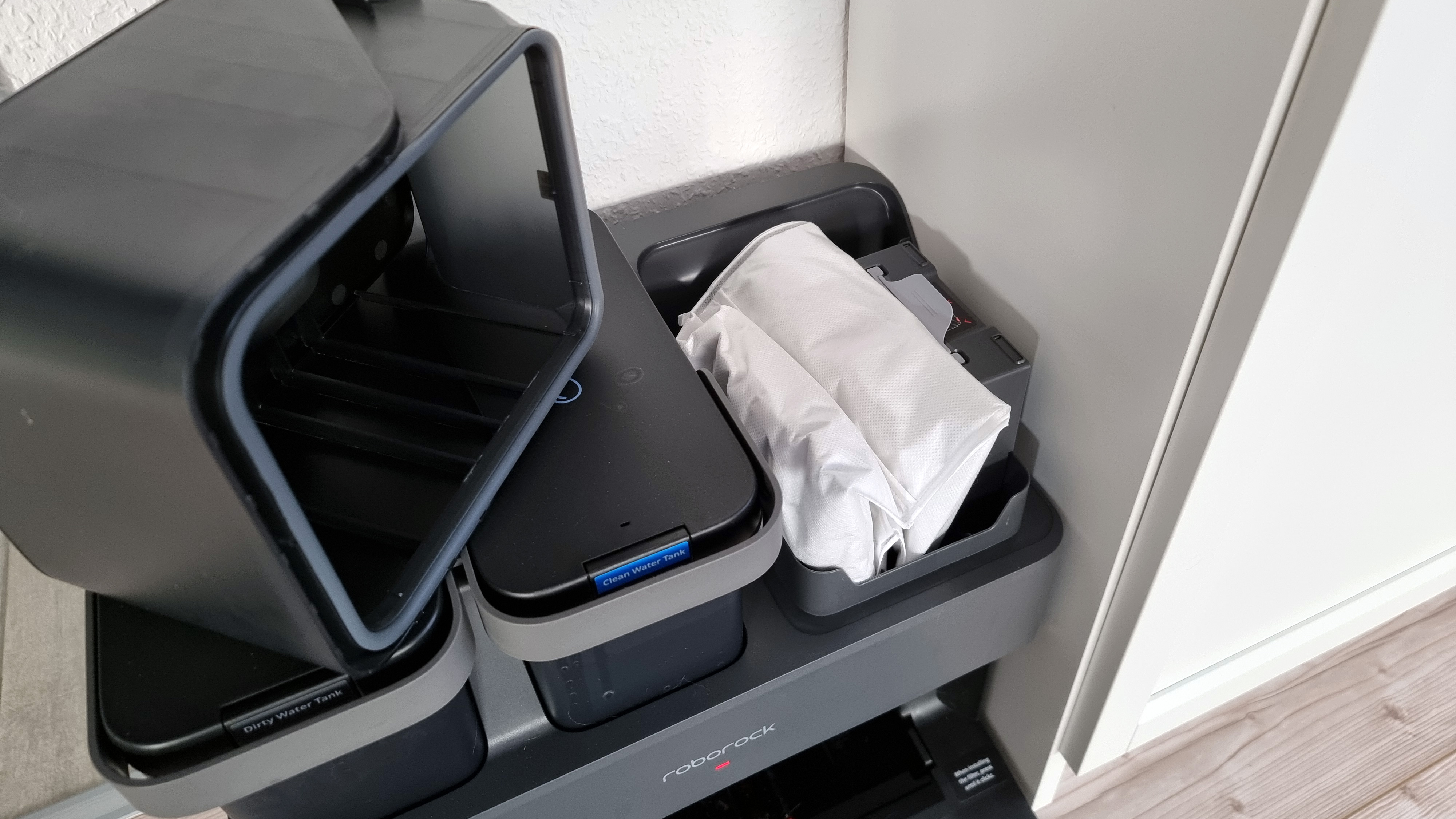 Die Plus-Version kommt statt der kleinen Ladestation mit der Absaugstation des Vorgängers, die entweder beutellos oder mit Staubbeutel betrieben werden kann. Letzteres sorgt zwar im Laufe der Zeit für Kosten durch das Nachkaufen der Beutel, dürfte aber gerade für Allergiker interessant sein. Die Ultraversion ist deutlich massiger, bietet dafür aber nicht nur eine Absaugung, die jetzt allerdings ausschließlich per Beutel funktioniert, sondern darüber hinaus auch über einen Frisch- und einen Abwassertank. Über den Frischwassertank wird nicht nur das Wischtuch gereinigt, sondern auch der interne Wassertank des Saugroboters regelmäßig aufgefüllt. Roborock verspricht, dass ein Beutelwechsel nur alles bis zu 7 Wochen nötig wird, Frisch- und Abwassertank reichen angeblich für 300 Quadratmeter.