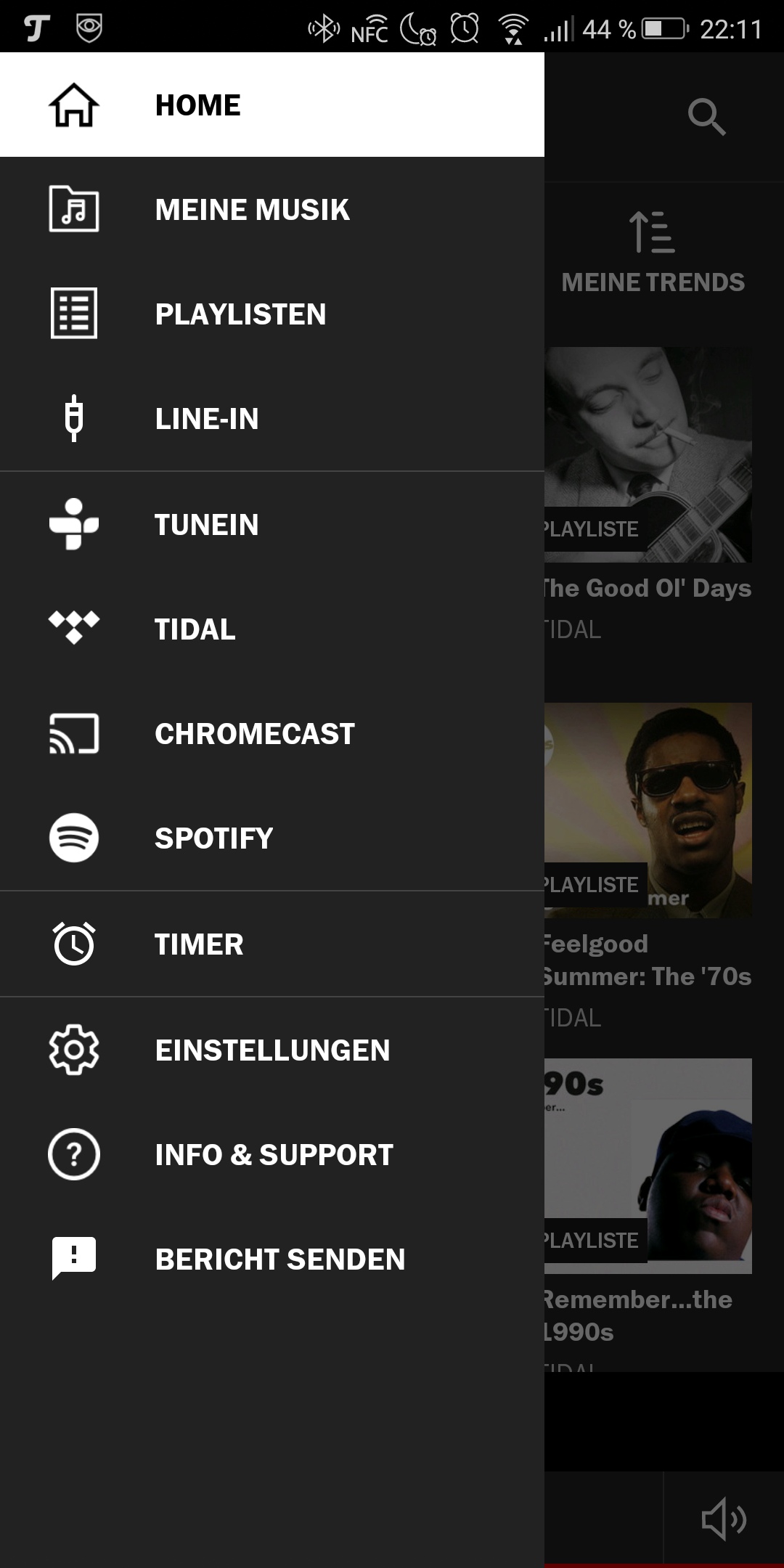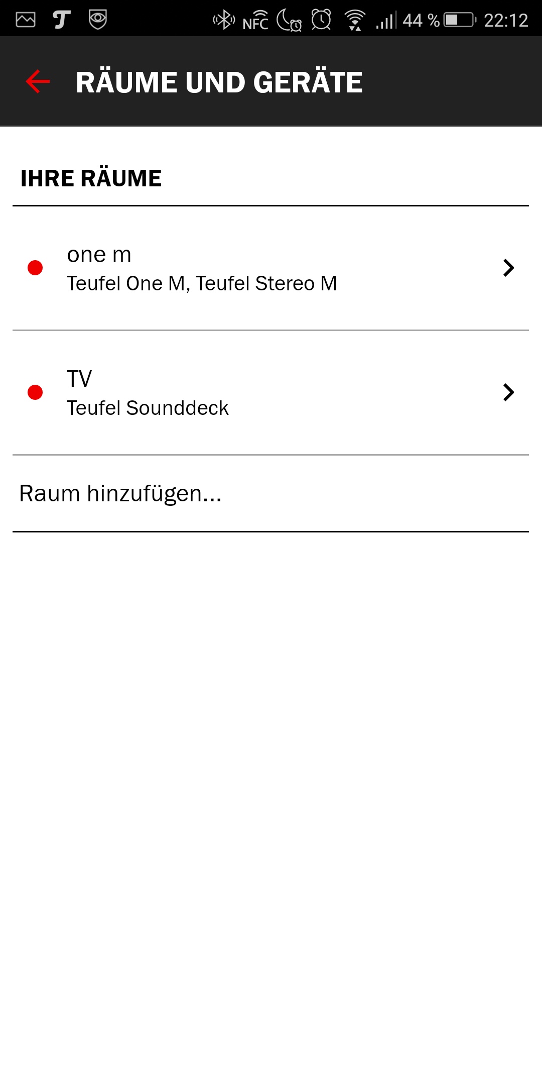 Das zentrale Steuerelement ist die Raumfeld App von Teufel für Android und iOS. Sie ist erfreulich schnell und einfach zu bedienen. Über das Sandwich-Menü kann man die Musikquelle oder den Streaming-Dienst auswählen. Hat man mehrere Raumfeld-Geräte in unterschiedlichen Räumen definiert, kann man mit einem Wisch nach links und rechts durch die verschiedenen Geräte wischen. Die gewählte Musik oder der Radiosender spielt dann beim jeweils aktivierten System.