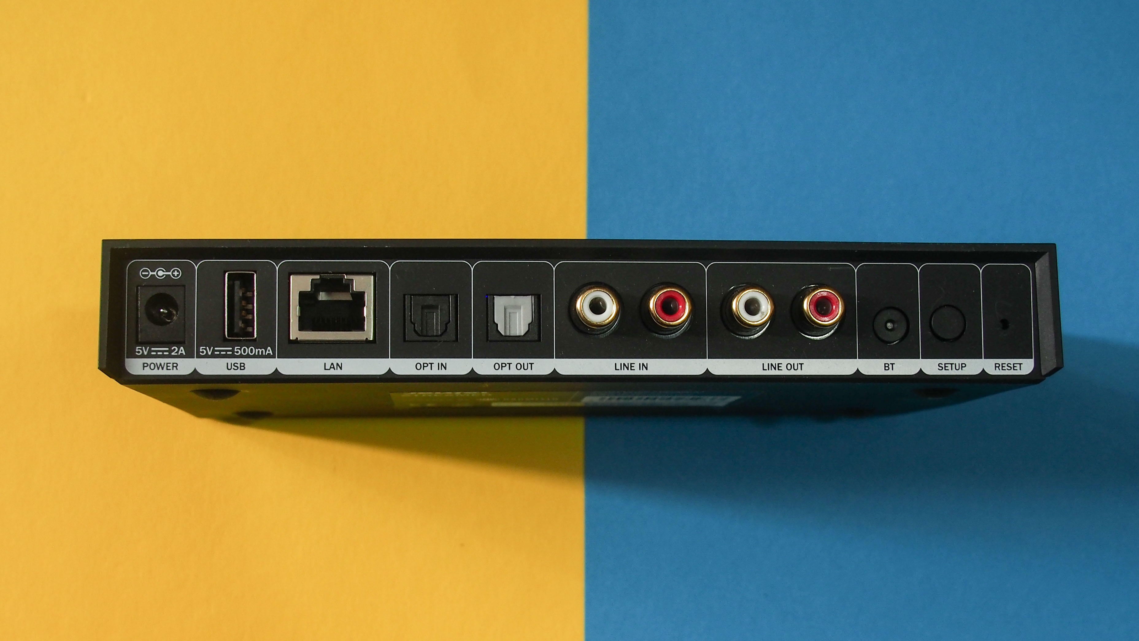 Mitgeliefert wird ein recht großes Netzteil zur Stromversorgung und ein Stereo-Cinch-Kabel, doch neben den damit bedienbaren analogen Ein- und Ausgängen hat der Streamer noch einen optischen digitalen SPDIF-Ein- und Ausgang mit bis zu 96 kHz und 16 Bit, Bluetooth (nur als Eingang) und einen USB-Port zum Abspielen darauf gespeicherter Dateien. Mit dem Netzwerk kommuniziert er neben WLAN auf 2,4 und 5 GHz auch per Ethernet-Anschluss.