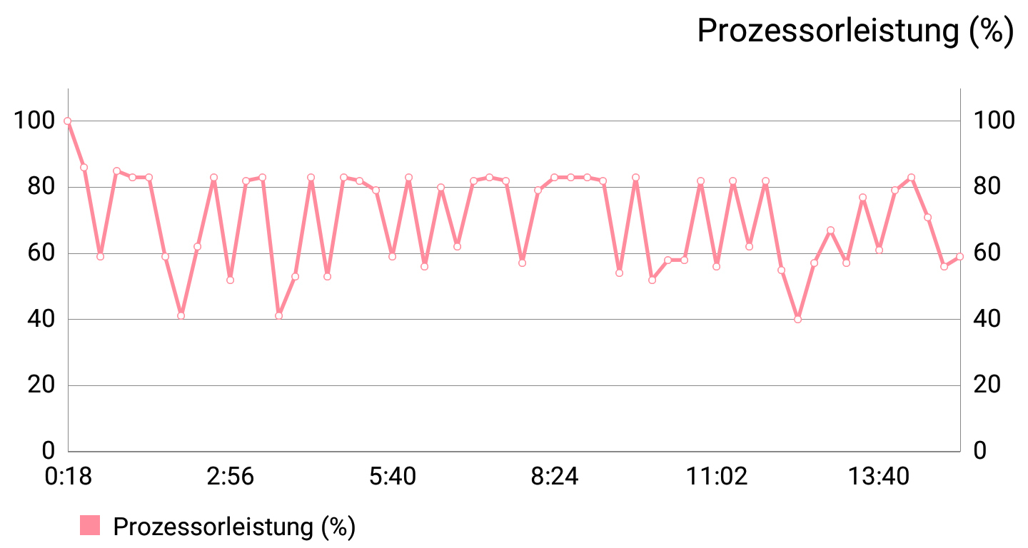 Im 15 minütigen Belastungstest reagierte das LG G7 Thinq instabil: Schon nach 18 Sekunden Laufzeit kam der erste Leistungseinbruch. Bei 2:06 sank die Leistung des Systems auf 40 Prozent, bevor es sich erholte. Dieses Verhalten ist untypisch für Flagship-Smartphones. Souverän dagegen verhielt sich die Temperatur des Akkus: Sie stieg von 27 auf lediglich 32 Grad Celsius.