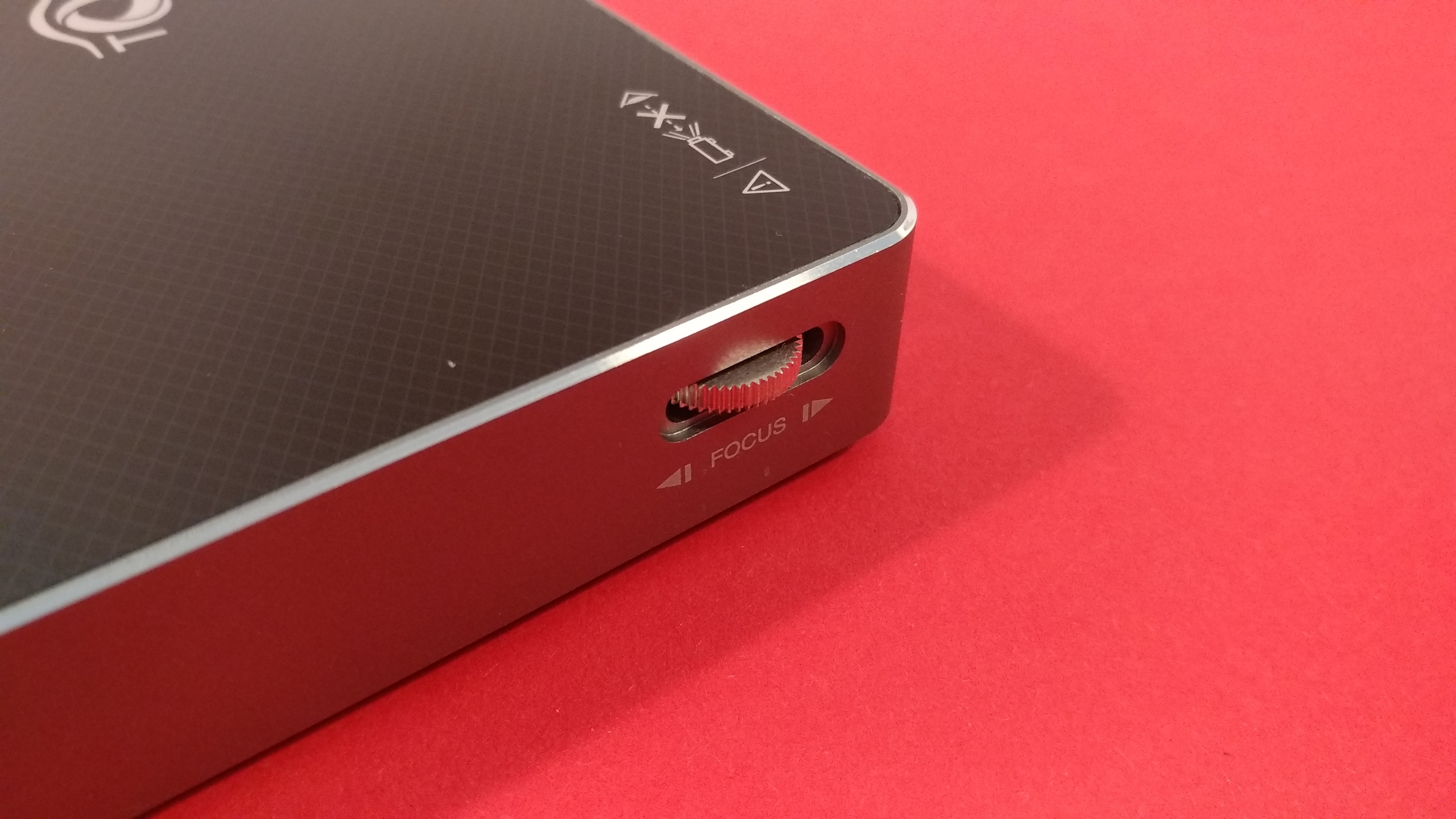 Der Lautsprecher tönt nach hinten aus den entsprechenden Aussparungen heraus, vorne sind Lüftungsschlitze und die Linse untergebracht. Ein Drehrädchen zum Scharfstellen ist an der linken Seite des Gerätes. Trotz des verhältnismäßig geringen Preises wirkt der Beamer mit rundum laufendem Aluminiumrahmen und Ober- und Unterseite aus Kunststoff solide und zeigt sich gut verarbeitet.