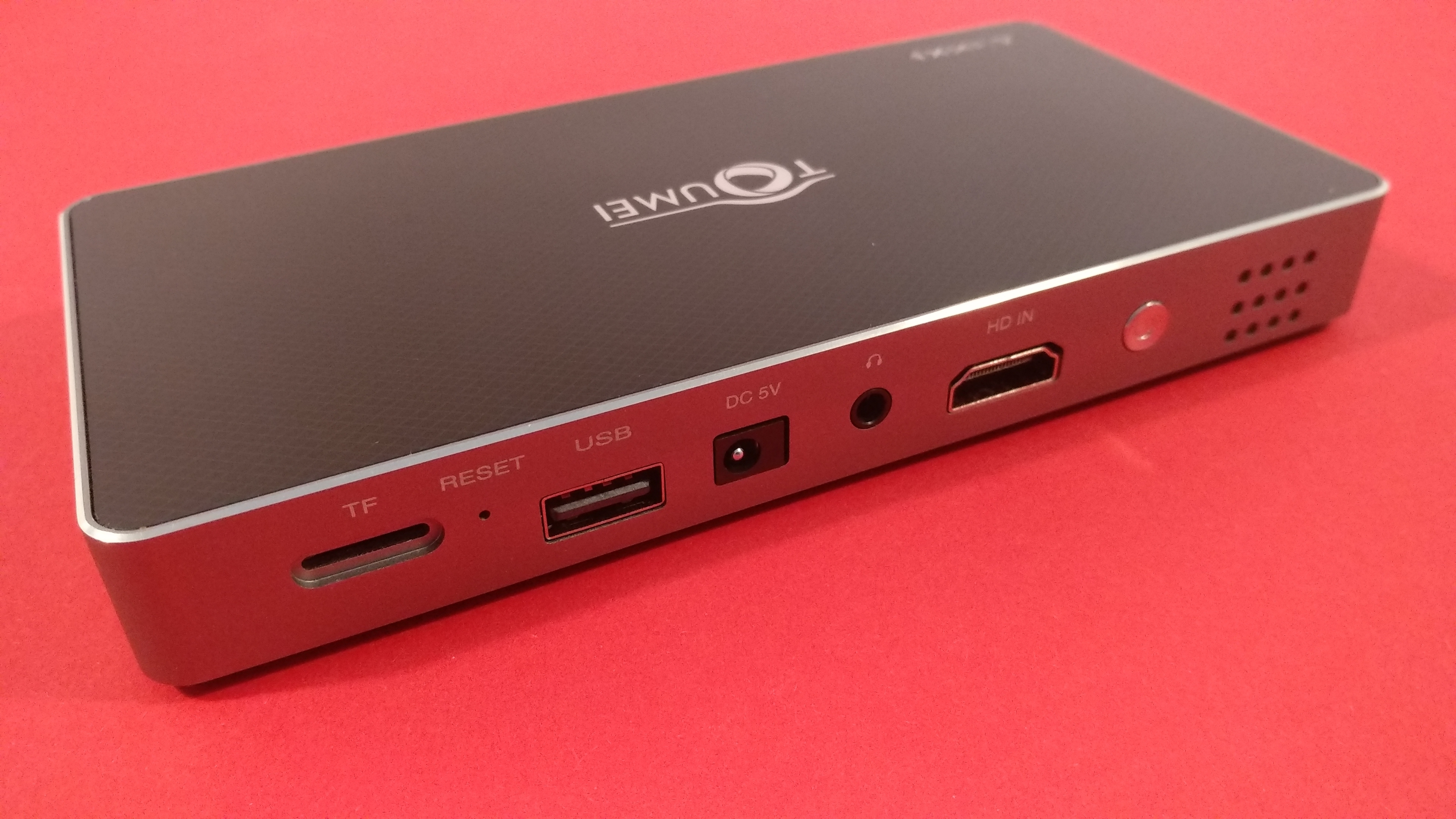 Mit seinen Abmessungen von 158 × 80 × 18 mm und seinem Gewicht von 265 g ist der Toumei C800S ein kompaktes Gerät, das sich zur Not auch in der Hosentasche verstauen lässt. Die Oberseite besteht aus schwarzem hochglänzendem Kunststoff mit Herstellerlogo in der Mitte. Auf der Rückseite des Beamers finden sich der Einschalter, ein HDMI-Eingang, einen Audio-Ausgang (3,5 mm) ein USB-Port, ein Micro-SD-Kartenslot und der Anschluss für das Netzteil. Auf der mit vier Kunststofffüßchen bestückten Unterseite gibt es ein Gewinde zur Befestigung am im Lieferumfang befindlichen Mini-Stativ.