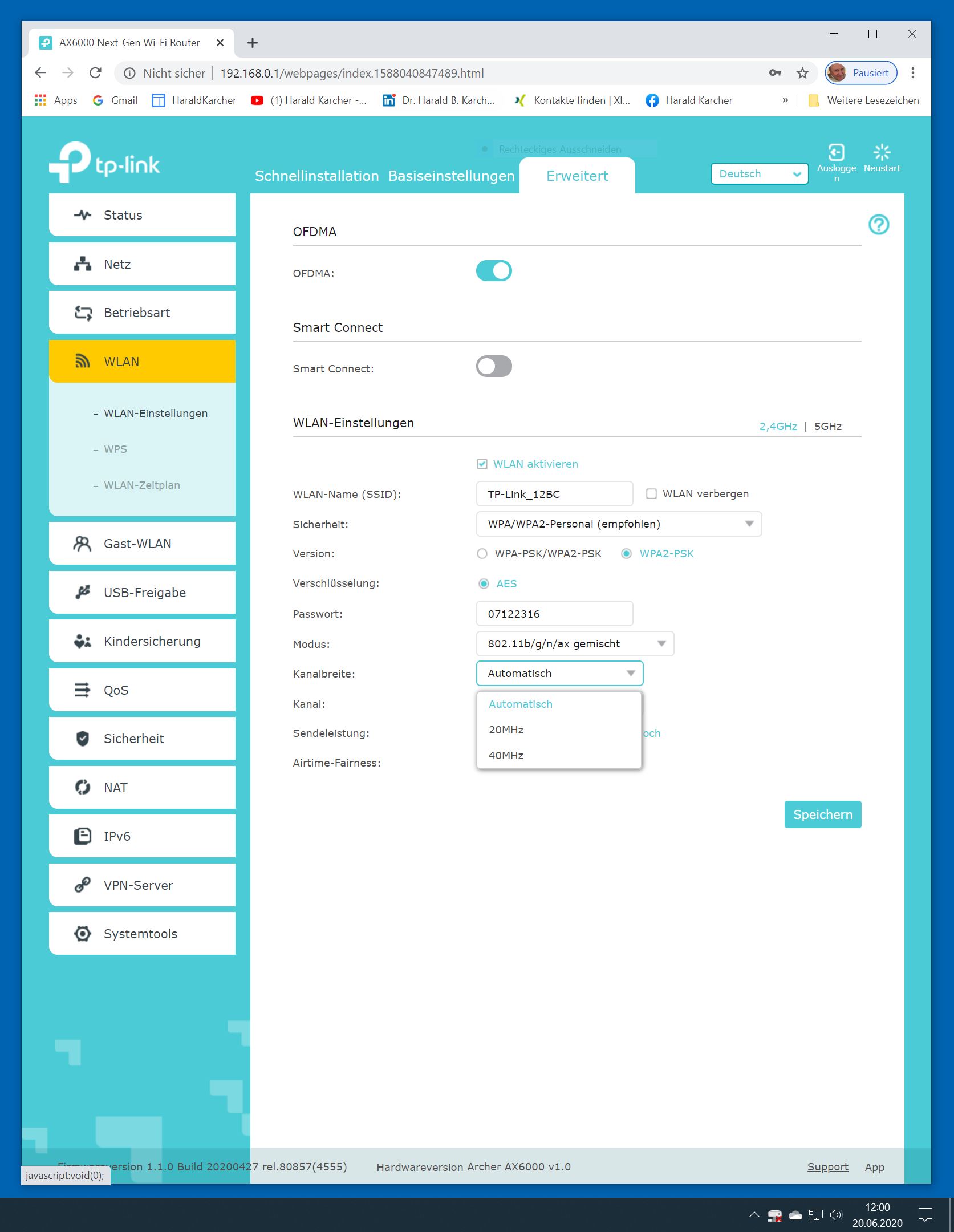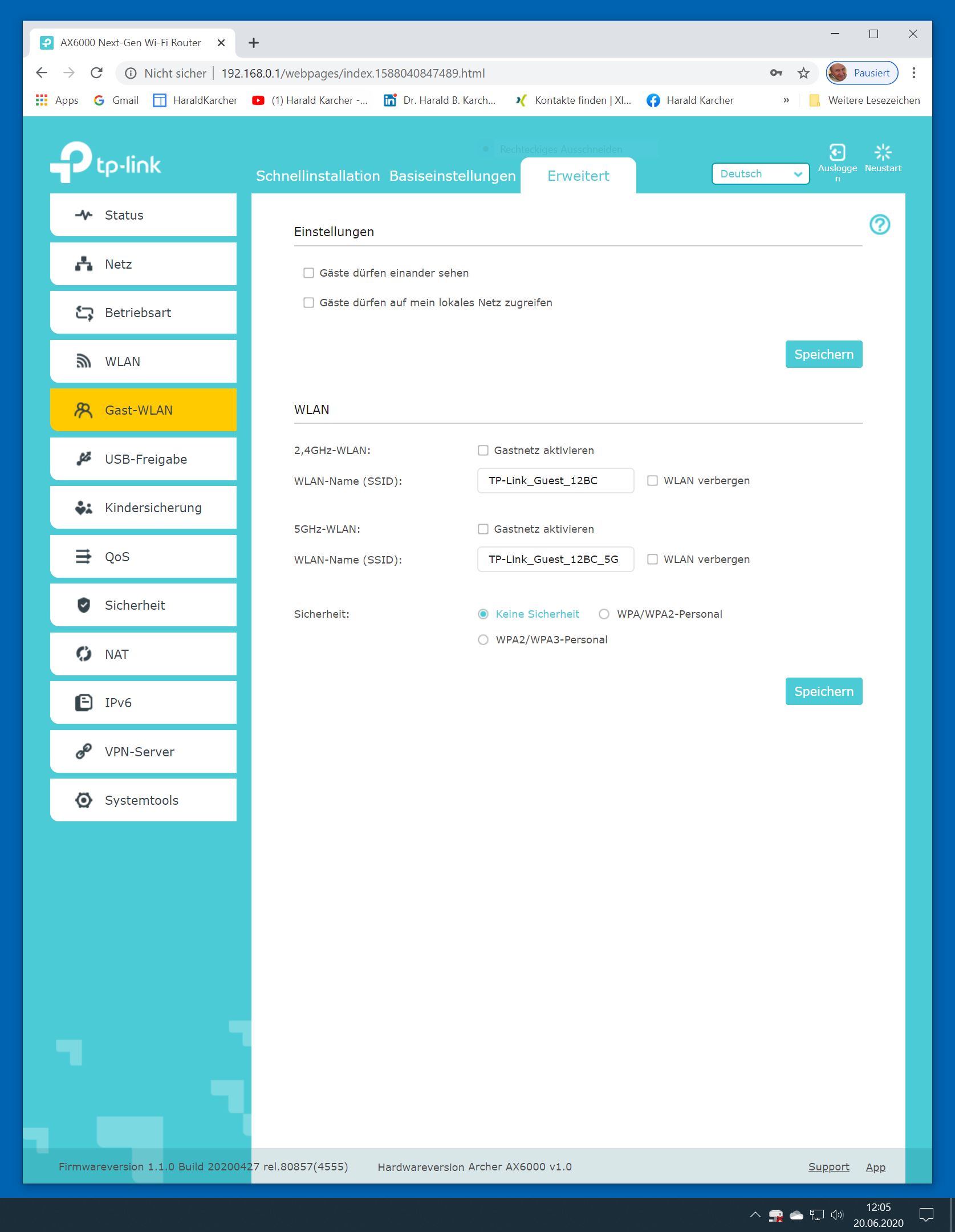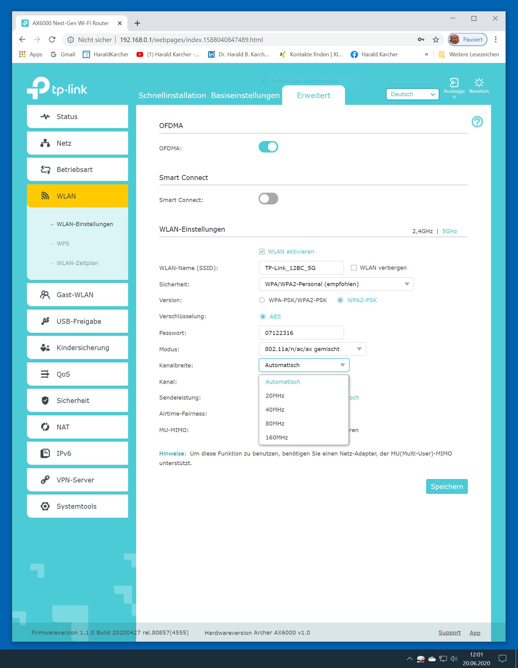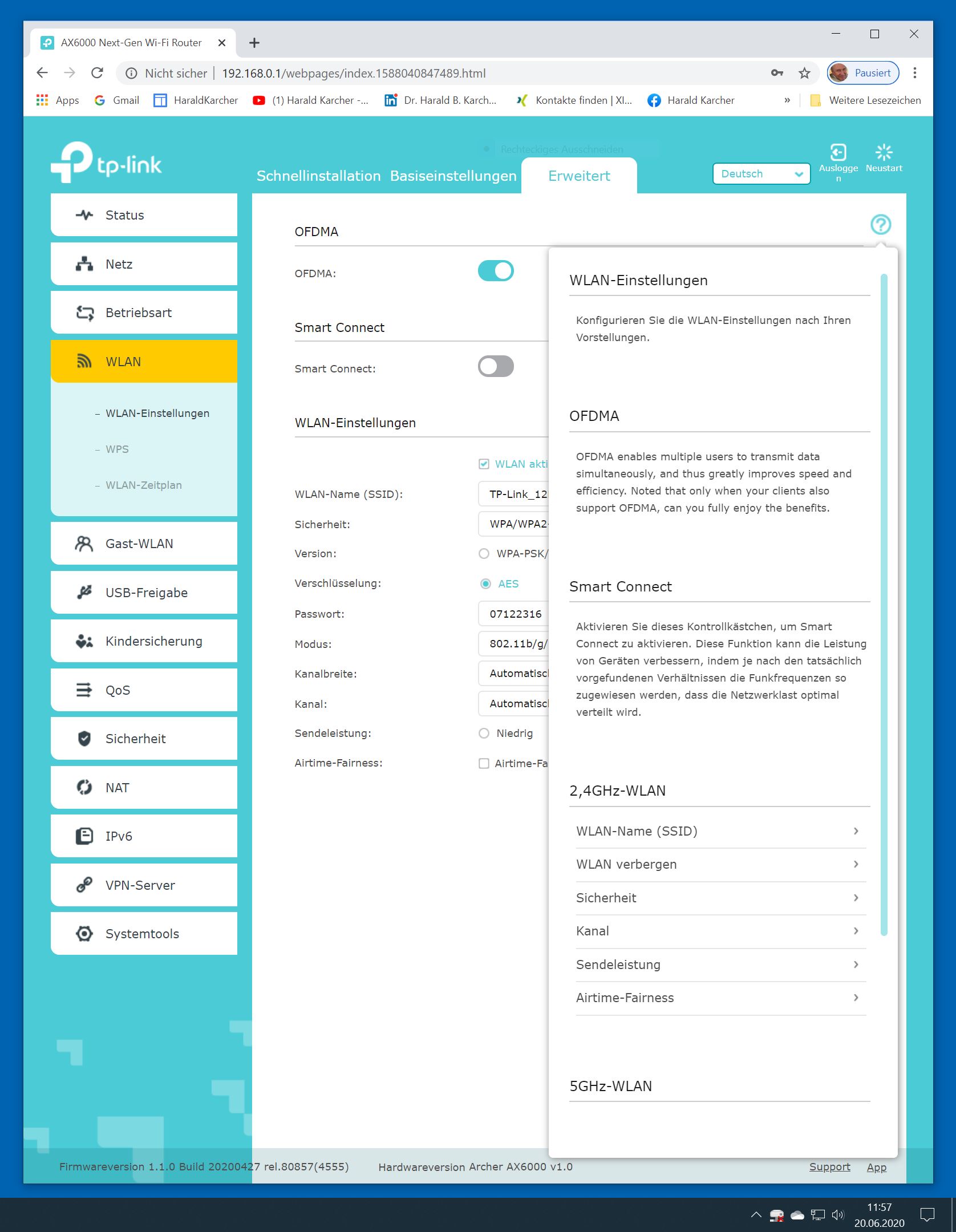 Im WLAN-Bereich sendet der Router ab Werk zwei getrennte SSID-Netzwerknamen für 2,5 und 5 GHz. Wir fanden das goldrichtig, zumal auch in unserer Testwohnung das 5-GHz-Band fast immer weitaus bessere Messwerte bringt als das 2,4-GHz-Band. Deshalb legen wir gerne langsame Geräte wie WLAN-Drucker in das 2,4-GHz-Band. Schnelle und moderne dagegen vorzugsweise in den 5-GHz-Bereich. Viele Hersteller predigen zwar seit 2017 den vermeintlich unschlagbaren Komfort durch eine einzige Single-SSID auf beiden Frequenz-Bändern. Allerdings ist das in der Praxis häufig wenig brauchbar. Oft bleiben die WLAN-Geräte im untersten Gang bei 2,4 GHz kleben. Hier wird WLAN-Speed verschenkt. Ebenfalls positiv ist, dass der Archer AX6000 nach einem Firmware-Update WPA3 bereitstellt.
