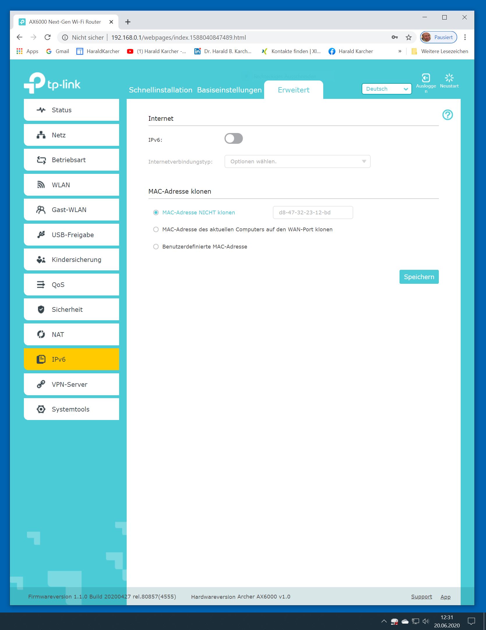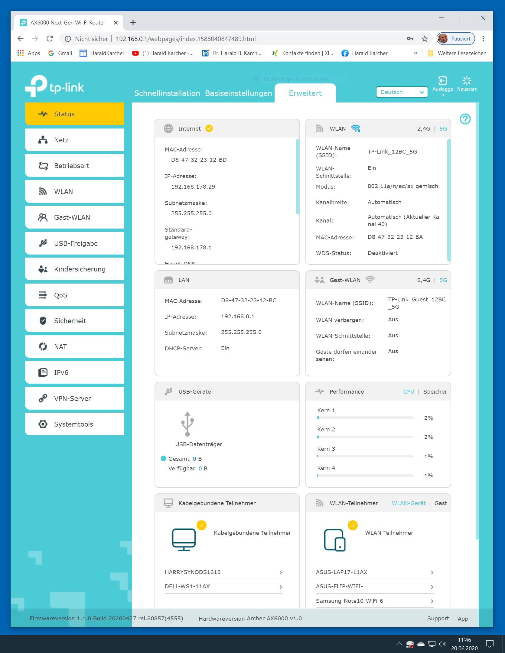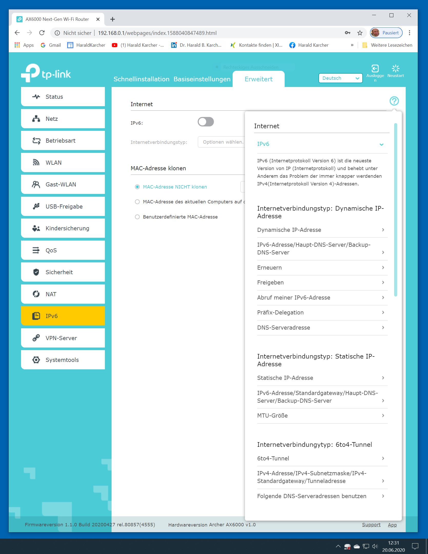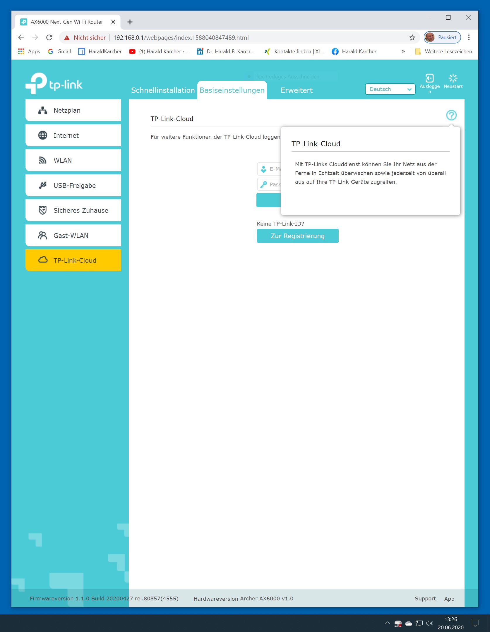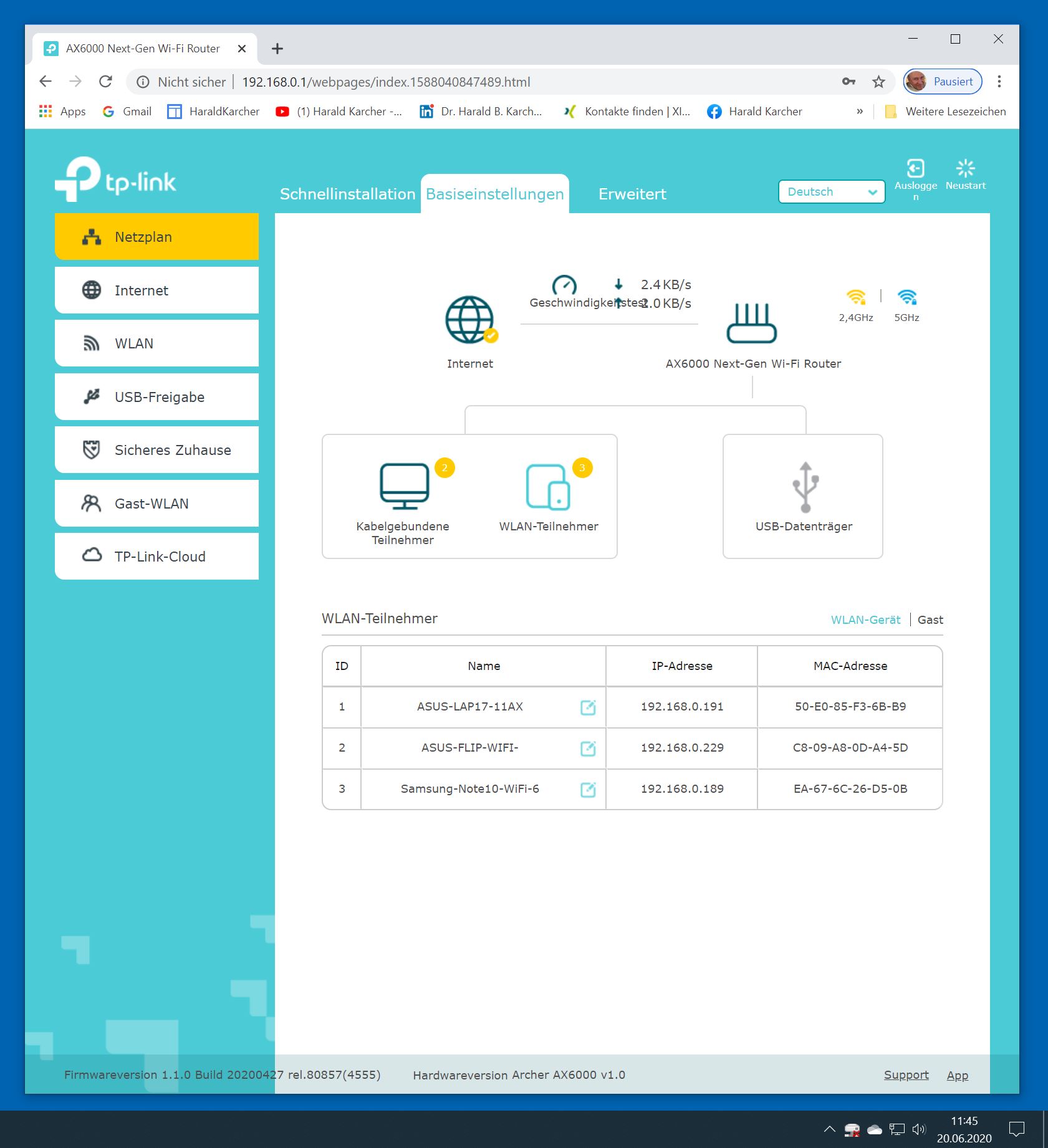 Der TP-Link Router Archer AX6000 lässt sich per Browser am Rechner oder per App am Smartphone einrichten. Via Browser stehen mehr Funktionen zur Verfügung als per Handy-App. Wir dokumentieren hier nur die Browser-Version. Über die aktuelle IP oder die URL http://tplinkwifi.net landen wir in der Konfiguration des Routers. Nach Umstellung von Englisch auf Deutsch bot er folgende Optionen: