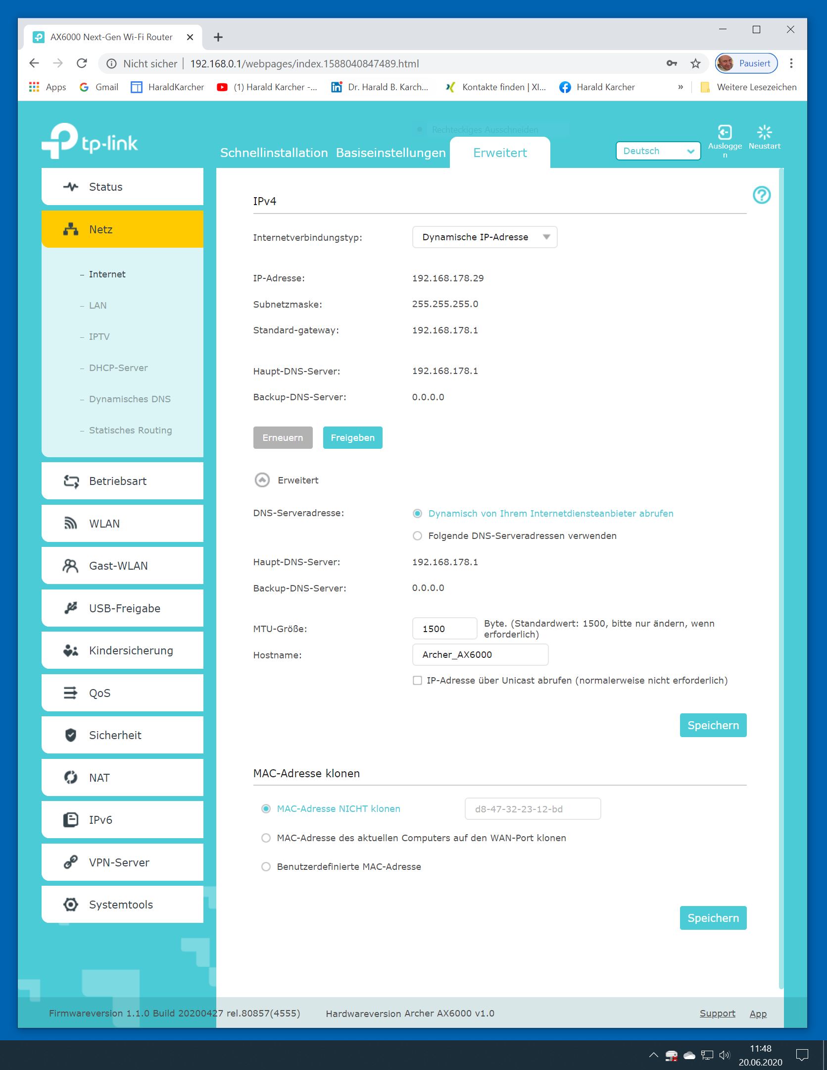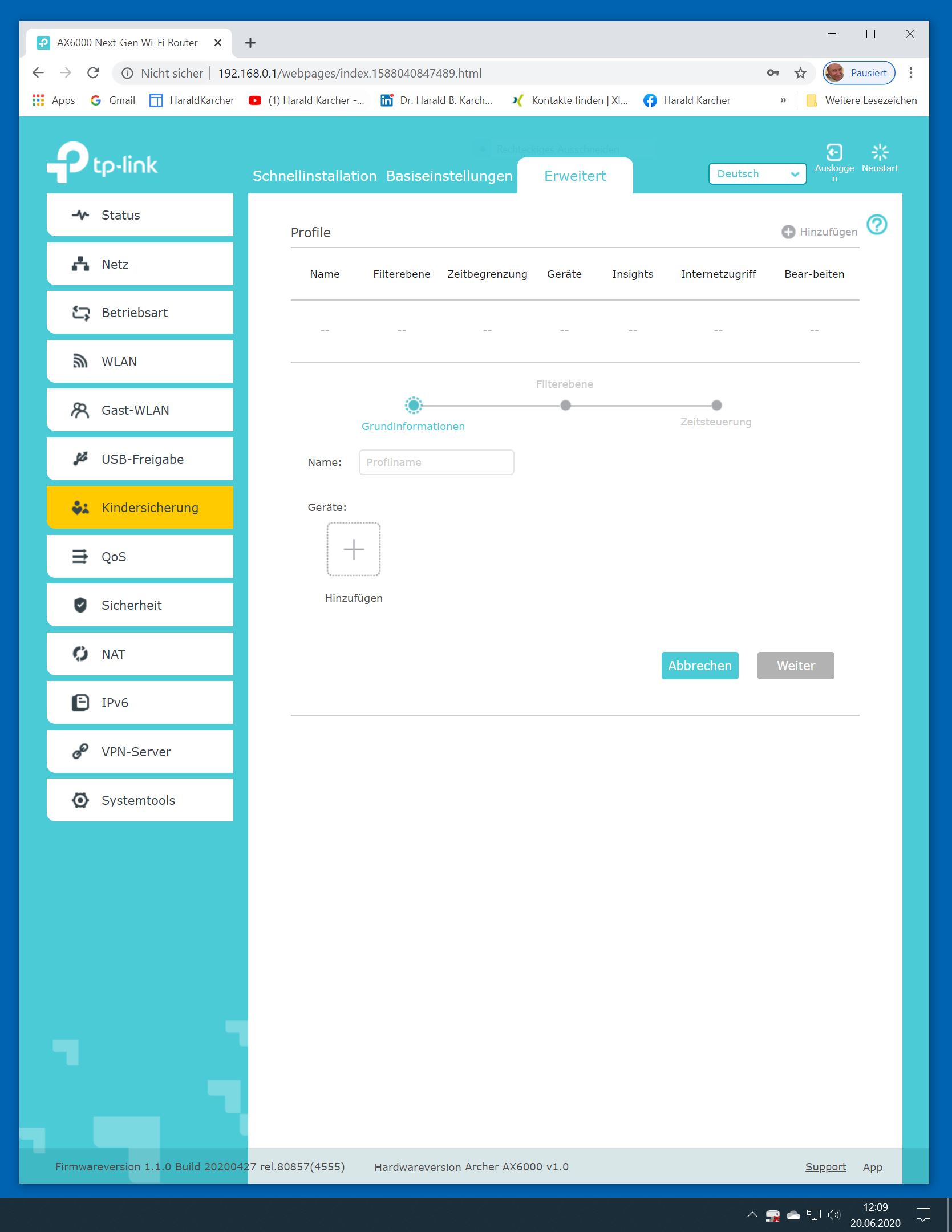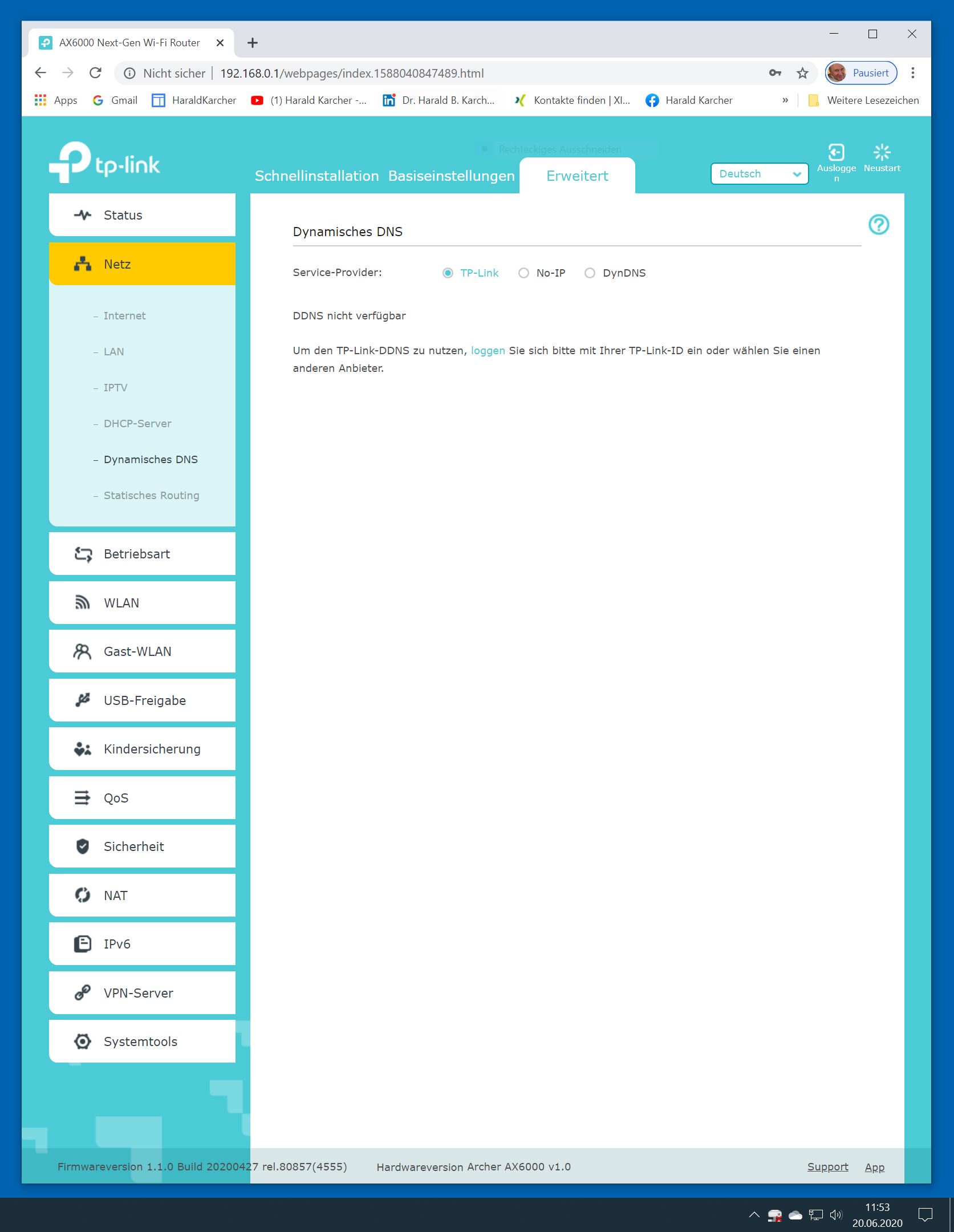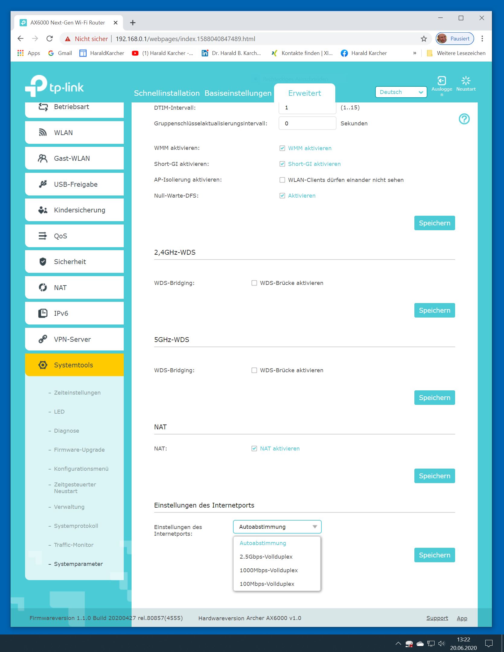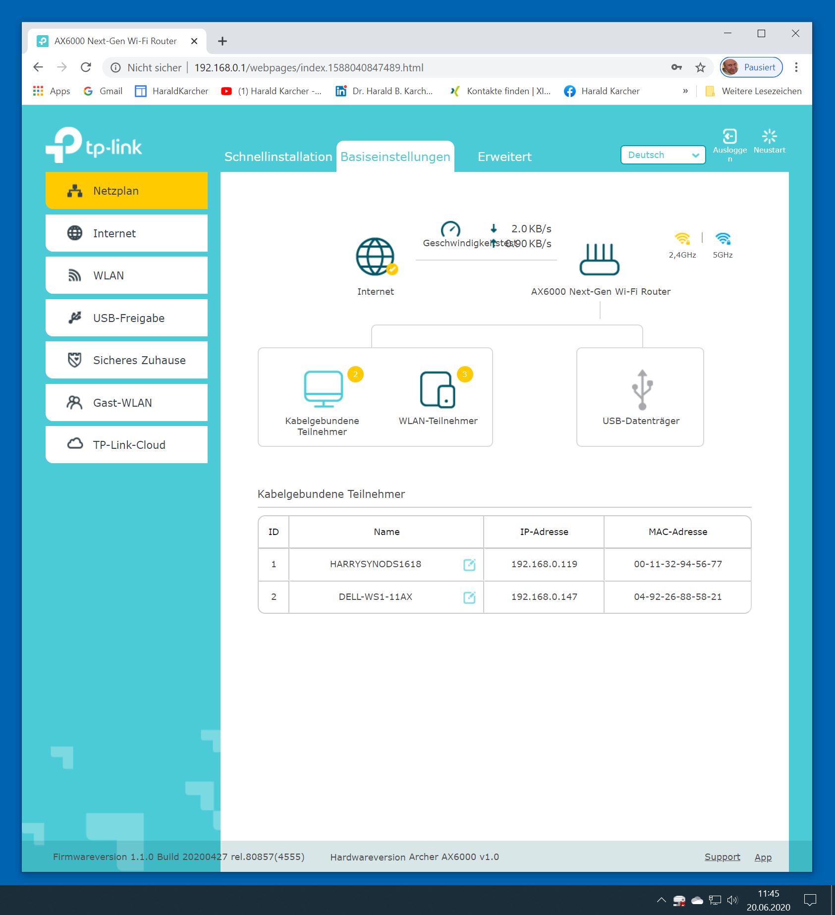 Der TP-Link Router Archer AX6000 lässt sich per Browser am Rechner oder per App am Smartphone einrichten. Via Browser stehen mehr Funktionen zur Verfügung als per Handy-App. Wir dokumentieren hier nur die Browser-Version. Über die aktuelle IP oder die URL http://tplinkwifi.net landen wir in der Konfiguration des Routers. Nach Umstellung von Englisch auf Deutsch bot er folgende Optionen: