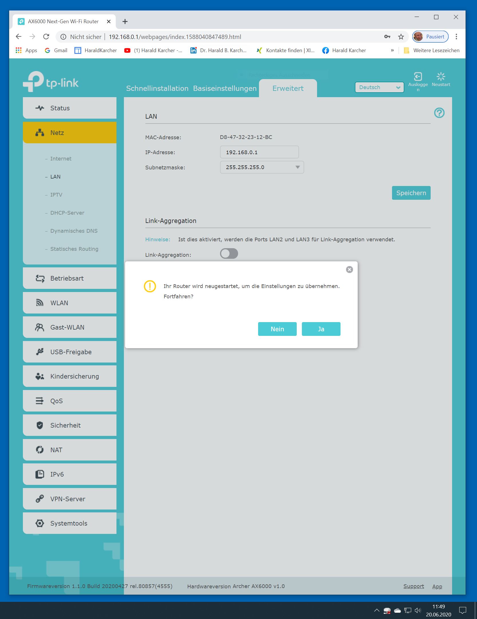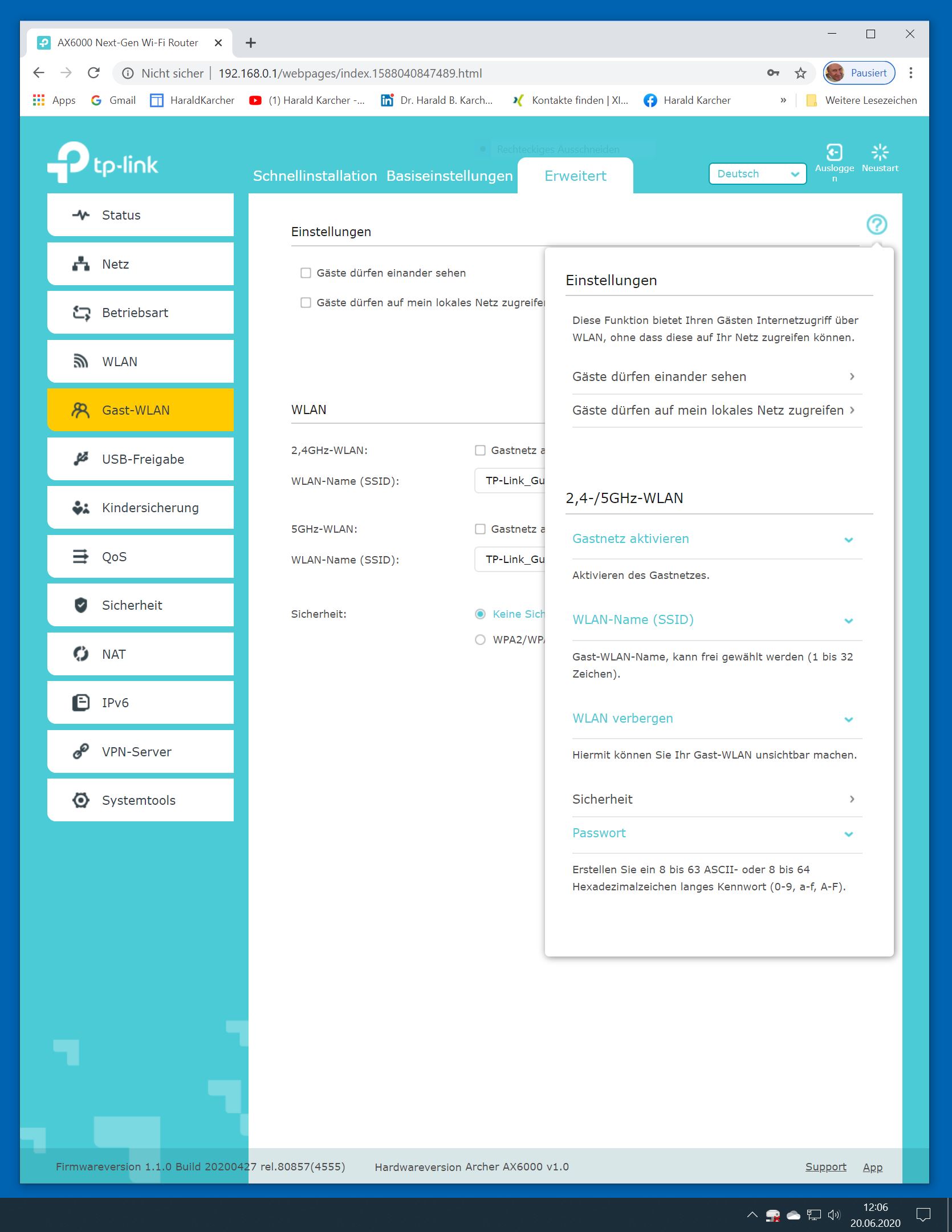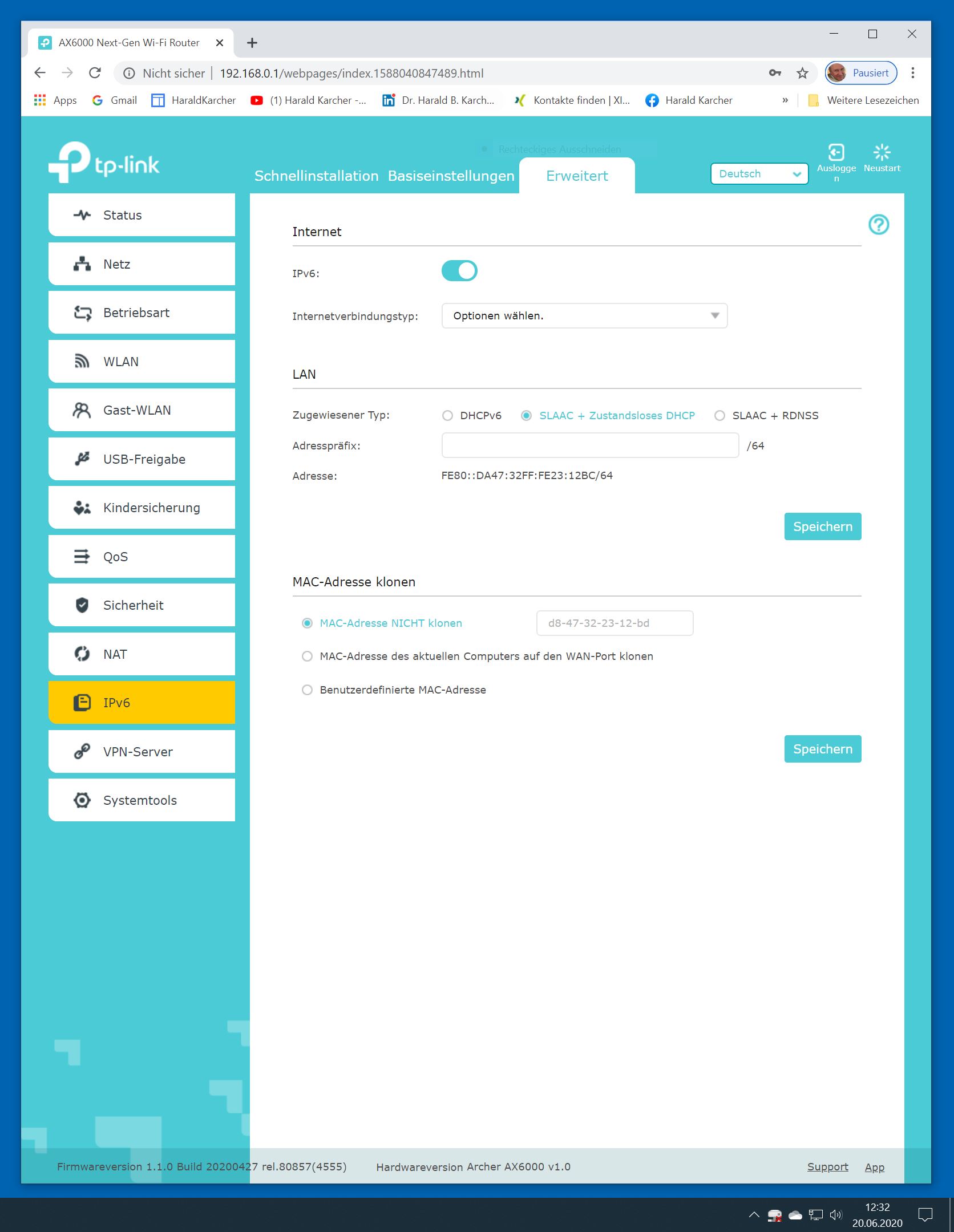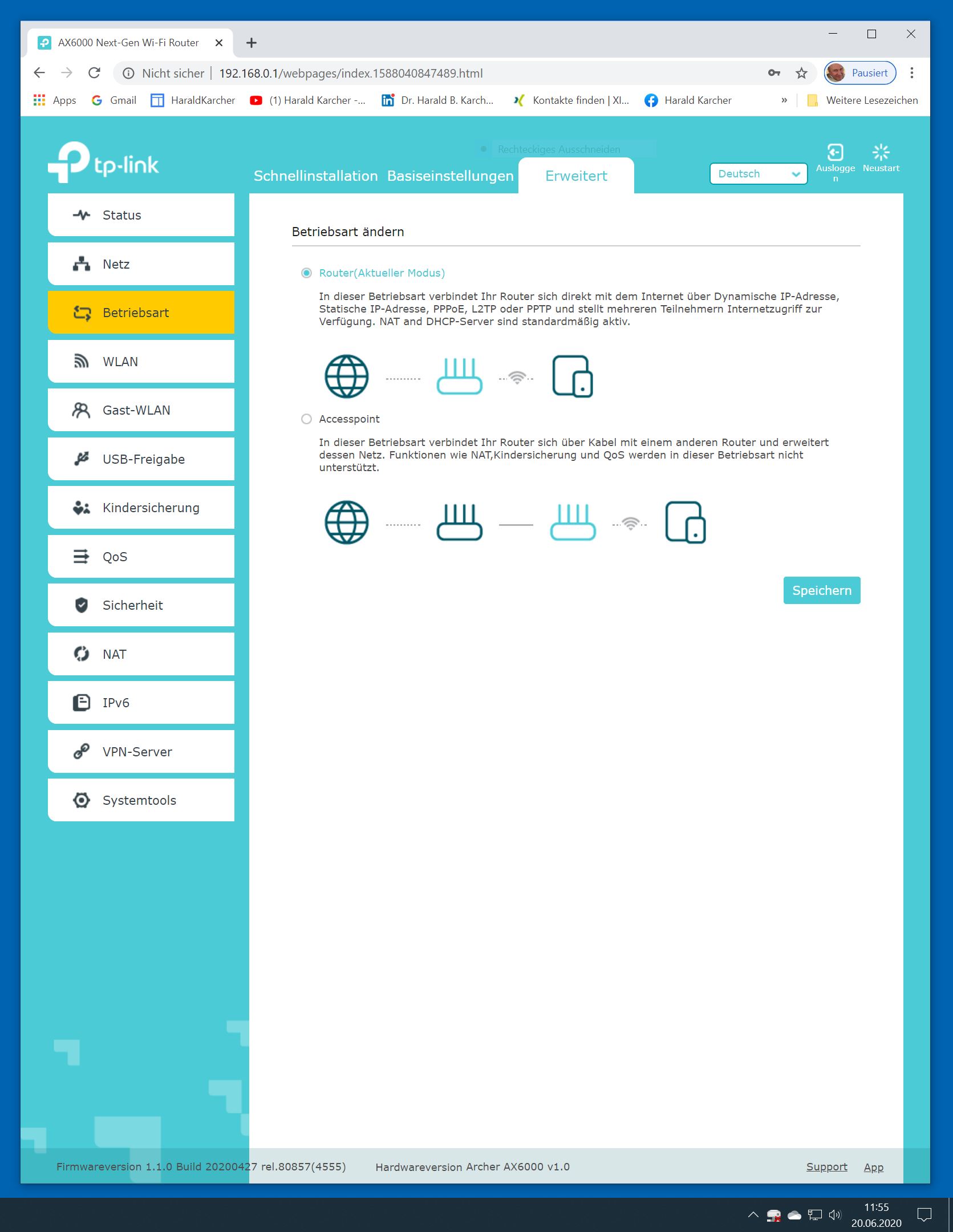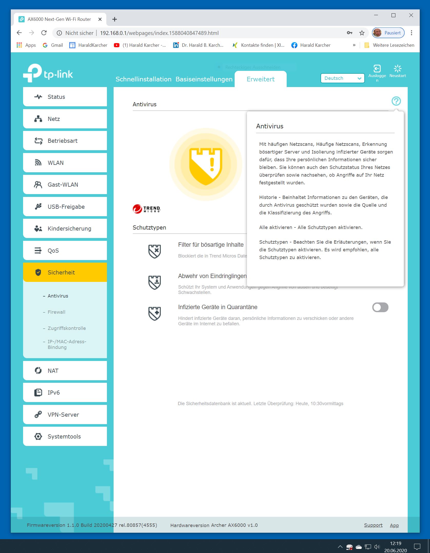 Der TP-Link Router Archer AX6000 lässt sich per Browser am Rechner oder per App am Smartphone einrichten. Via Browser stehen mehr Funktionen zur Verfügung als per Handy-App. Wir dokumentieren hier nur die Browser-Version. Über die aktuelle IP oder die URL http://tplinkwifi.net landen wir in der Konfiguration des Routers. Nach Umstellung von Englisch auf Deutsch bot er folgende Optionen: