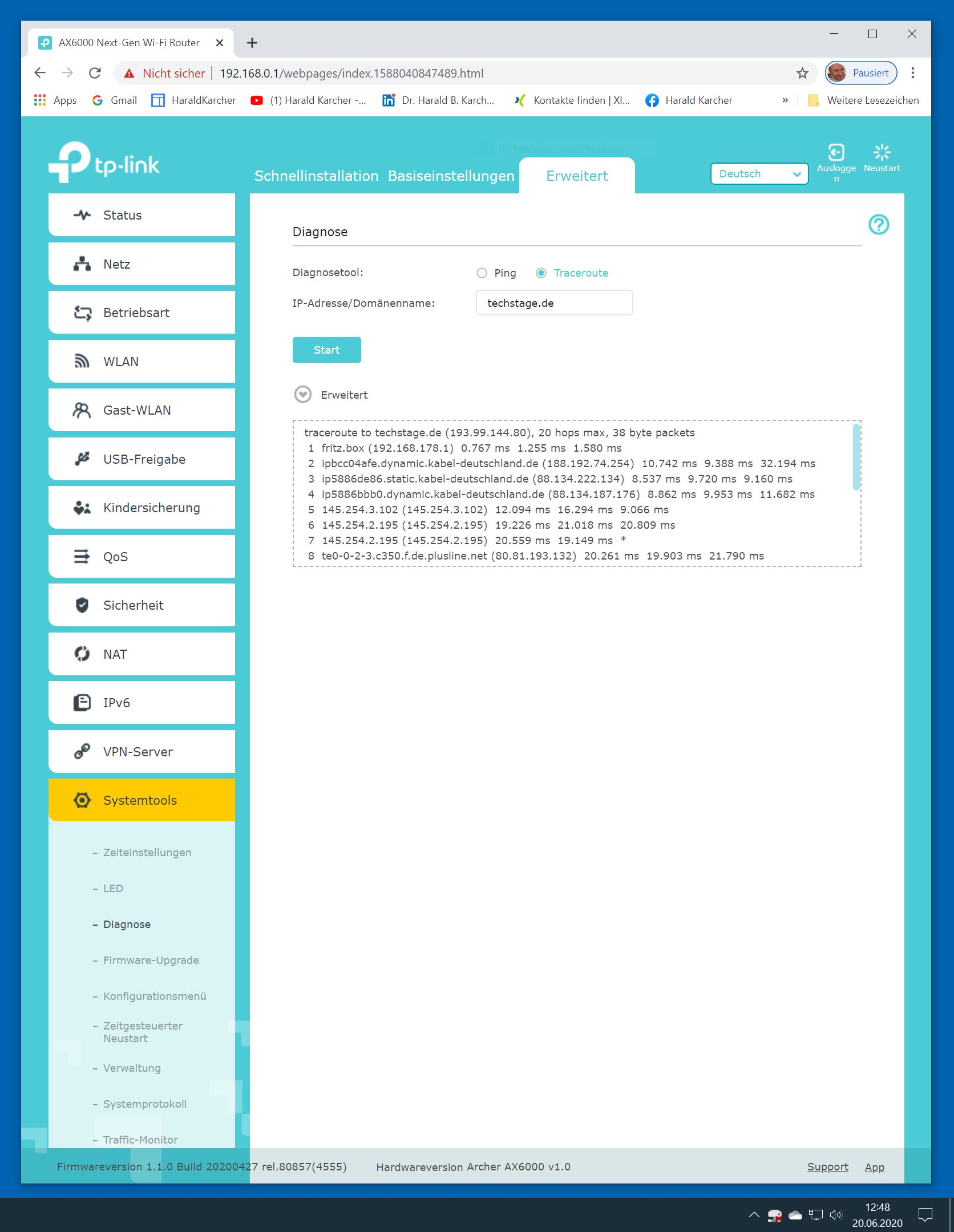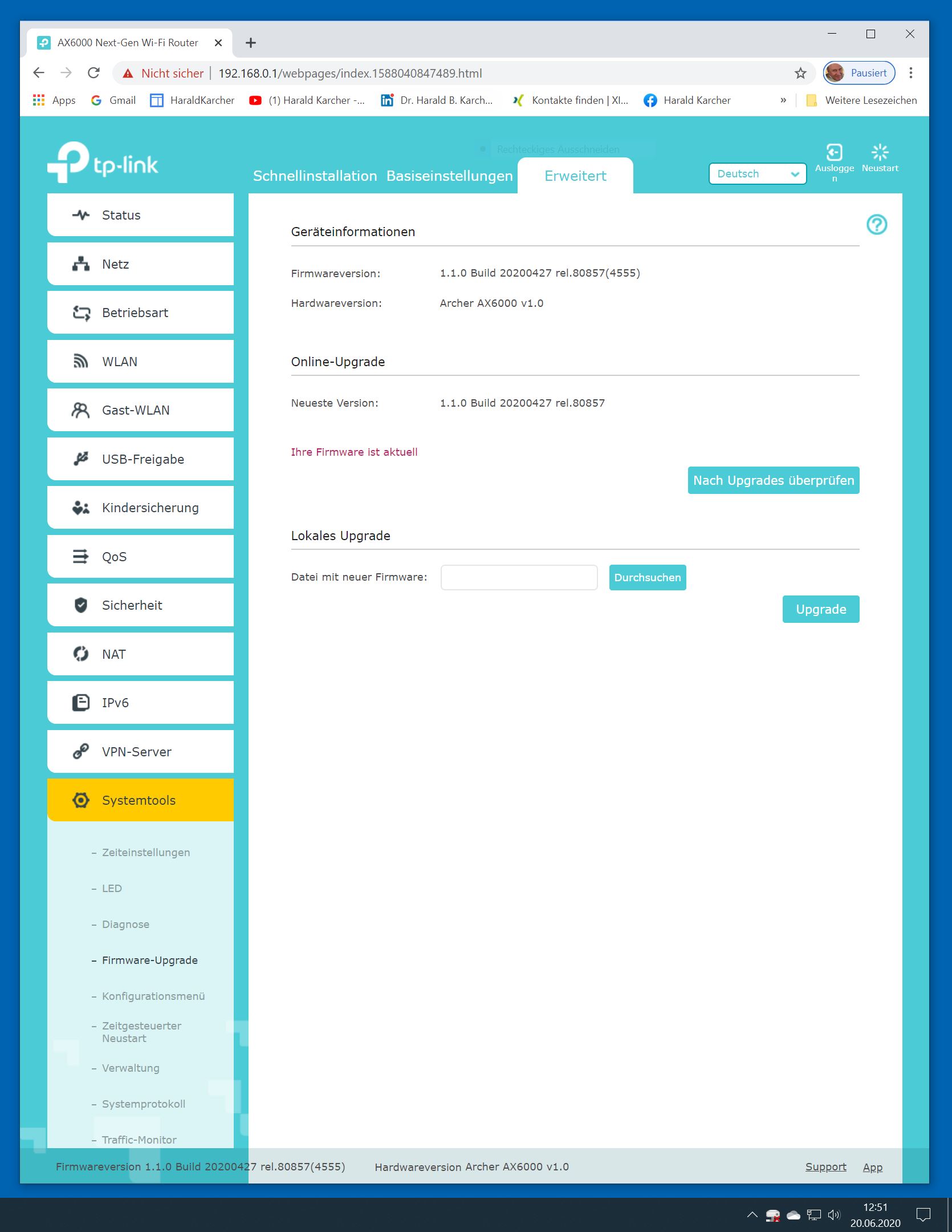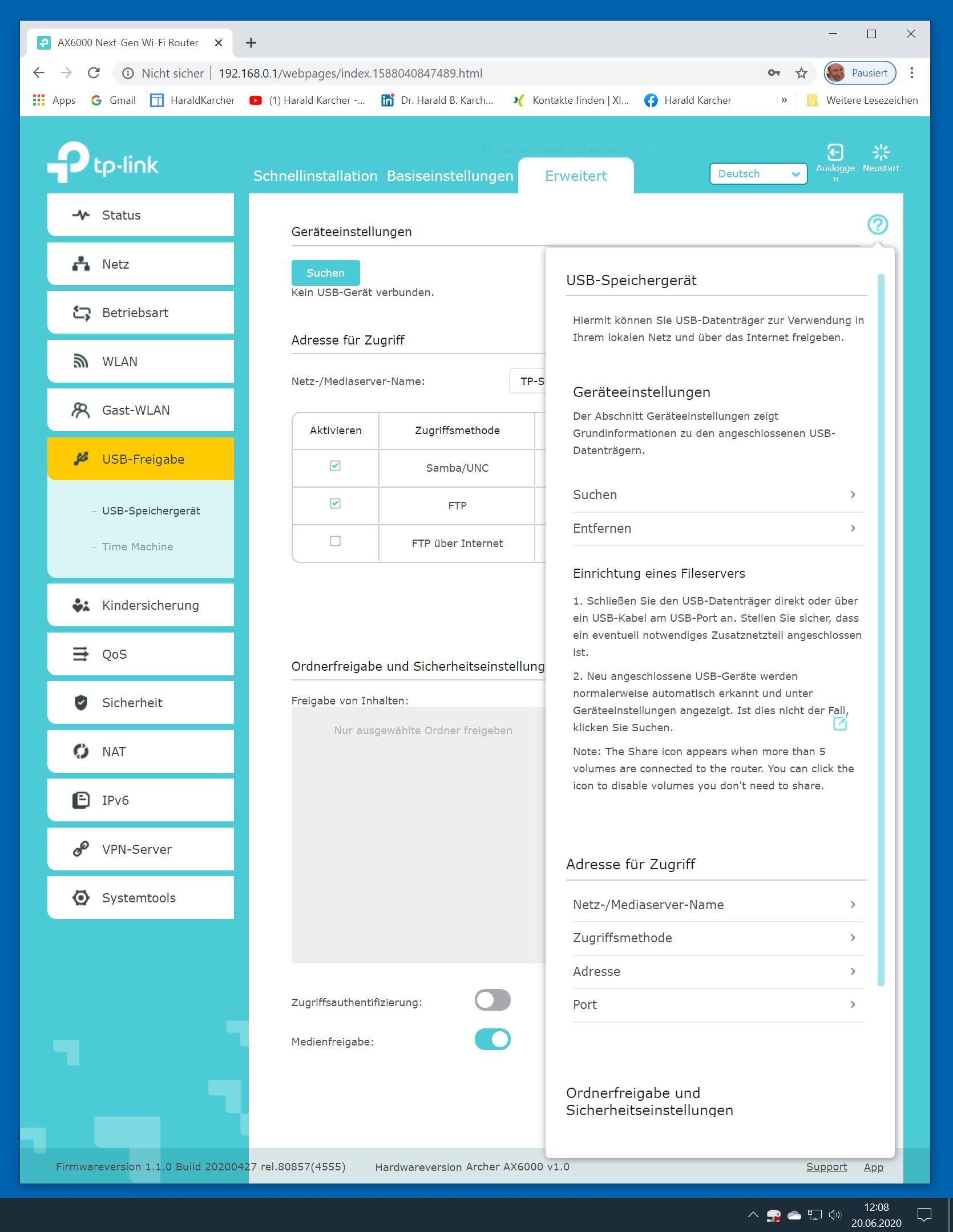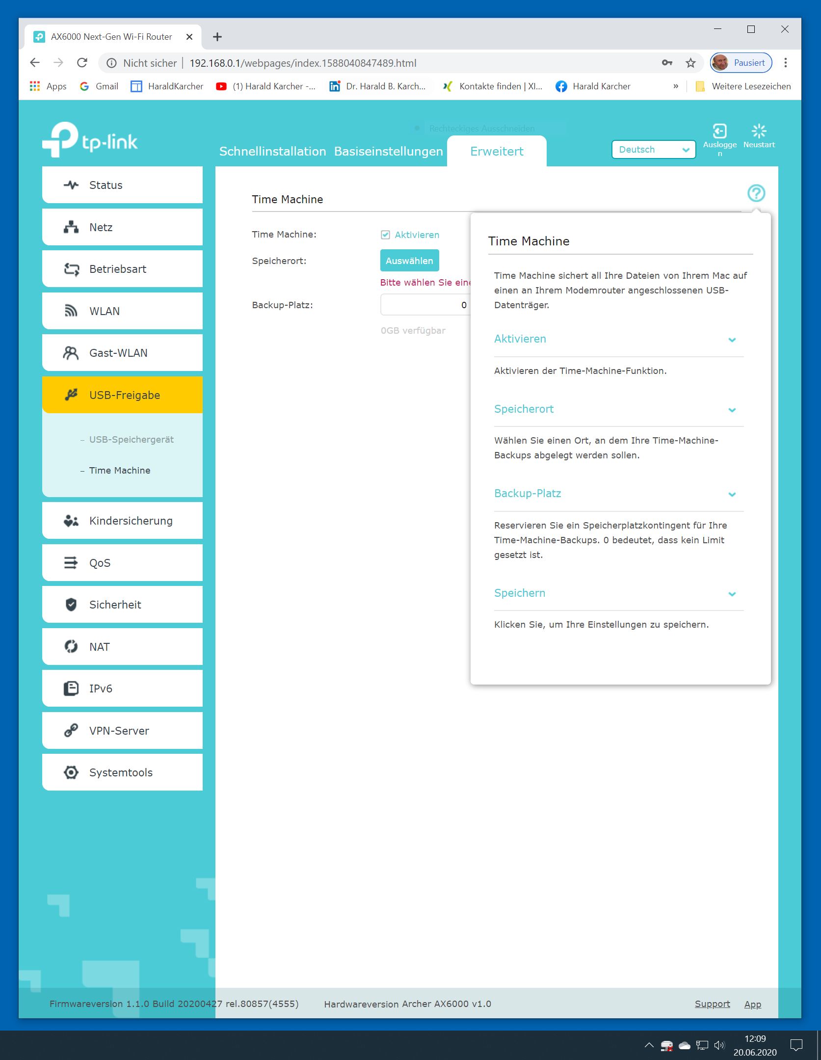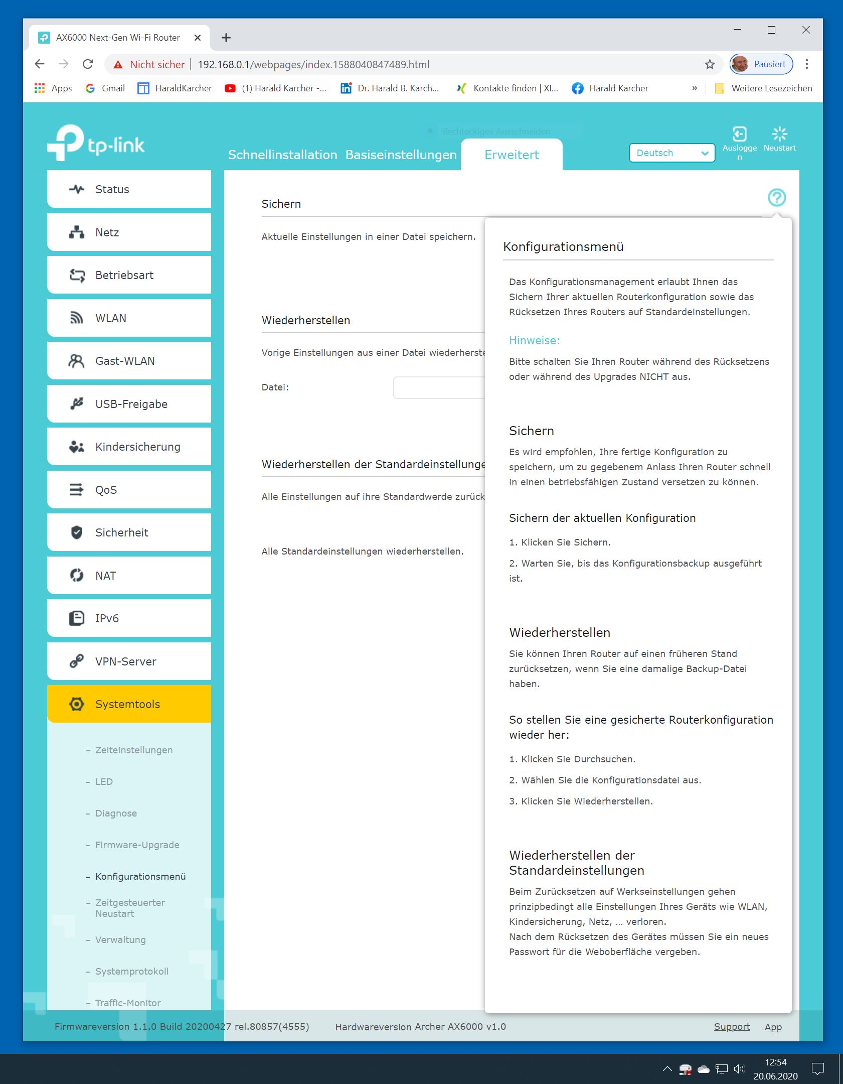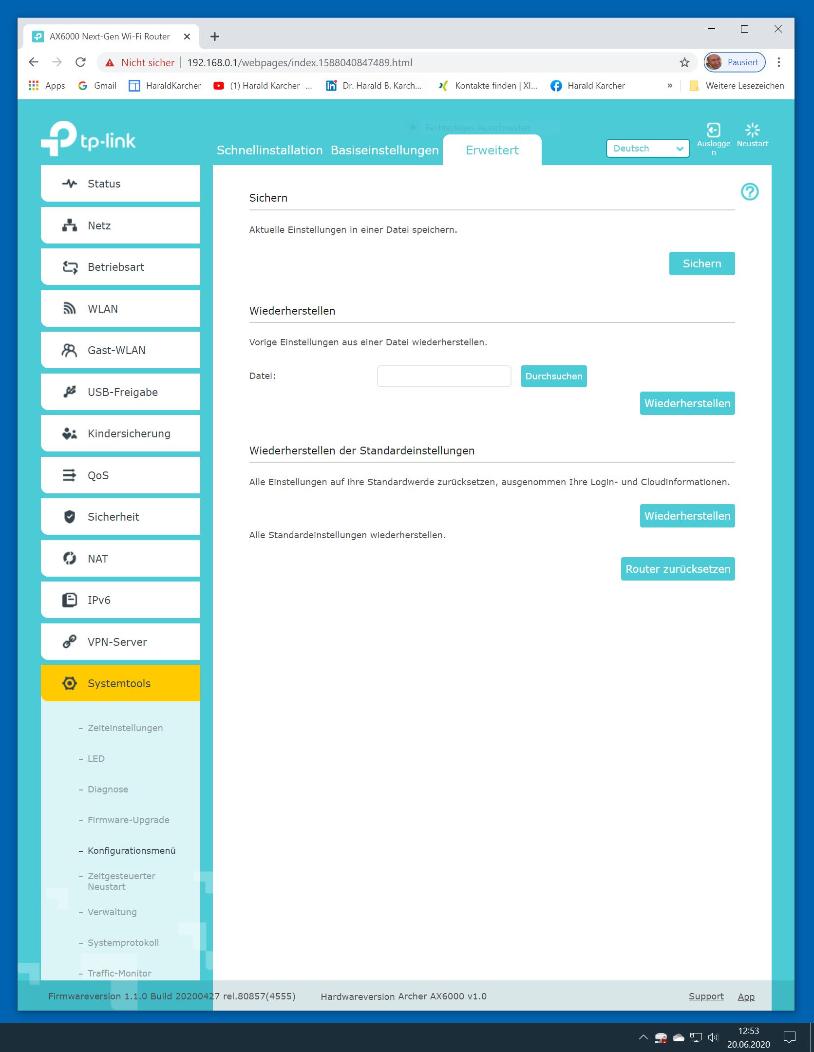 Der TP-Link Router Archer AX6000 lässt sich per Browser am Rechner oder per App am Smartphone einrichten. Via Browser stehen mehr Funktionen zur Verfügung als per Handy-App. Wir dokumentieren hier nur die Browser-Version. Über die aktuelle IP oder die URL http://tplinkwifi.net landen wir in der Konfiguration des Routers. Nach Umstellung von Englisch auf Deutsch bot er folgende Optionen: