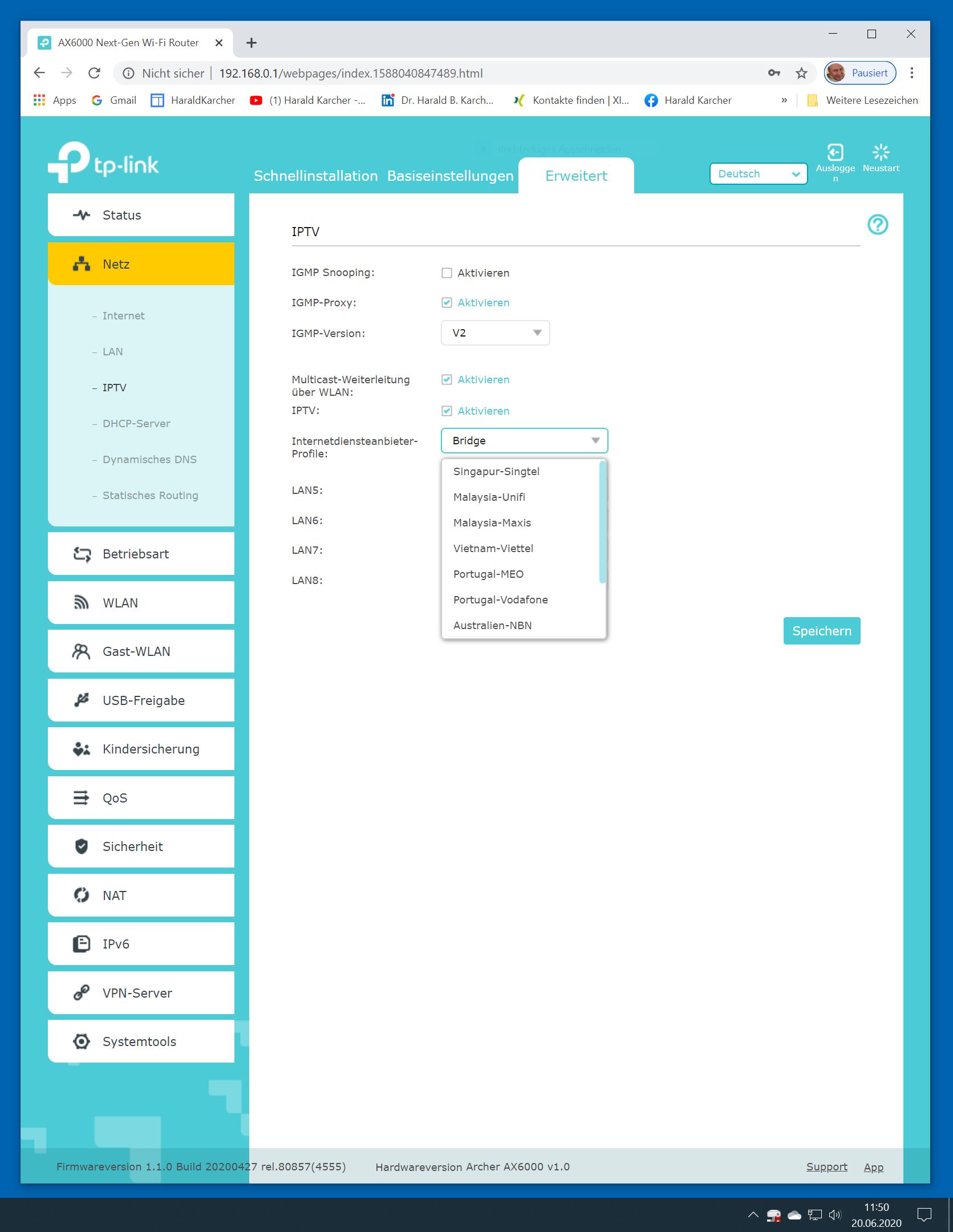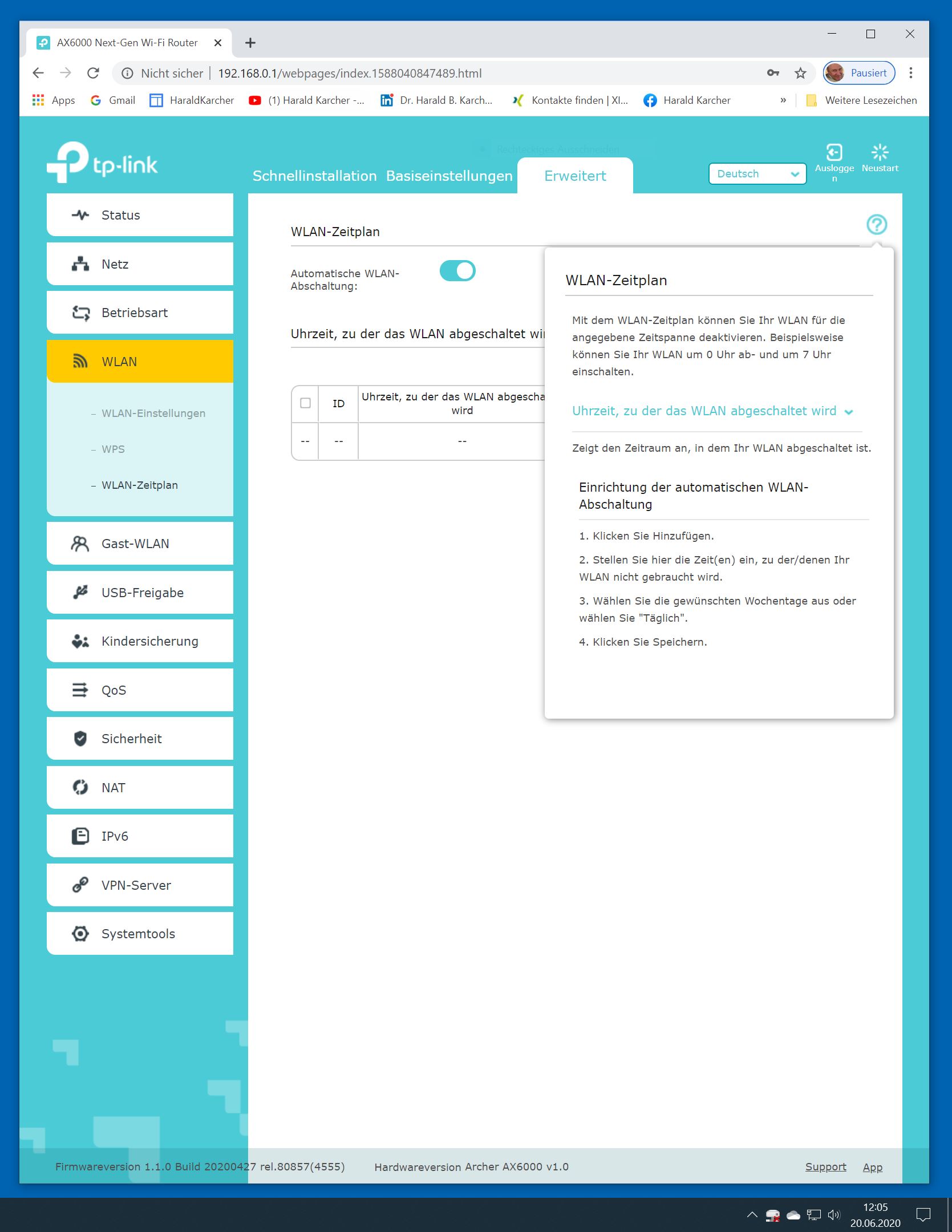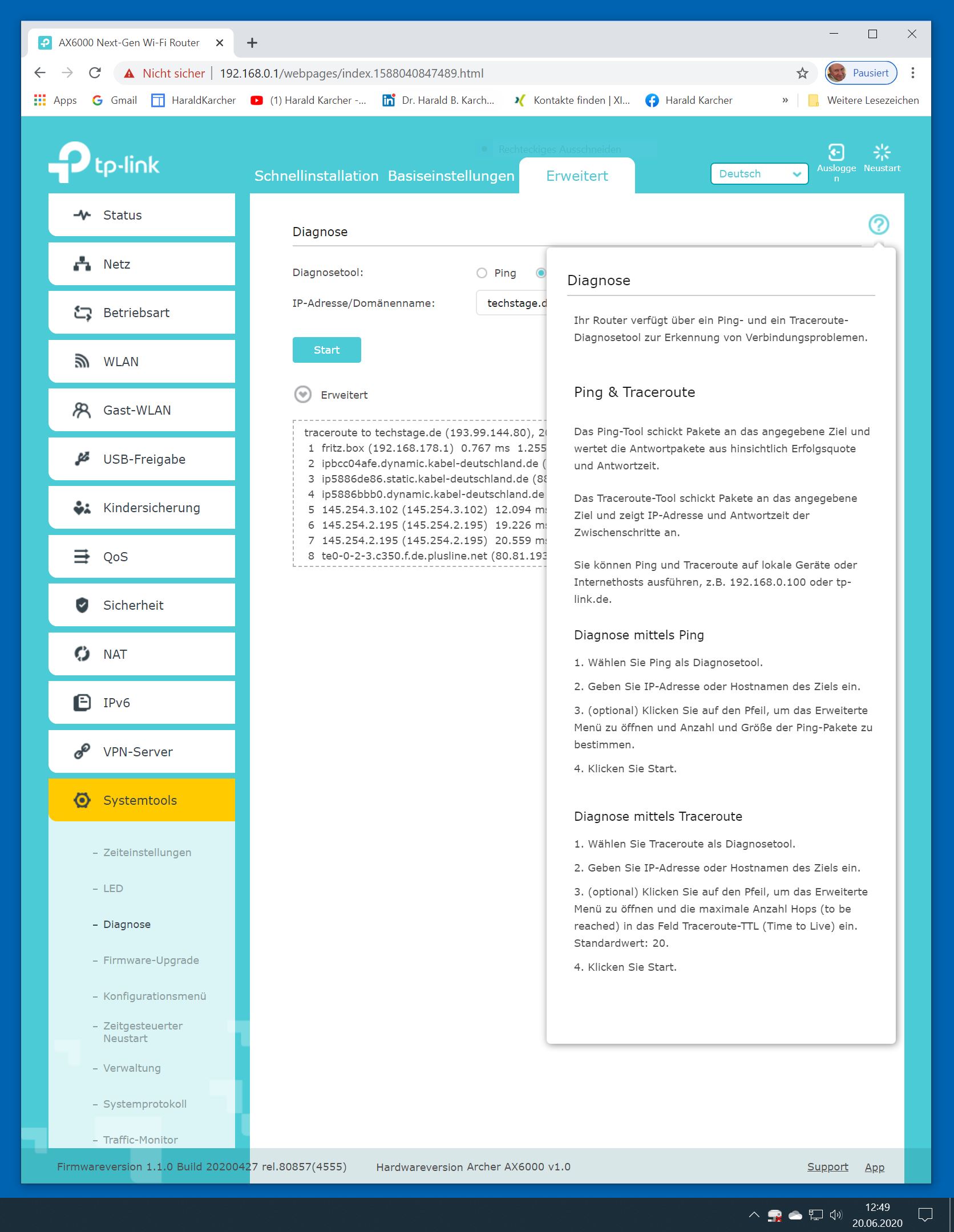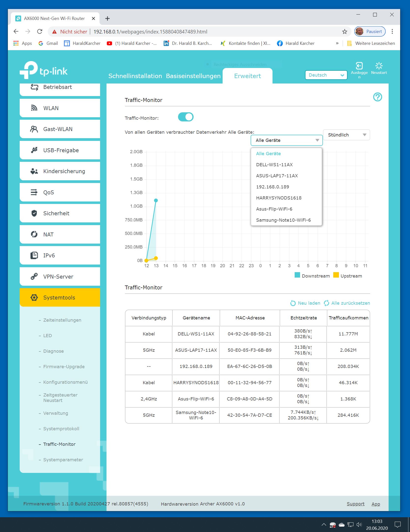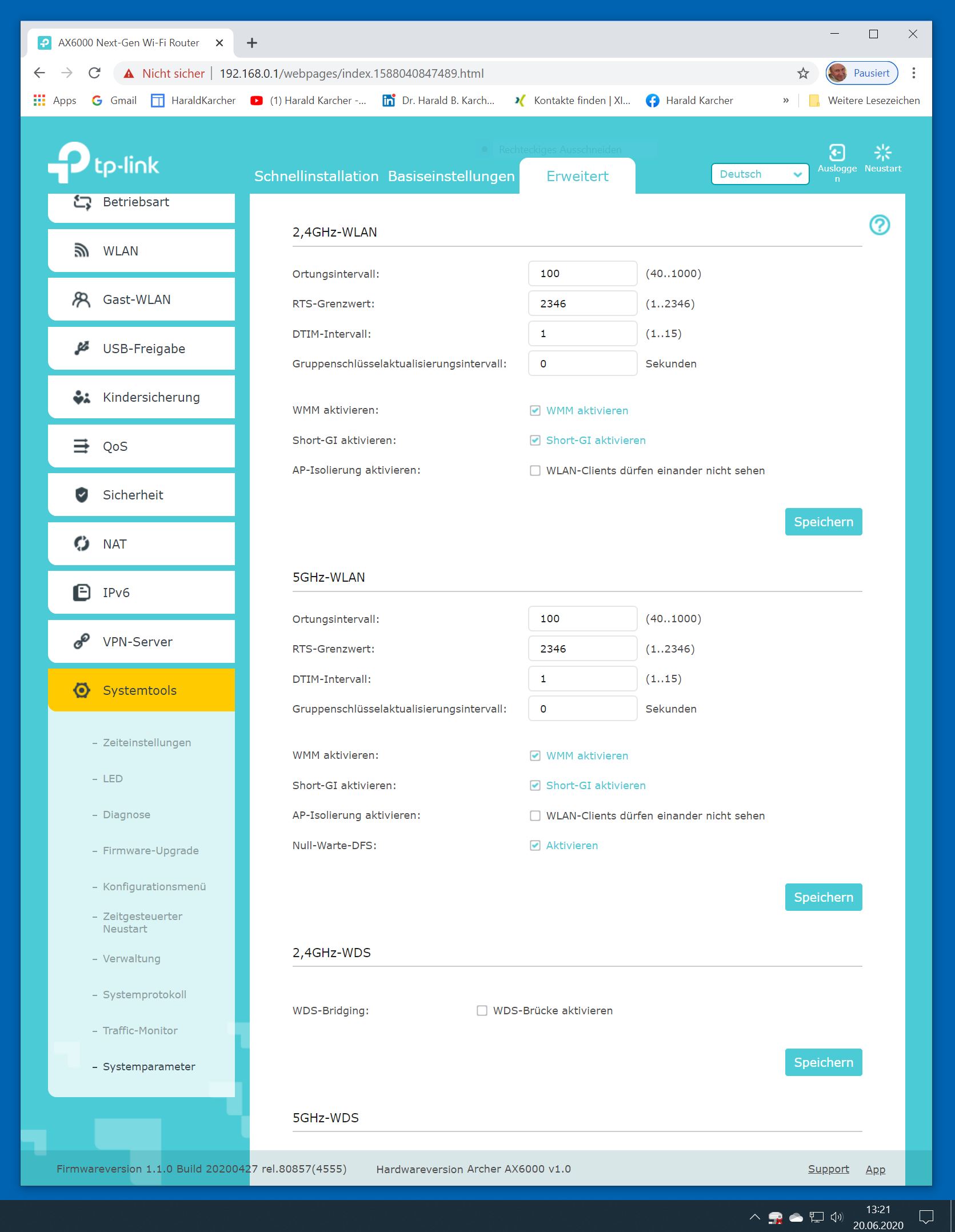 Der TP-Link Router Archer AX6000 lässt sich per Browser am Rechner oder per App am Smartphone einrichten. Via Browser stehen mehr Funktionen zur Verfügung als per Handy-App. Wir dokumentieren hier nur die Browser-Version. Über die aktuelle IP oder die URL http://tplinkwifi.net landen wir in der Konfiguration des Routers. Nach Umstellung von Englisch auf Deutsch bot er folgende Optionen: