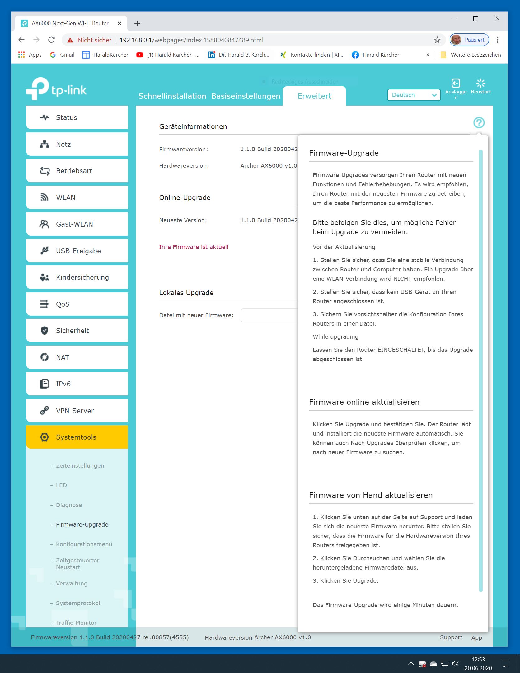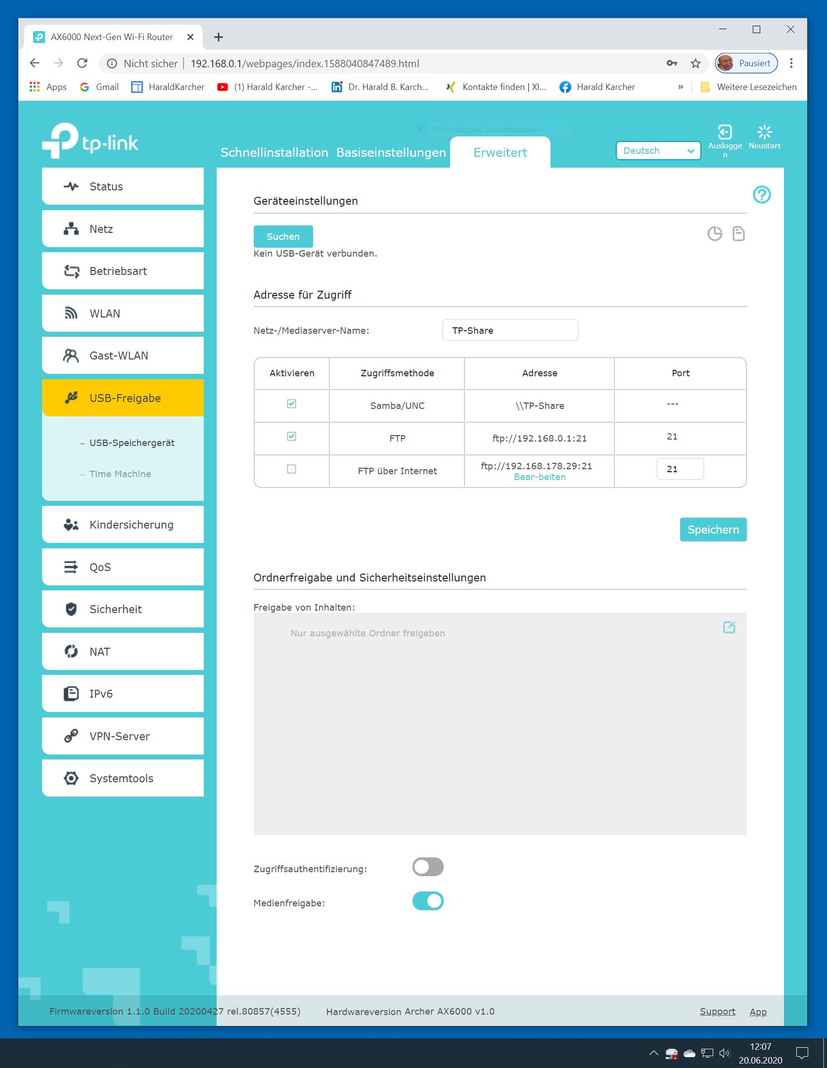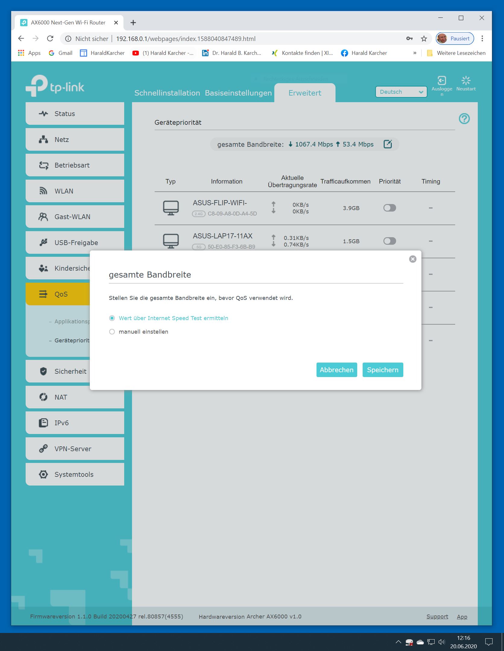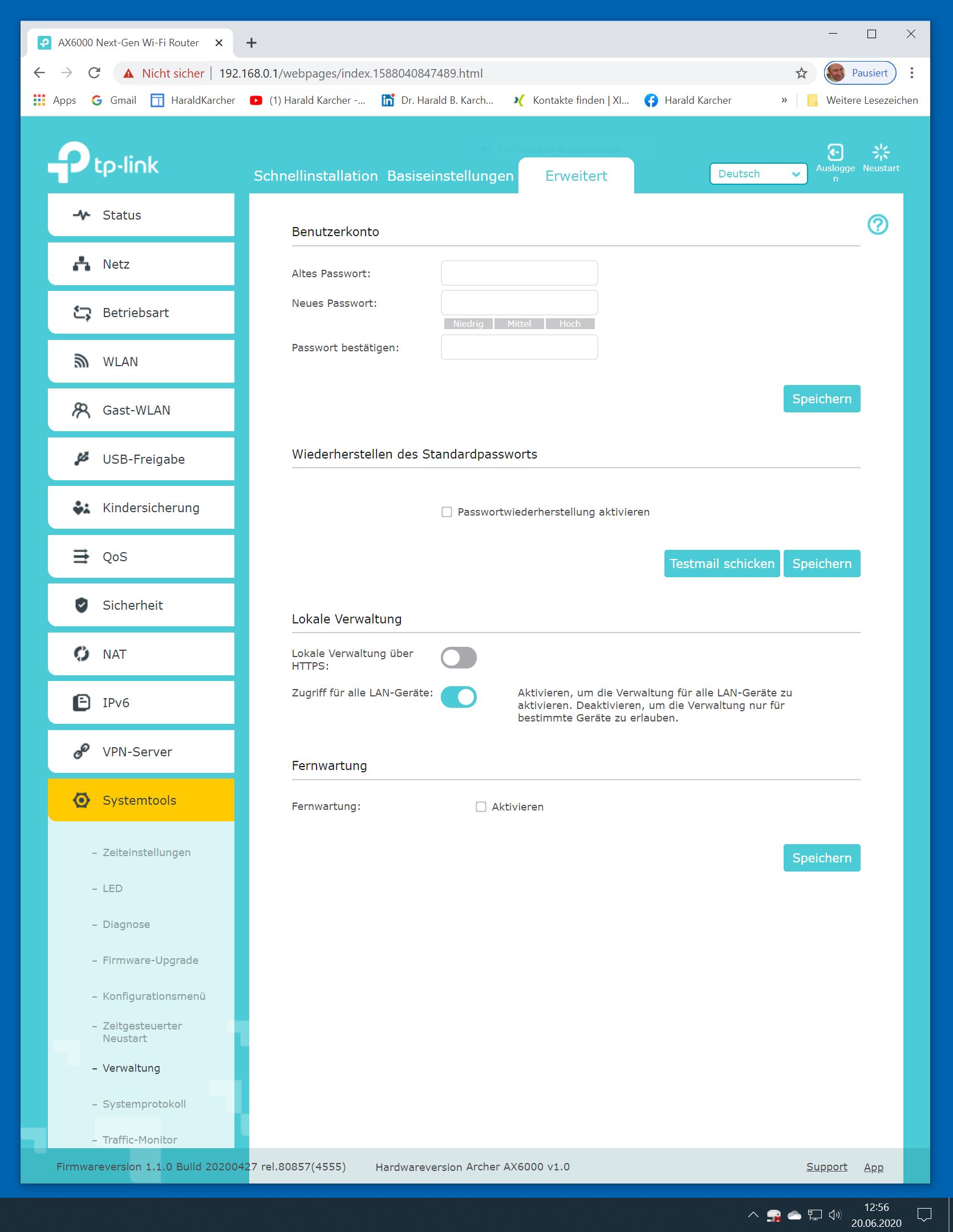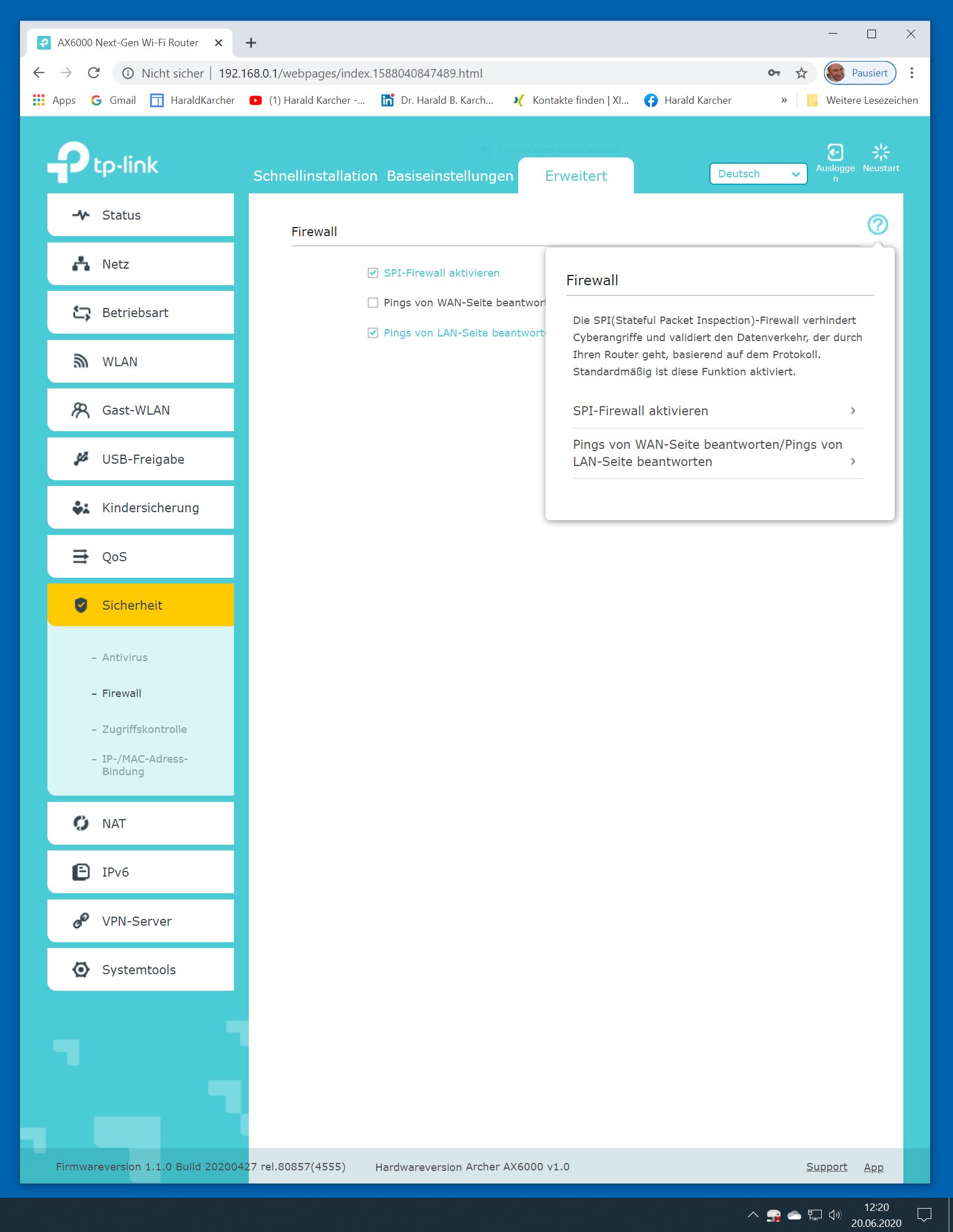 Der TP-Link Router Archer AX6000 lässt sich per Browser am Rechner oder per App am Smartphone einrichten. Via Browser stehen mehr Funktionen zur Verfügung als per Handy-App. Wir dokumentieren hier nur die Browser-Version. Über die aktuelle IP oder die URL http://tplinkwifi.net landen wir in der Konfiguration des Routers. Nach Umstellung von Englisch auf Deutsch bot er folgende Optionen: