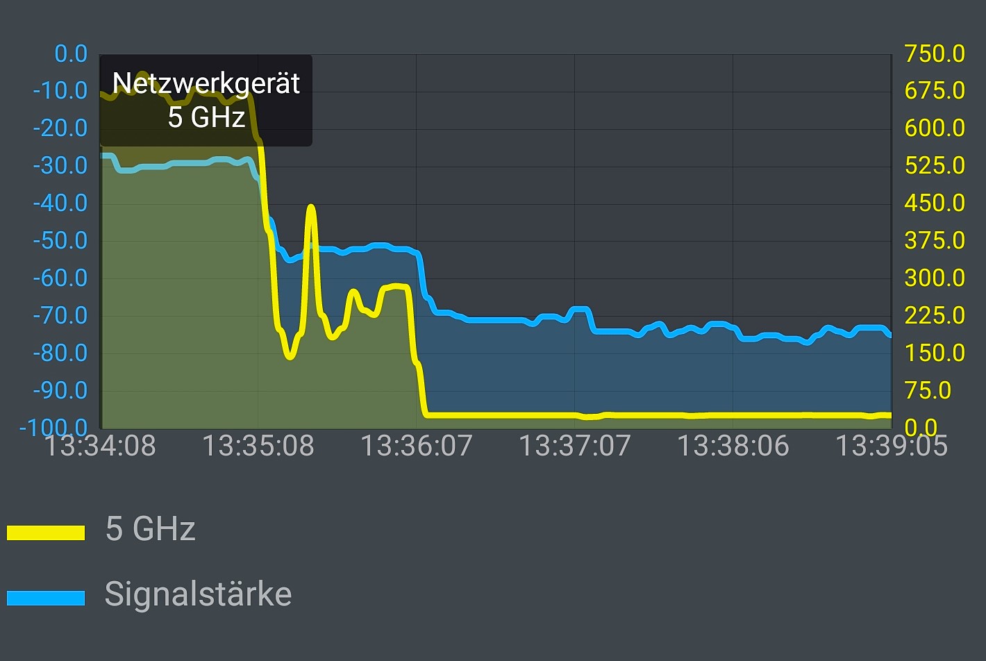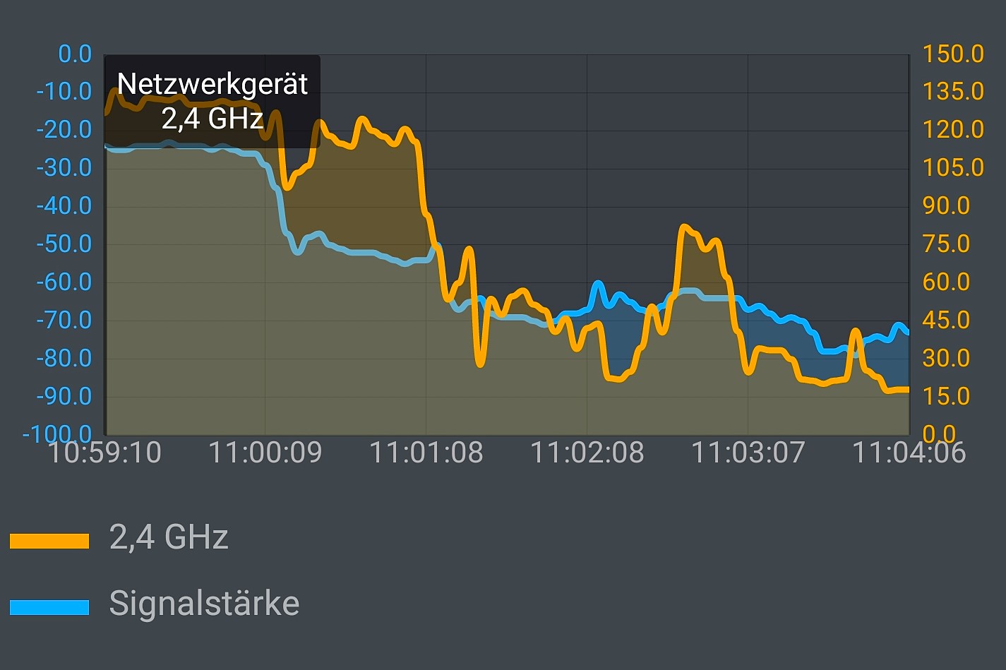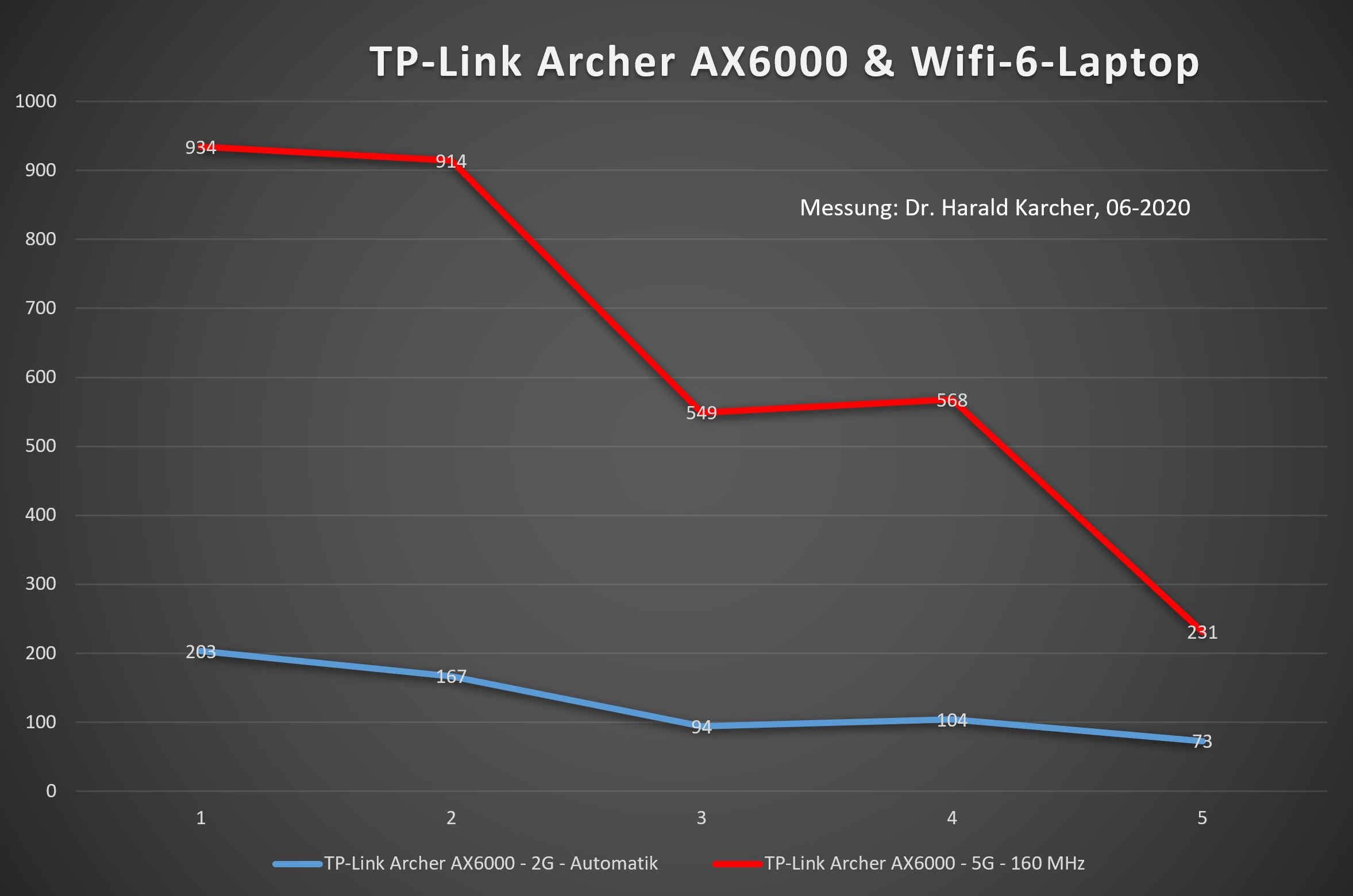 Bei der blauen Kurve der folgenden Grafik war der Laptop im 2,4-GHz-Band mit dem Archer verbunden. 203 MBit/s im gleichen Raume wie der Router und 73 MBit/s im hintersten Zimmer sind zwar Lichtjahre vom offiziellen Marketing entfernt, markieren aber trotzdem eine passable Reichweite.