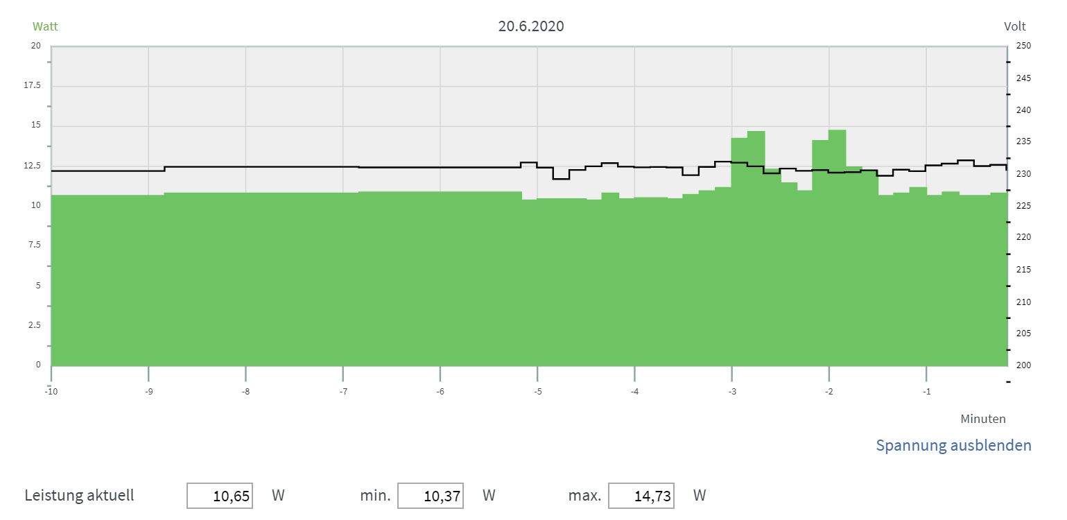 Bei der folgenden Stromkurve waren alle Geräte mit dem Archer AX6000 Router verbunden, die in der Testwohnungsgrafik oben eingezeichnet sind: Sprich 10-Gig-NAS und Kabel-Modem per LAN-Kabel, dazu Samsung-Handy und Asus-Laptop via Wifi-6-Funk. Im Standby gingen die Stromwerte bis 10,37 Watt herunter. Bei aktiven Downloads großer Dateien auf Handy und Laptop gleichzeitig zog der Wifi-6-Router bis zu 14,73 Watt aus der 230-Volt-Dose.