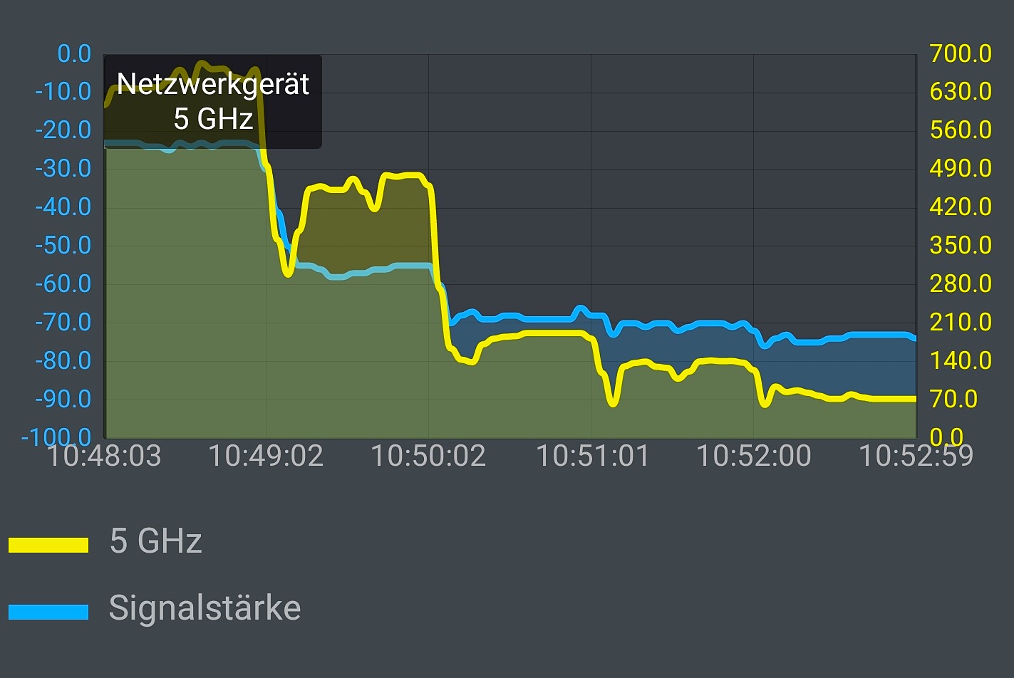 Die nächste Messreihe absolvieren wir mit dem WiFi-6-Smartphone Samsung Galaxy Note10+. Es funkt maximal 1200 MBit/s Wifi-6, kann aber ebenfalls auf die älteren WLAN-Gattungen zurückschalten. Bei der ersten 5GHz-Messung war das Note+ mit dem Wifi-6-Router im Automatikmodus verbunden. Damit ergab sich eine relativ normale, stetig abfallende Durchsatzkurve: Im ersten Zimmer knapp 700 MBit/s, im letzten um die 70 MBit/s.
